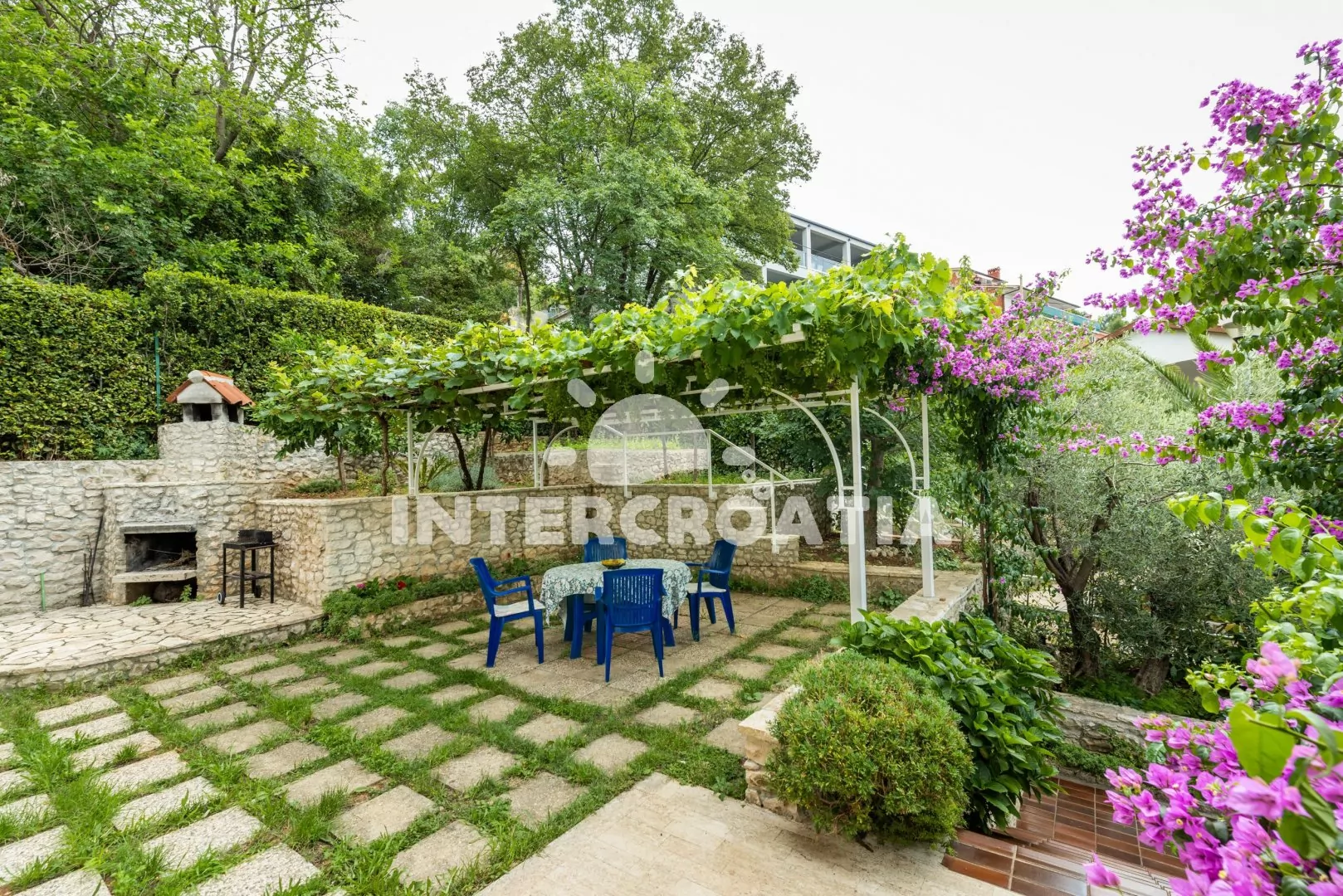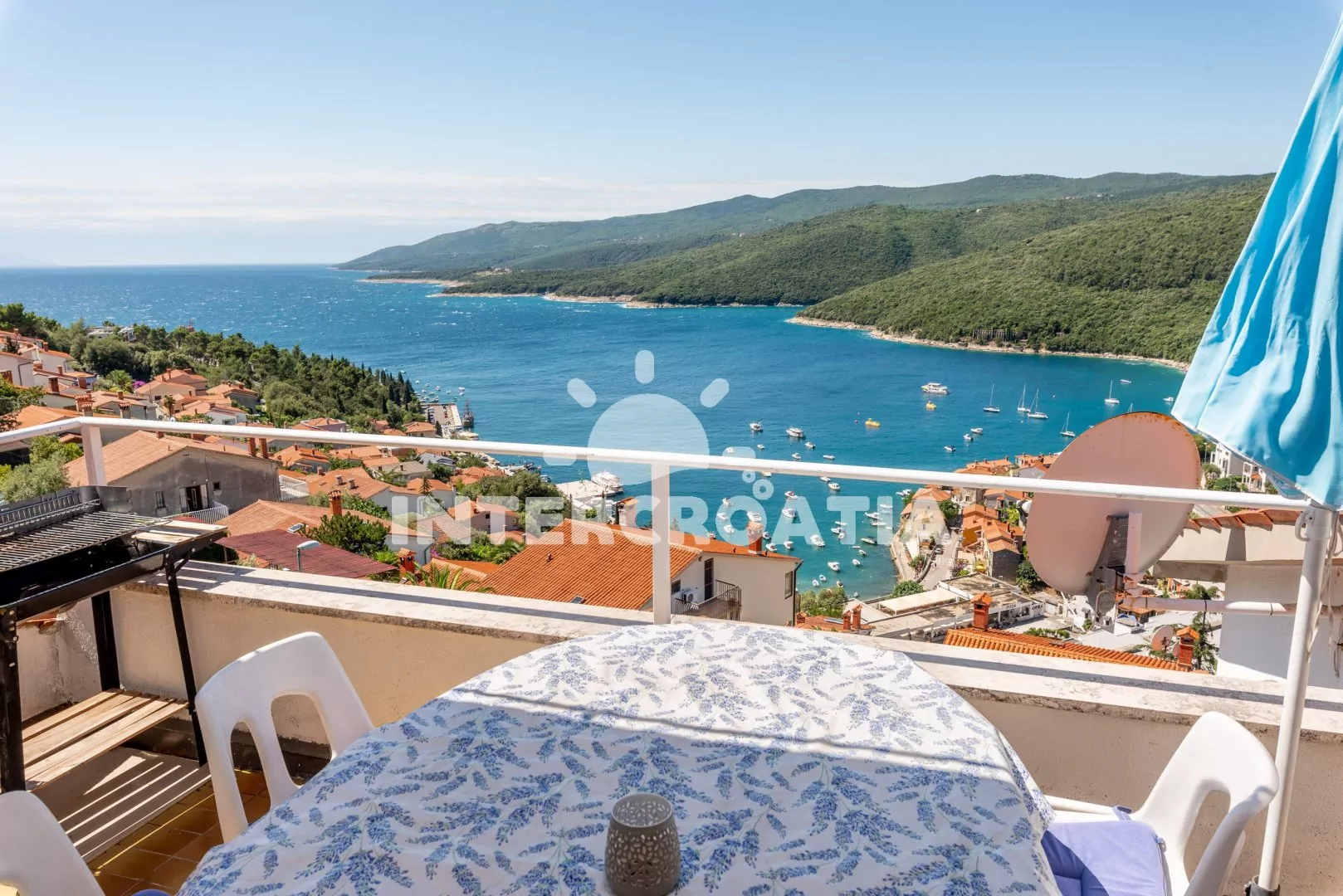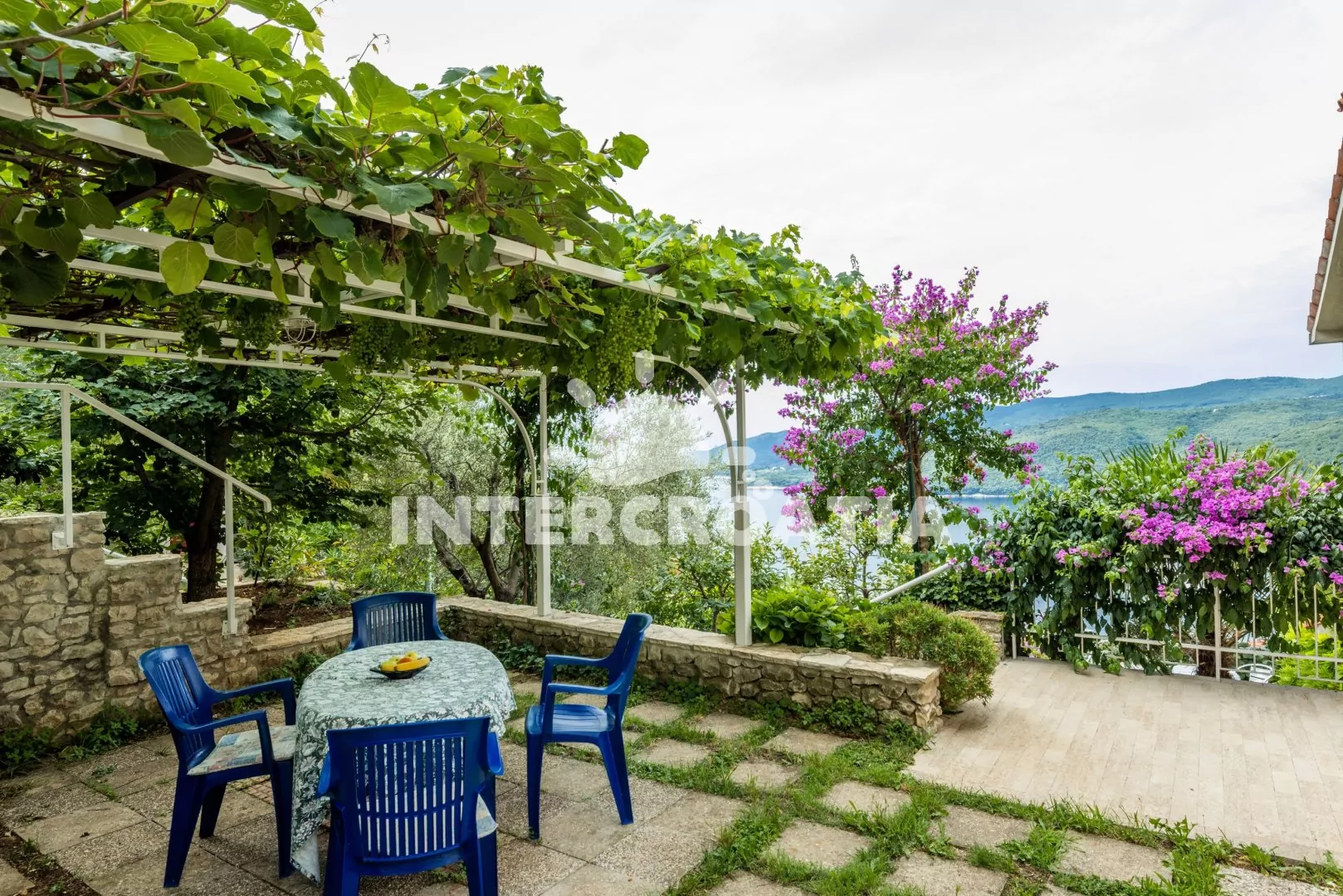 Vilka s upravenou kaskádovitou zahradou, terasou s venkovním posezením a grilem nabízí jedinečný výhled na moře. Příjemné prostředí v klidné ulici a s vlastními parkovacími místy přímo u vily.