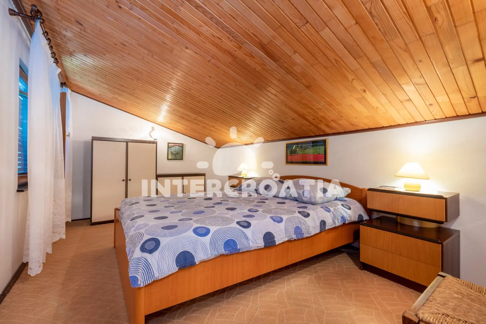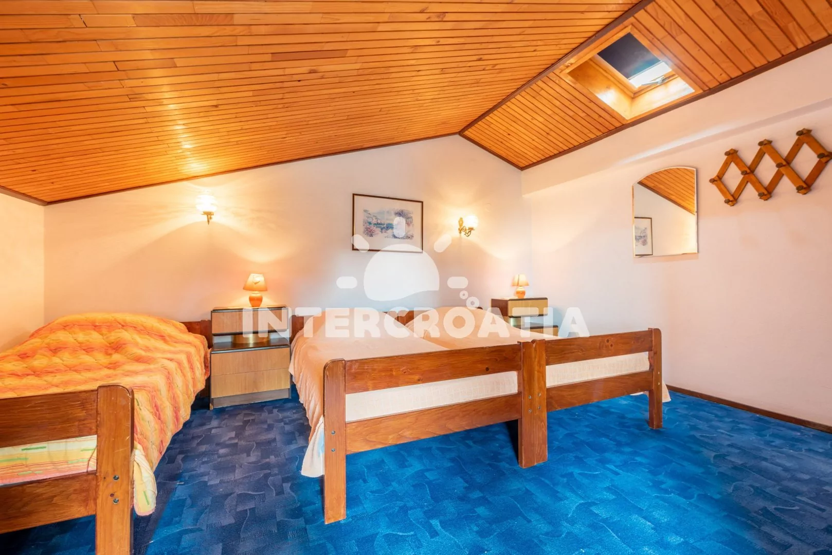 Podkrovní apartmán (62 m2) s terasou a výhledem na moře je vhodný pro 4 až 5 osob. Obývací pokoj je spojený s kuchyní. Kuchyňská linka je vybavena sporákem, digestoří, troubou, kávovarem, rychlovarnou konvicí, toustovačem, nádobím a lednicí s mrazákem. Obývací pokoj s jídelním stolem pro 5 osob, pohovkou a televizí se satelitním programem. První ložnice s jedním dvoulůžkem. Druhá ložnice s dvoulůžkem, jedním jednolůžkem a vstupem na terasu. Koupelna se sprchovým koutem, umyvadlem, fénem a wc. Hostům je k dispozici parkování u objektu zdarma.