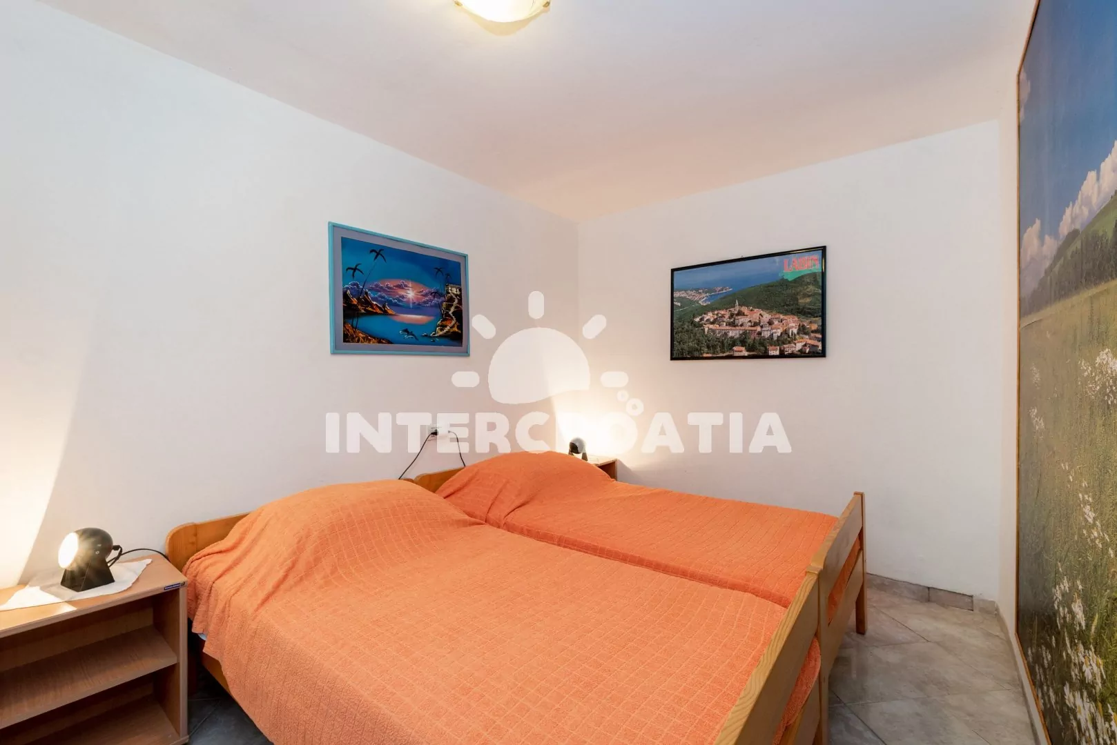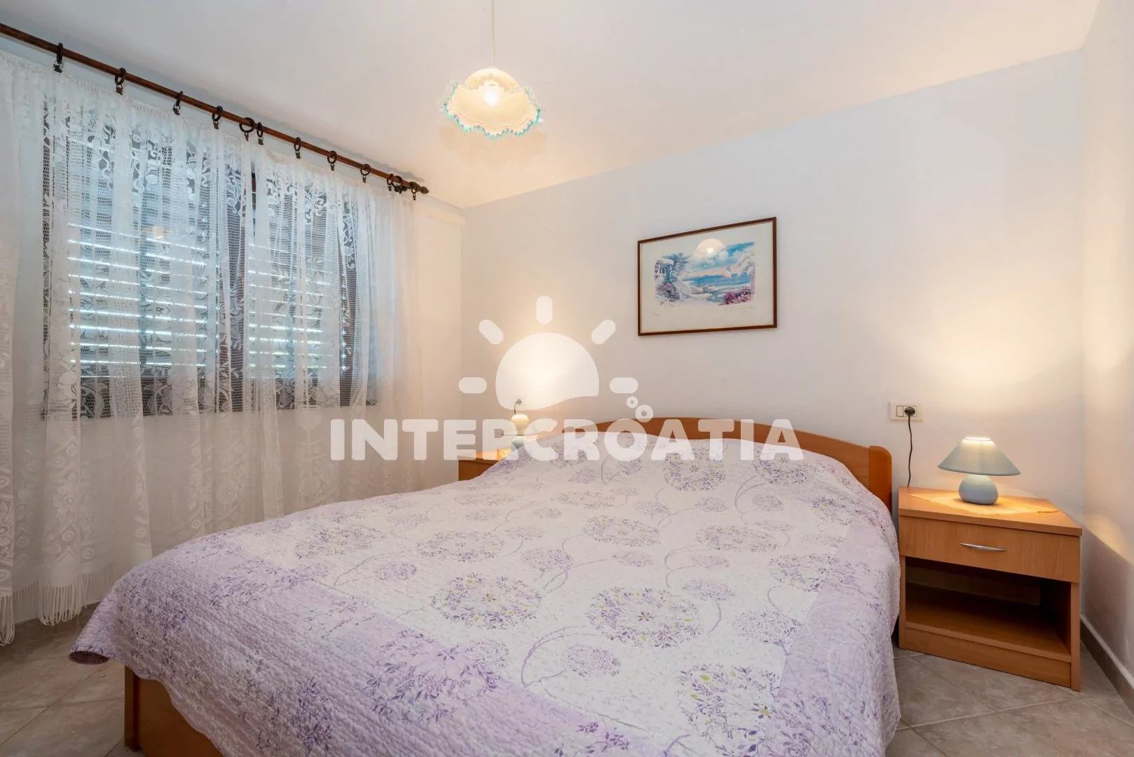 Apartmán s vlastní terasou a výhledem na moře se nachází v suterénu vily a je vhodný pro 4 osoby. Obývací místnost je spojena s kuchyní. Kuchyňská linka je vybavena dvouplotýnkovým sporákem, digestoří, kávovarem, rychlovarnou konvicí, toustovačem, nádobím a lednicí s mrazákem. Obývací místnost s jídelním stolem pro 4 osoby, televizí se satelitním programem, klimatizací a vstupem na terasu. První i druhá ložnice je vybavena vždy s jedním dvoulůžkem. Koupelna se sprchovým koutem, umyvadlem, fénem a wc. Hostům je k dispozici parkování u objektu zdarma.