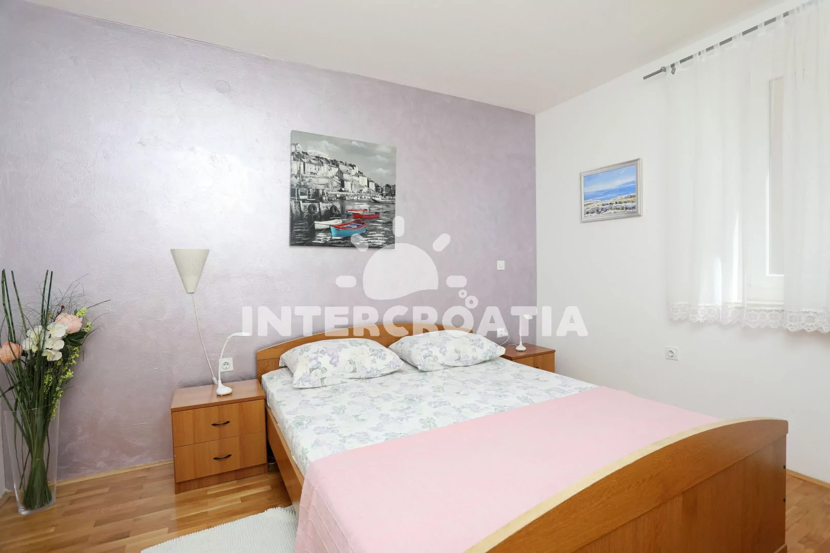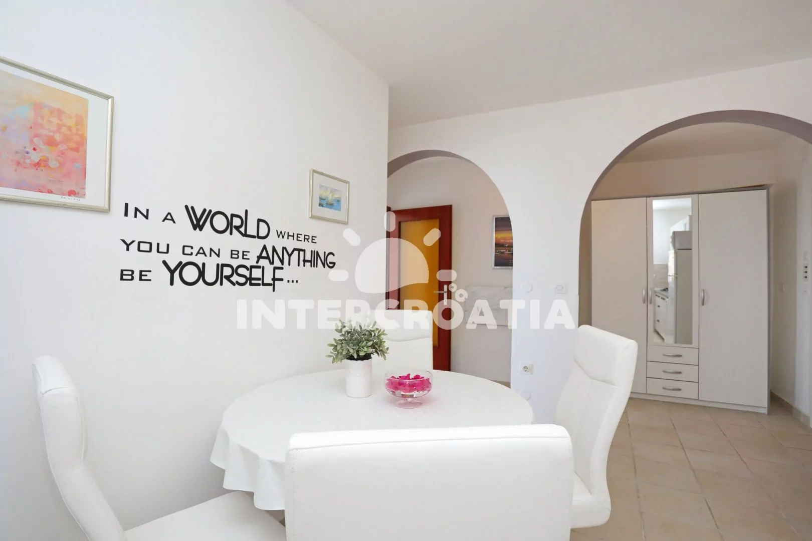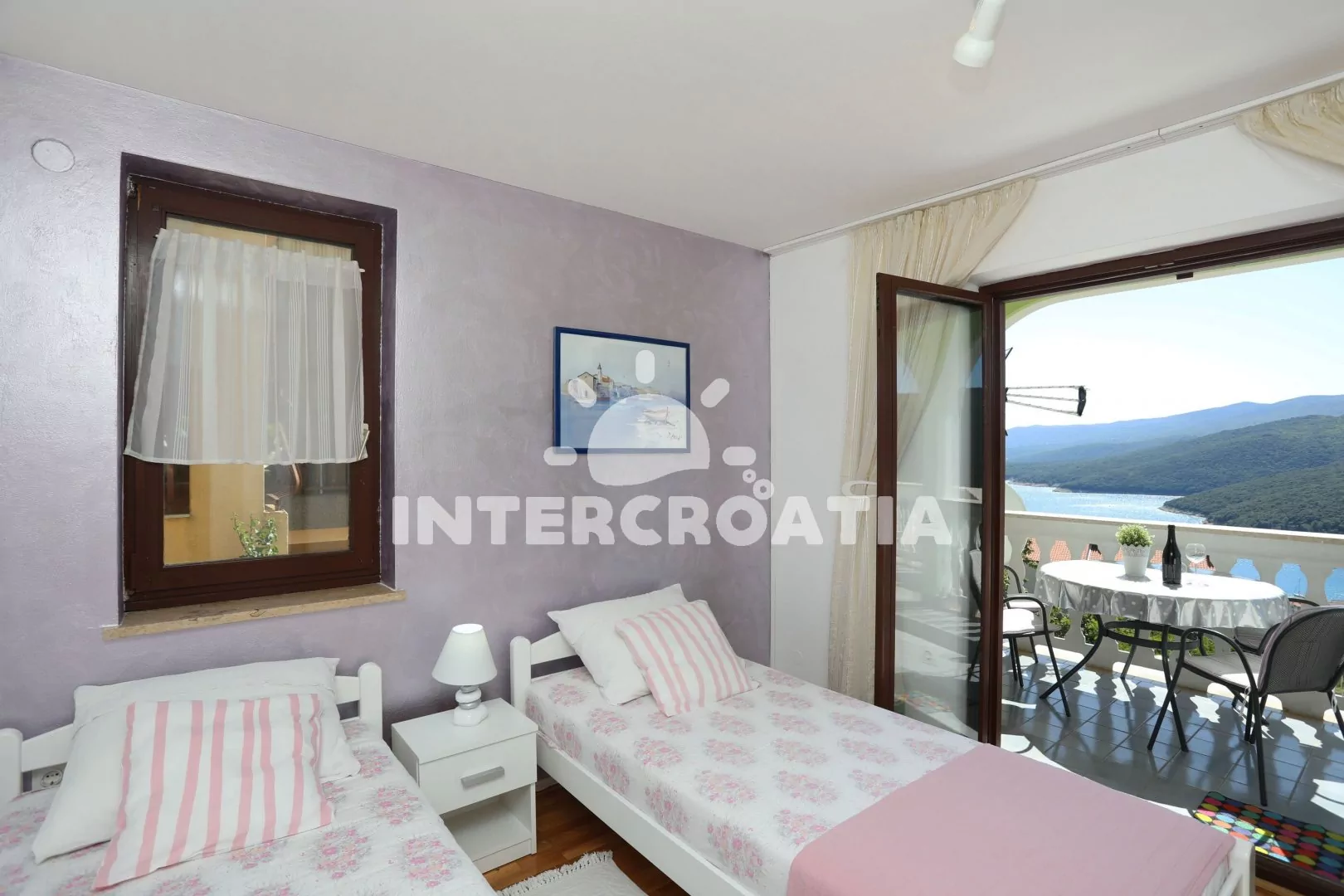 Apartmán (60 m2) s terasou a výhledem na moře se nachází v 1. patře domu a je vhodný pro 4 až 5 osob. Obývací místnost je spojena s kuchyní. Kuchyňská linka je vybavena, digestoří, myčkou na nádobí, mikrovlnnou troubou, kávovarem, nádobím a lednicí s mrazákem. Obývací místnost s jídelním stolem pro 4 osoby, televizí se satelitním programem a klimatizací. První ložnice s dvoulůžkem, přistýlkou a vstupem na terasu. Druhá ložnice s dvoulůžkem. Koupelna s vanou, umyvadlem a wc. Hostům je k dispozici parkování u objektu zdarma.