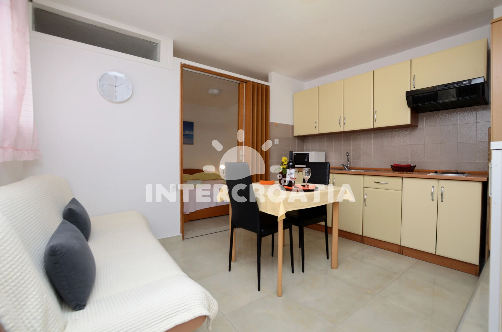 Apartmán (22 m2) typu studio s terasou, a výhledem na moře. Nachází se v přízemí objektu. Kuchyňská linka je vybavena varnou deskou, kávovarem, toustovačem, mikrovlnnou troubou, rychlovarnou konvicí,…