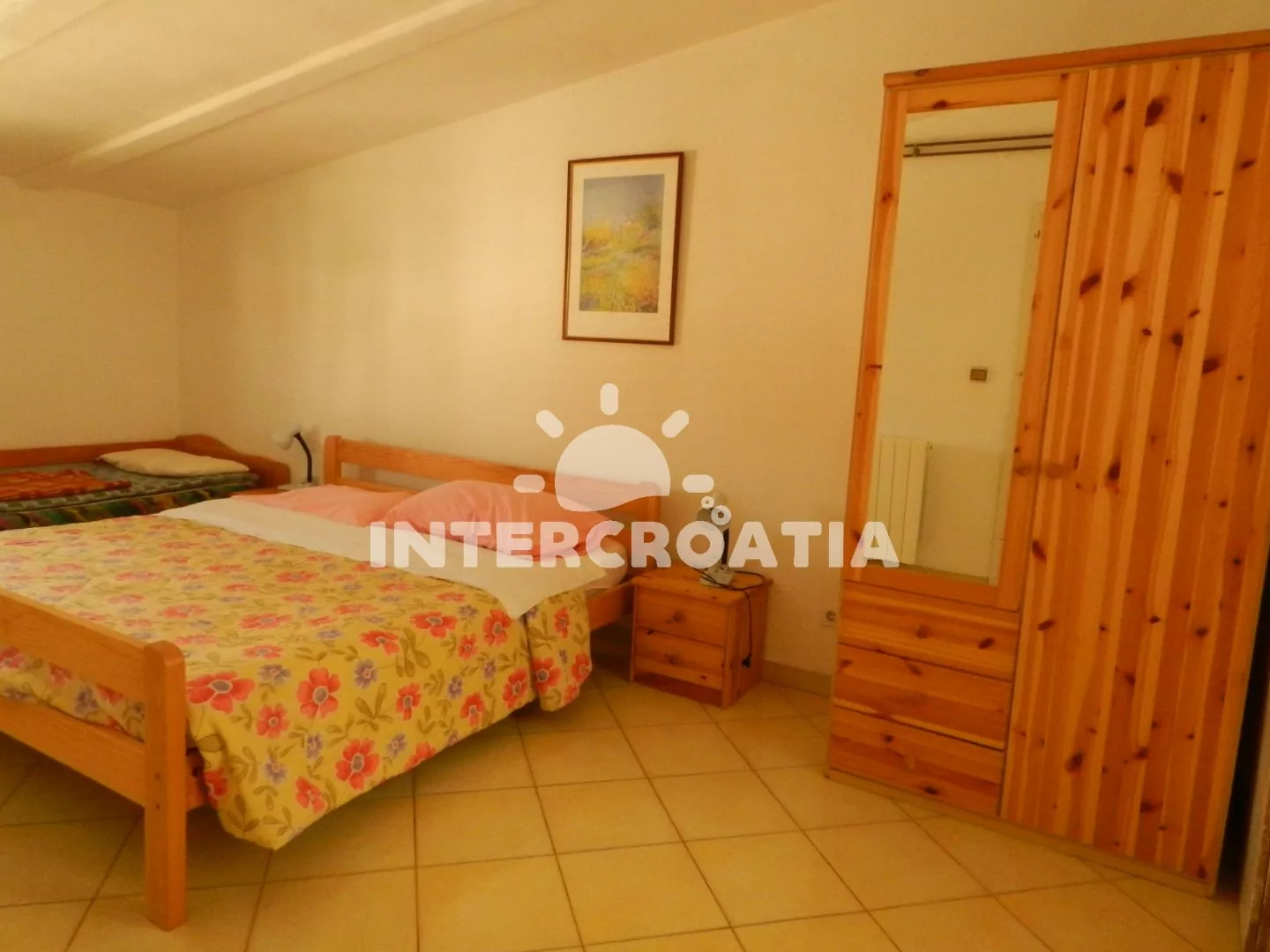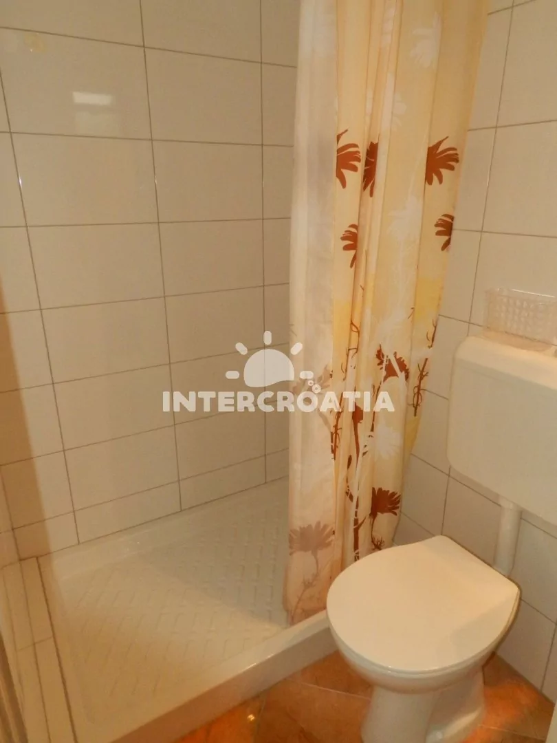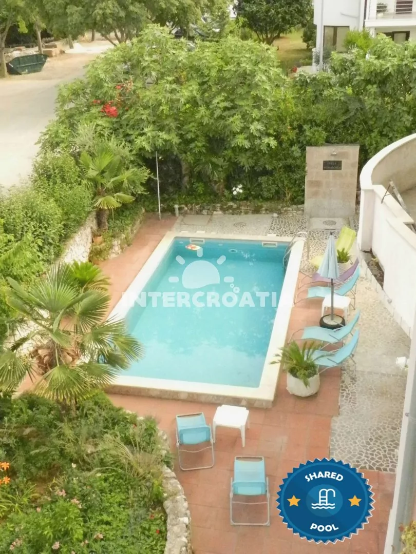 Apartmán (50 m2) s balkonem a venkovním posezením se nachází ve 2. patře domu. Apartmán má 2 ložnice a je vhodný pro 4 až 5 osob. Obývací pokoj je spojený s kuchyní. Kuchyňská linka je vybavena varnou deskou, digestoří, troubou, rychlovarnou konvicí, mikrovlnnou troubou, toustovačem, kávovarem, nádobím a lednicí s mrazákem. Obývací pokoj s jídelním stolem, pohovkou, televizí se satelitním programem a klimatizací. První ložnice s dvoulůžkem a jednolůžkem. Druhá ložnice s dvěma jednolůžky. Dvě koupelny se sprchovým koutem, umyvadlem a wc. Hostům je k dispozici parkování u objektu zdarma.
