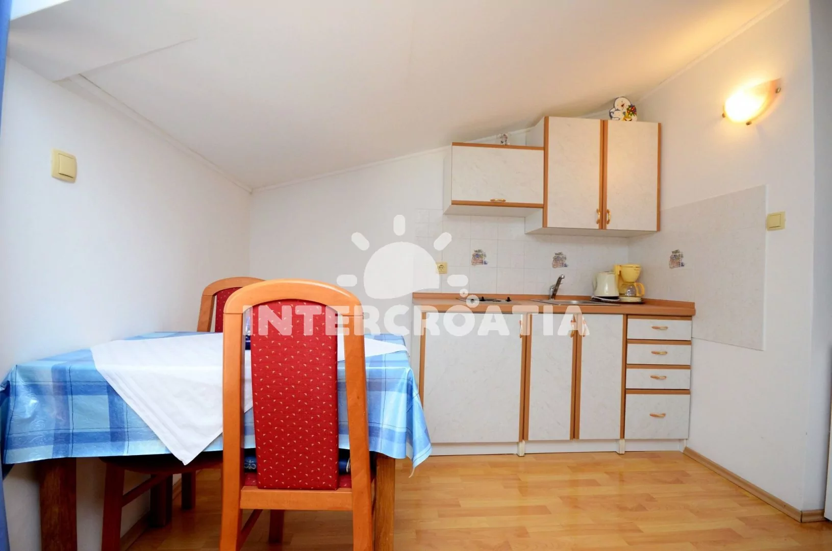 Podkrovní apartmán typu studio s vlastní terasou, výhledem do klidné ulice a venkovním posezením je vhodný pro 2 až 3 osoby. Obývací místnost je spojena s kuchyní. Kuchyňská linka je vybavena dvouplotýnkovým sporákem, rychlovarnou konvicí, kávovarem, nádobím a lednicí s mrazákem. Obývací místnost s jídelním stolem, pohovkou (rozložitelná na extra lůžko pro 1 osobu), televizí se satelitním programem, jedním dvoulůžkem, klimatizací a vstupem na terasu. Koupelna se sprchovým koutem, umyvadlem a wc. Hostům je k dispozici parkování u objektu zdarma.