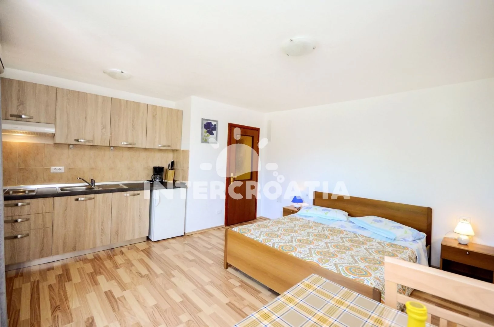 Apartmán (30 m2) typu studio, s vlastním balkonem, výhledem do dvora a klidné ulice. Apartmán se nachází v 1. patře domu a je vhodný pro 2 osoby. Obývací místnost je spojena s kuchyní. Kuchyňská linka je vybavena dvouplotýnkovým vařičem, digestoří, kávovarem, nádobím a lednicí s mrazákem. Obývací místnost s jídelním stolem, dvoulůžkem, televizí se satelitním programem, klimatizací a vstupem na balkon. Koupelna se sprchovým koutem, umyvadlem a wc. Hostům je k dispozici parkování u objektu zdarma.