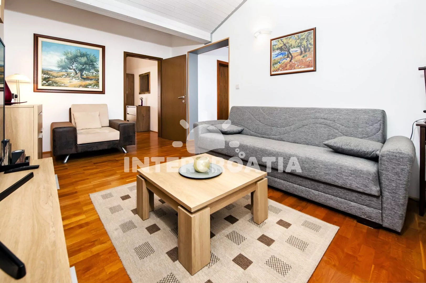 Moderně zařízený apartmán (45 m2) s terasou, balkonem a posezením se nachází v 2. patře vily a je vhodný pro 2 až 3 osoby. Obývací pokoj je spojený s kuchyní. Kuchyňská linka je vybavena varnou deskou, mikrovlnnou troubou, kávovarem, toustovačem, rychlovarnou konvicí, nádobím a lednicí s mrazákem. Obývací pokoj s jídelním stolem pro 3 osoby, pohovkou (rozložitelná na extra lůžko pro 1 osobu), televizí se satelitním programem, DVD přehrávačem, radiem, klimatizací a vstupem na terasu. Ložnice s dvoulůžkem a vstupem na balkon. Koupelna se sprchovým koutem, umyvadlem, fénem, pračkou a wc. Hostům je k dispozici parkování u objektu zdarma.
