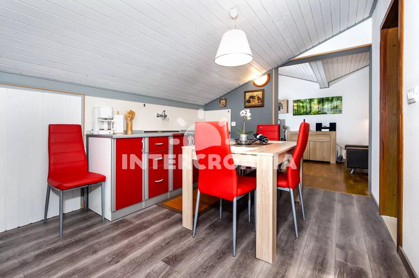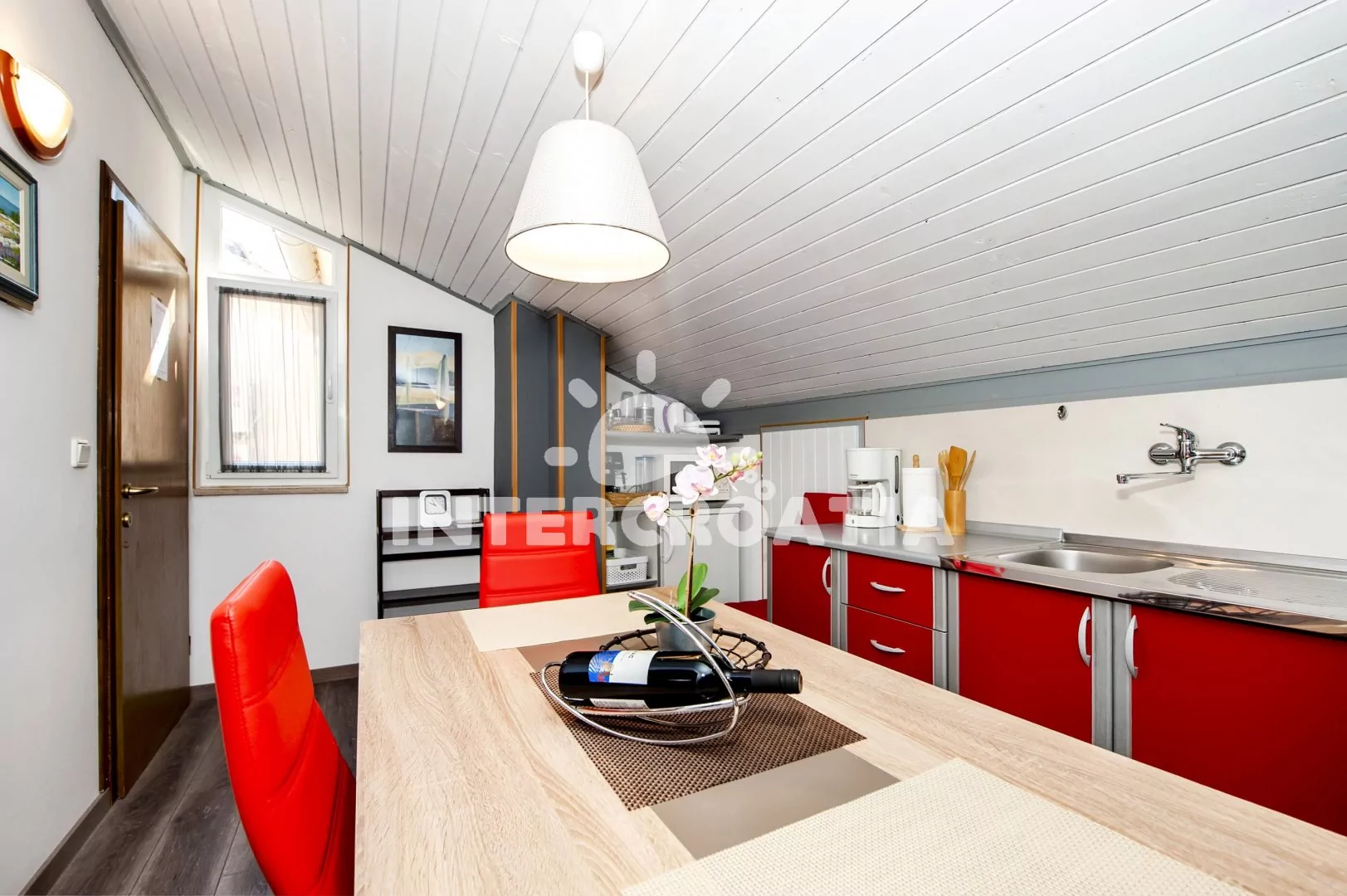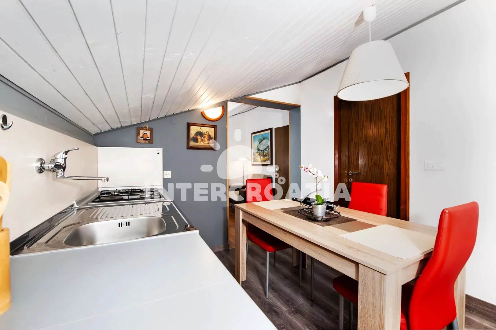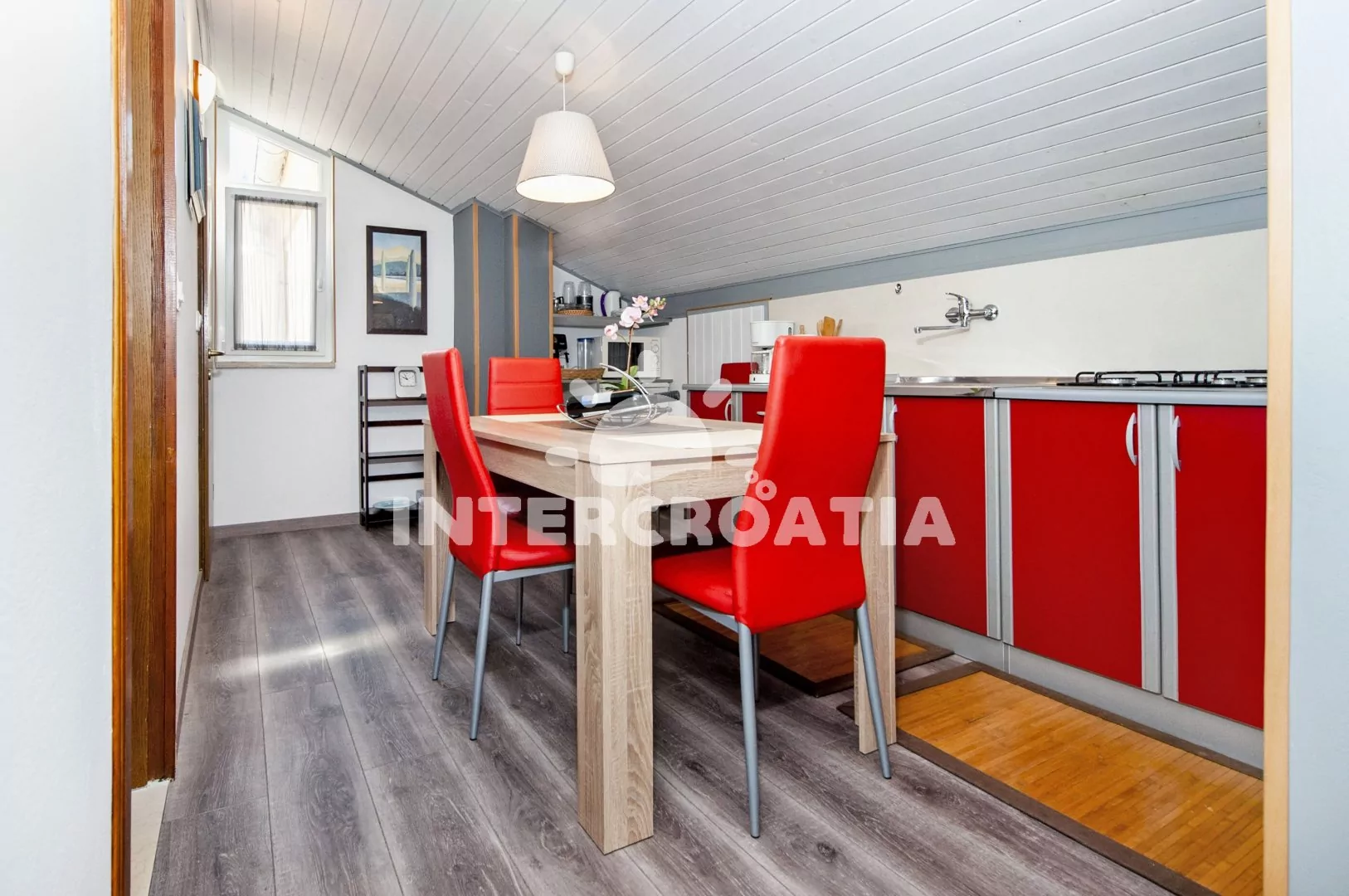 Moderně zařízený apartmán (45 m2) s terasou, balkonem a posezením se nachází v 2. patře vily a je vhodný pro 2 až 3 osoby. Obývací pokoj je spojený s kuchyní. Kuchyňská linka je vybavena varnou…