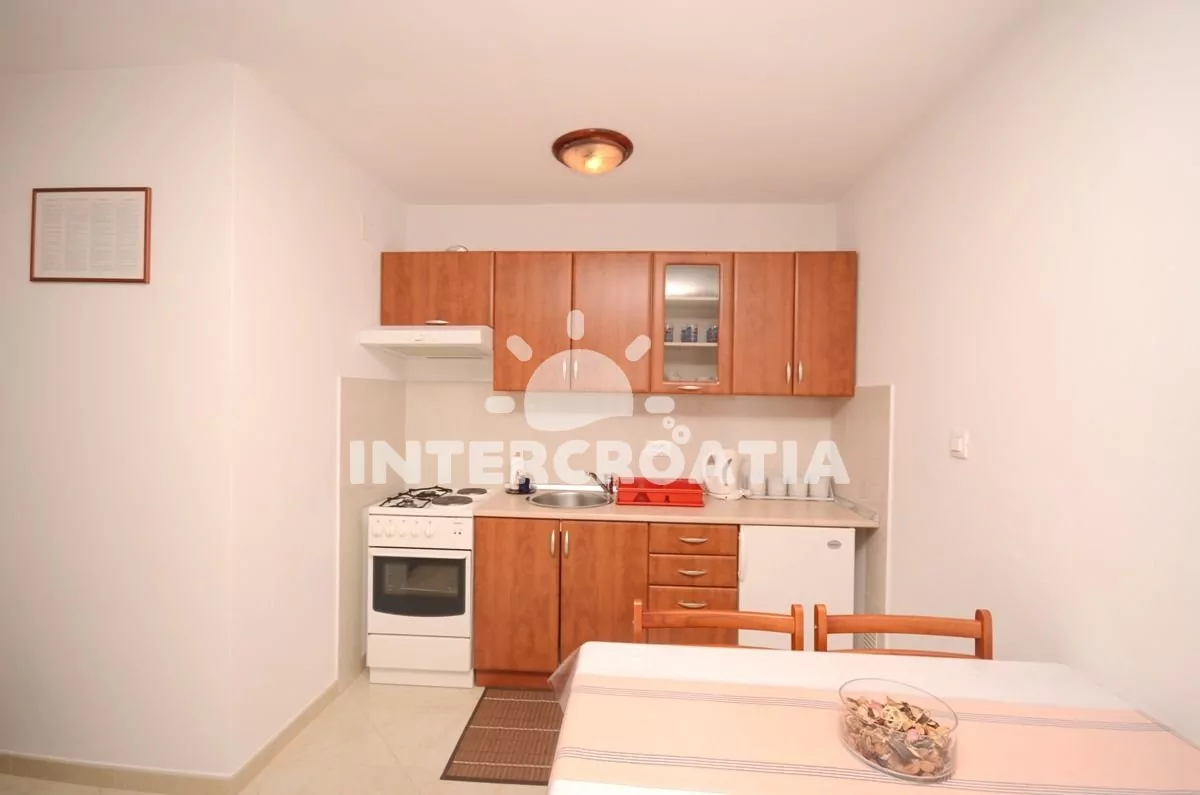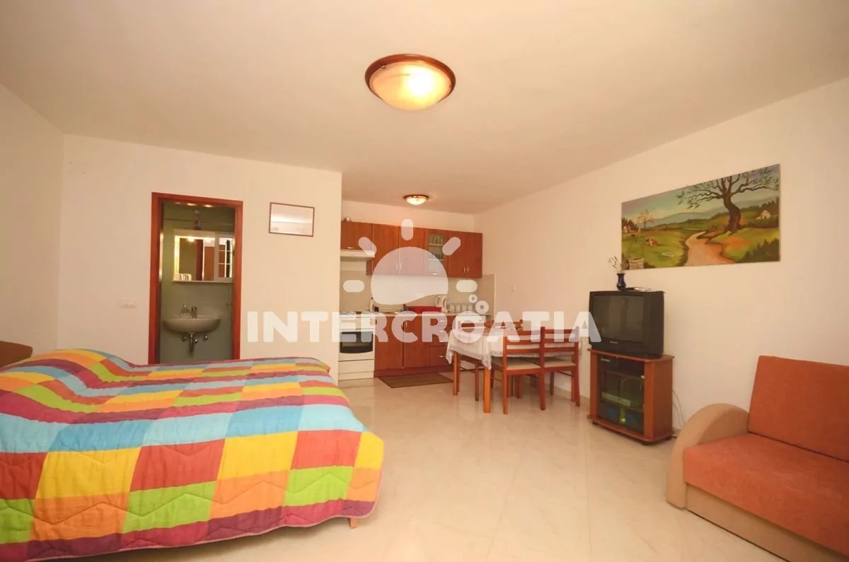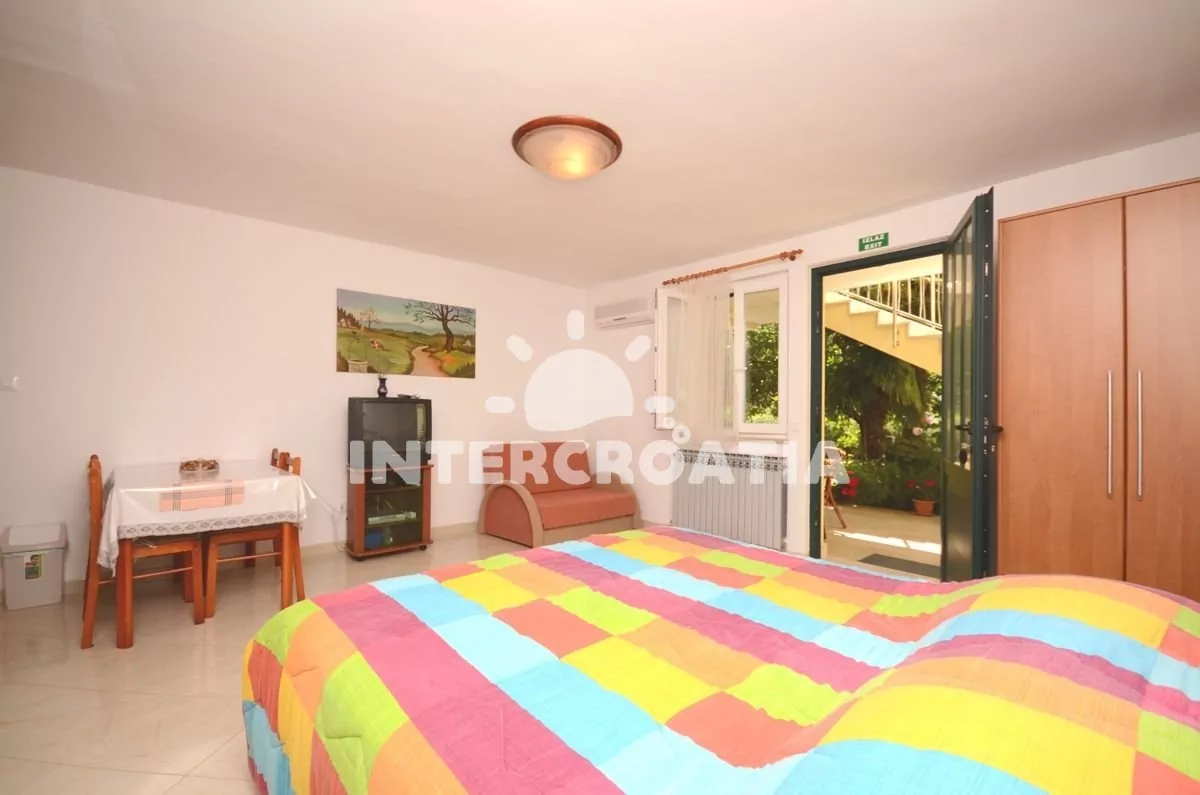 Apartmán (28 m2) typu studio s vlastní terasou a venkovním posezením. Apartmán se nachází v přízemí domu a je vhodný pro 2 osoby. Obývací místnost je spojena s kuchyní. Kuchyňská linka je vybavena sporákem s troubou, digestoří, rychlovarnou konvicí, kávovarem, nádobím a lednicí s mrazákem. Obývací místnost s jídelním stolem pro 4 osoby, pohovkou, televizí se satelitním programem, dvoulůžkem, klimatizací a vstupem na terasu. Koupelna se sprchovým koutem, umyvadlem a wc. Hostům je k dispozici parkování u objektu zdarma.