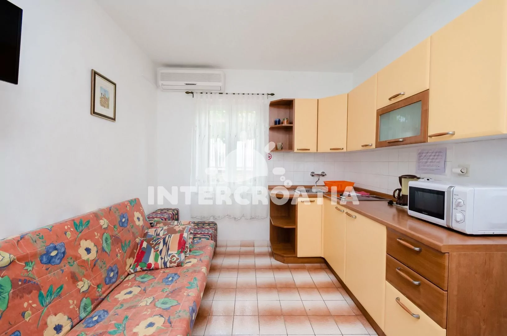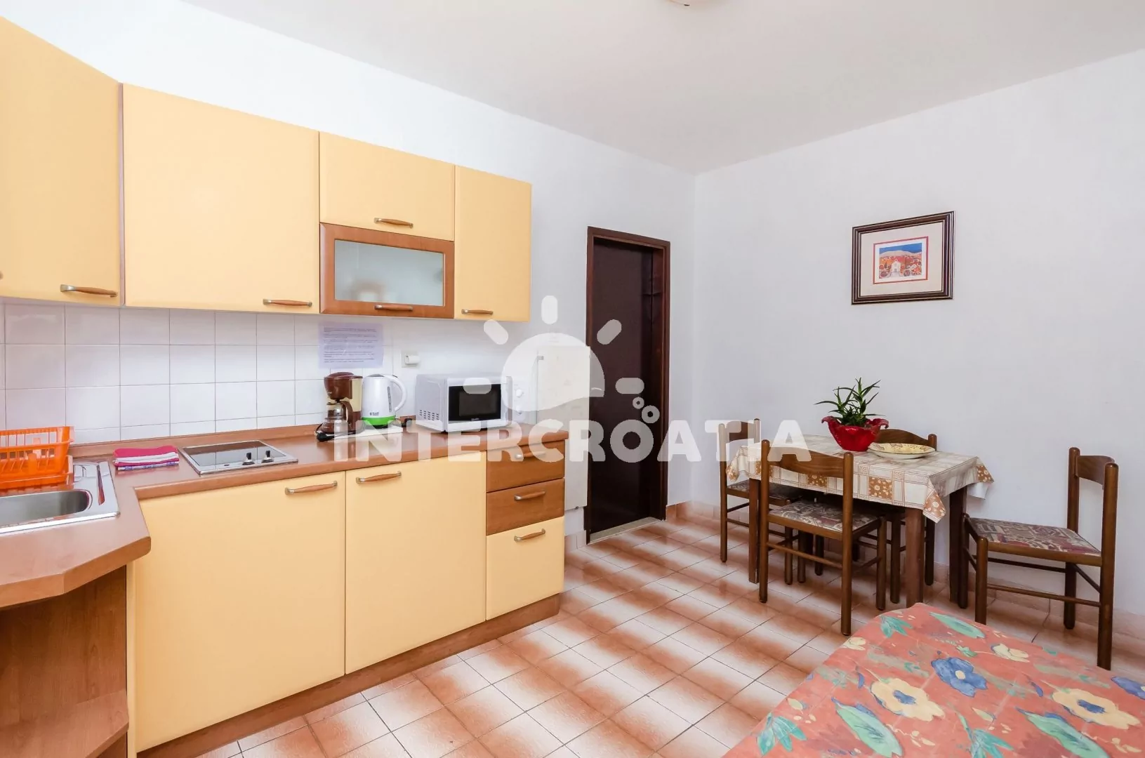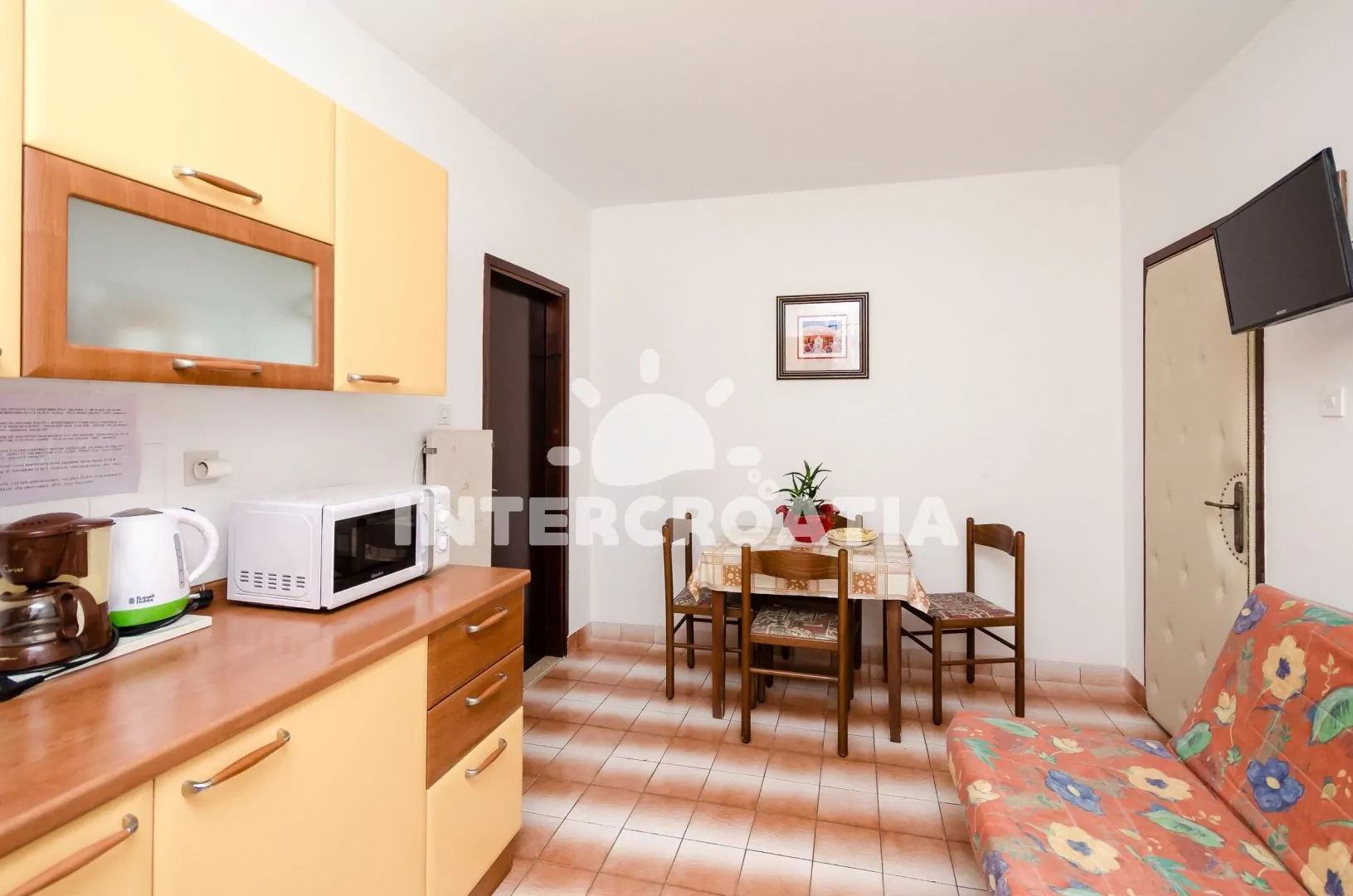 Příjemně zařízený apartmán (27 m2) s vlastním balkonem se nachází v 1. patře domu a je vhodný pro 2 až 3 osoby. Obývací pokoj je spojený s kuchyní. Kuchyňská linka je vybavena dvouplotýnkovým vařičem, rychlovarnou konvicí, kávovarem, toustovačem, mikrovlnnou troubou, nádobím a lednicí s mrazákem. Obývací pokoj je vybavený jídelním stolem, pohovkou (rozložitelná na extra lůžko pro 1 osobu), televizí se satelitním programem, klimatizací a vstupem na balkon. Ložnice s jedním dvoulůžkem. Koupelna se sprchovým koutem, umyvadlem, fénem a wc. Hostům je k dispozici parkování u objektu zdarma.