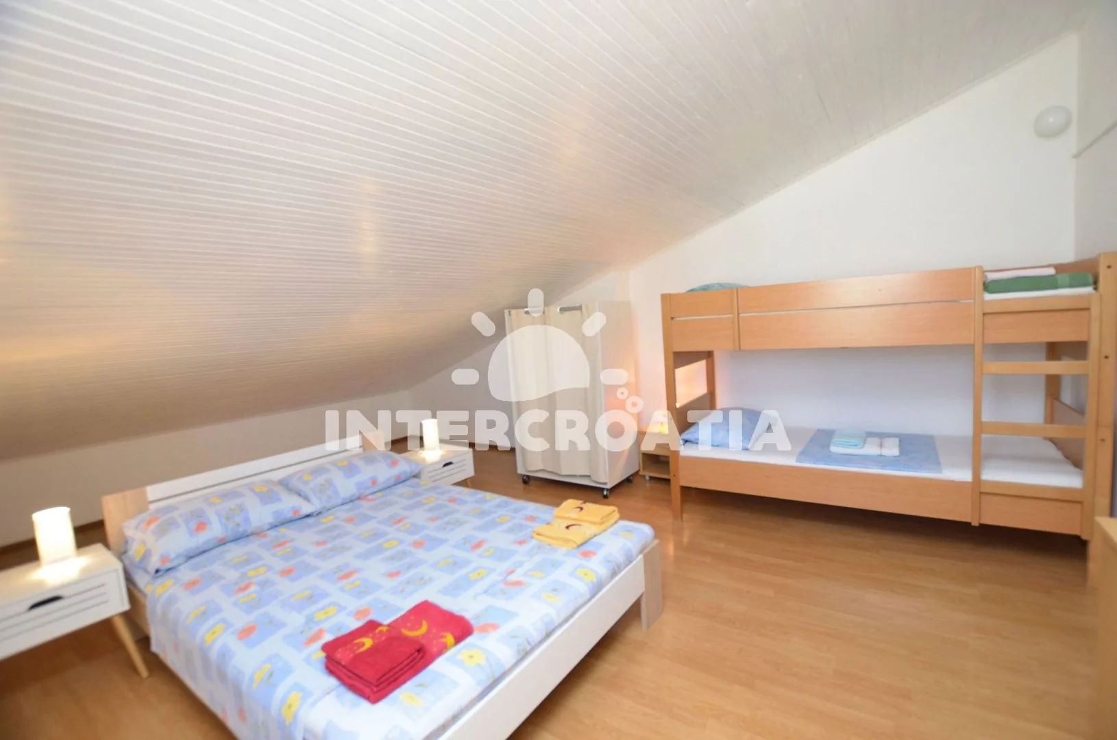 Podkrovní apartmán (38 m2) s vlastním balkonem je vhodný pro 3 až 4 osoby. Obývací místnost je spojena s kuchyní. Kuchyňská linka je vybavena dvouplotýnkovým vařičem, rychlovarnou konvicí, kávovarem, toustovačem, mikrovlnnou troubou, nádobím a lednicí s mrazákem. Obývací místnost s jídelním stolem pro 4 osoby, klimatizací a vstupem na balkon. Ložnice s dvoulůžkem, patrovou postelí (lůžka pro 2 osoby) a televizí se satelitním programem. Koupelna se sprchovým koutem, umyvadlem, fénem a wc. Hostům je k dispozici parkování u objektu zdarma.