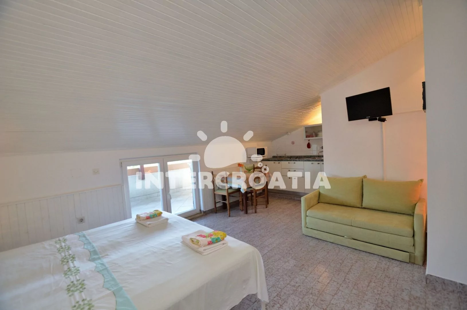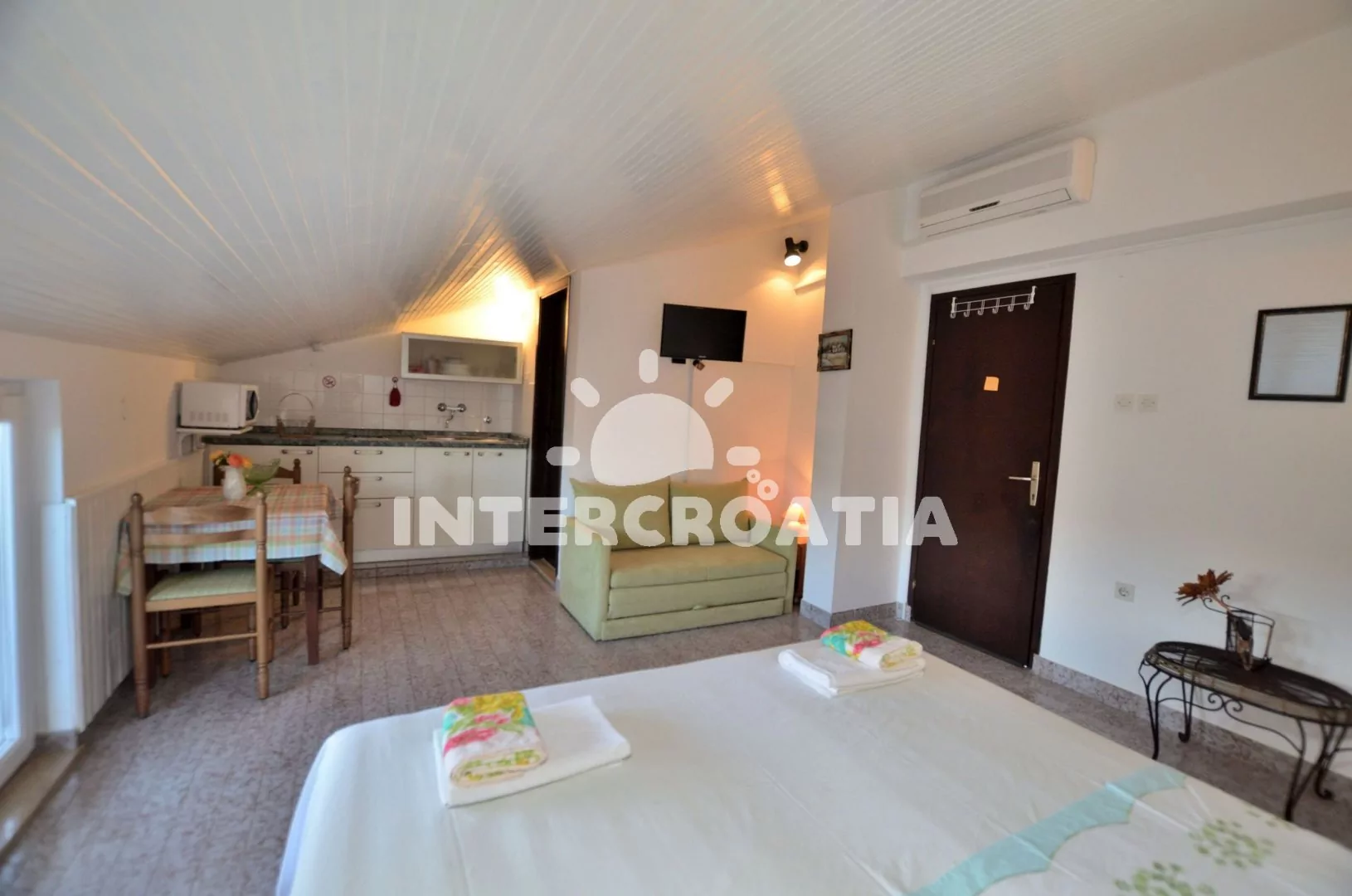Podkrovní apartmán (22 m2) typu studio s vlastní terasou je vhodný pro 2 osoby. Obývací místnost je spojena s kuchyní. Kuchyňská linka je vybavena dvouplotýnkovým vařičem, rychlovarnou konvicí, kávovarem, toustovačem, mikrovlnnou troubou, nádobím a lednicí s mrazákem. Obývací místnost s jídelním stolem, pohovkou, televizí se satelitním programem, klimatizací, jedním dvoulůžkem a vstupem na terasu (snížený vstup). Koupelna se sprchovým koutem, umyvadlem, fénem a wc. Hostům je k dispozici parkování u objektu zdarma.