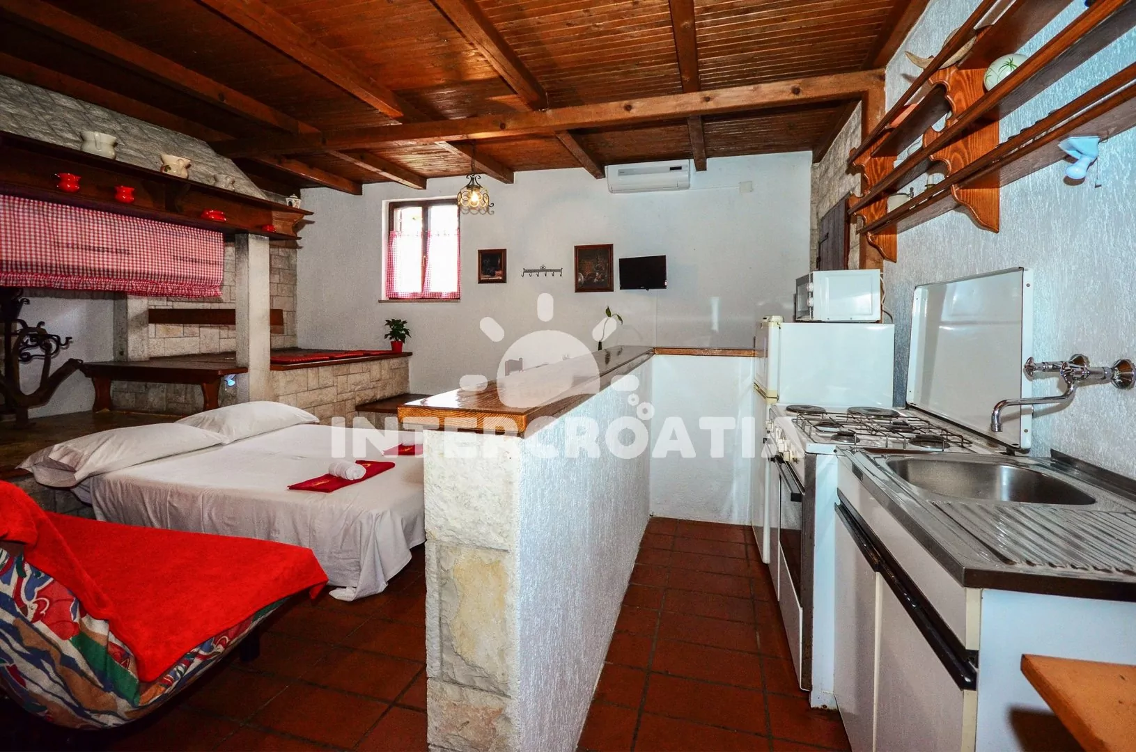 Apartmán (32 m2) typu studio s vlastní terasou se nachází v přízemí vily a je vhodný pro 2 osoby. Obývací místnost je spojena s kuchyní. Kuchyňská linka je vybavena sporákem s troubou, rychlovarnou konvicí, kávovarem, toustovačem, mikrovlnnou troubou, nádobím a lednicí s mrazákem. Obývací místnost s jídelním stolem, pohovkou, televizí se satelitním programem, klimatizací, jedním dvoulůžkem a vstupem na terasu. Koupelna se sprchovým koutem, umyvadlem, fénem a wc. Hostům je k dispozici parkování u objektu zdarma.