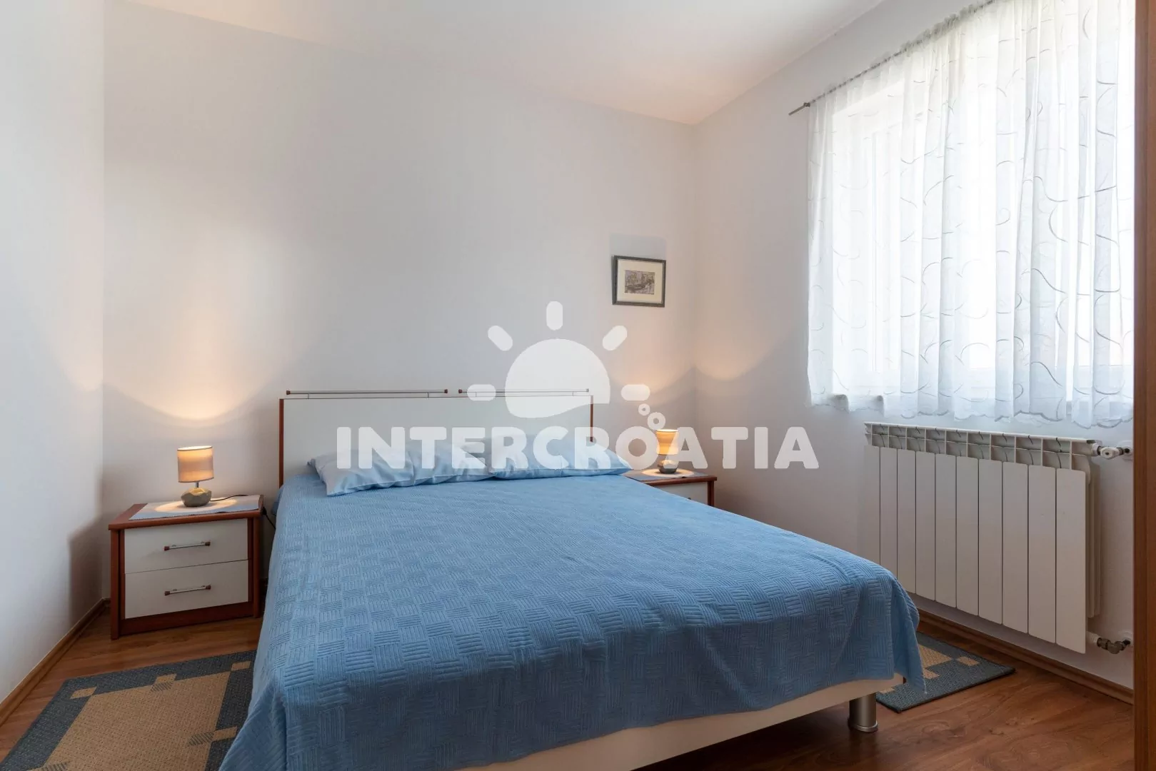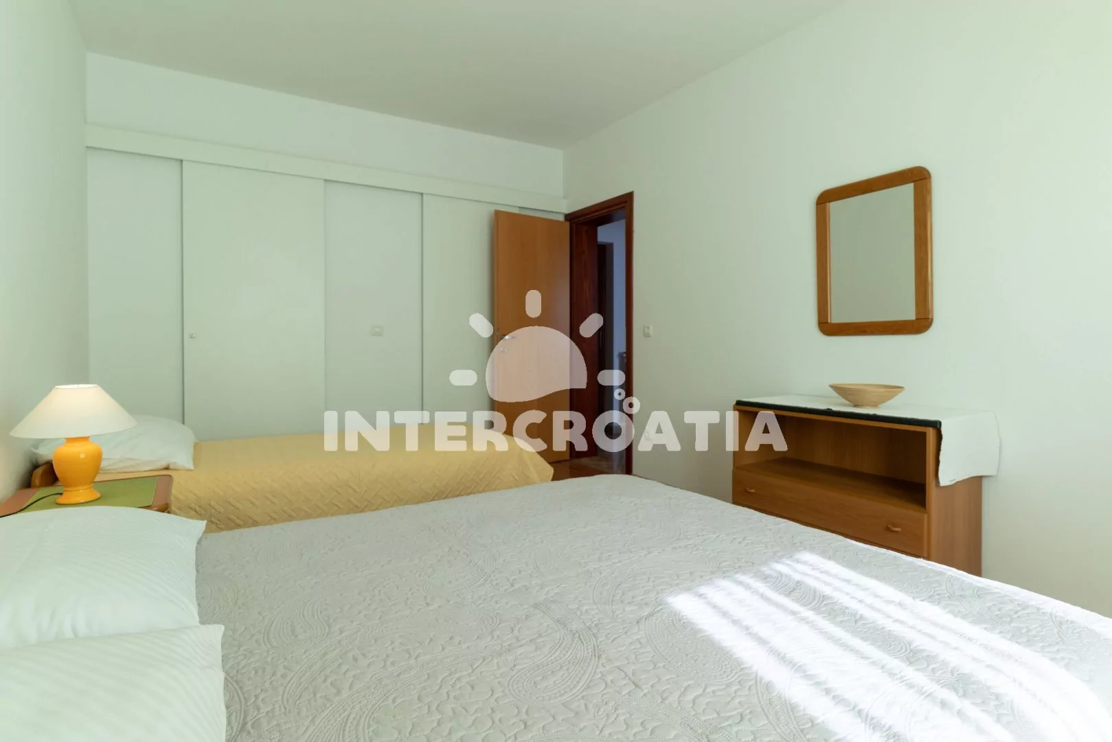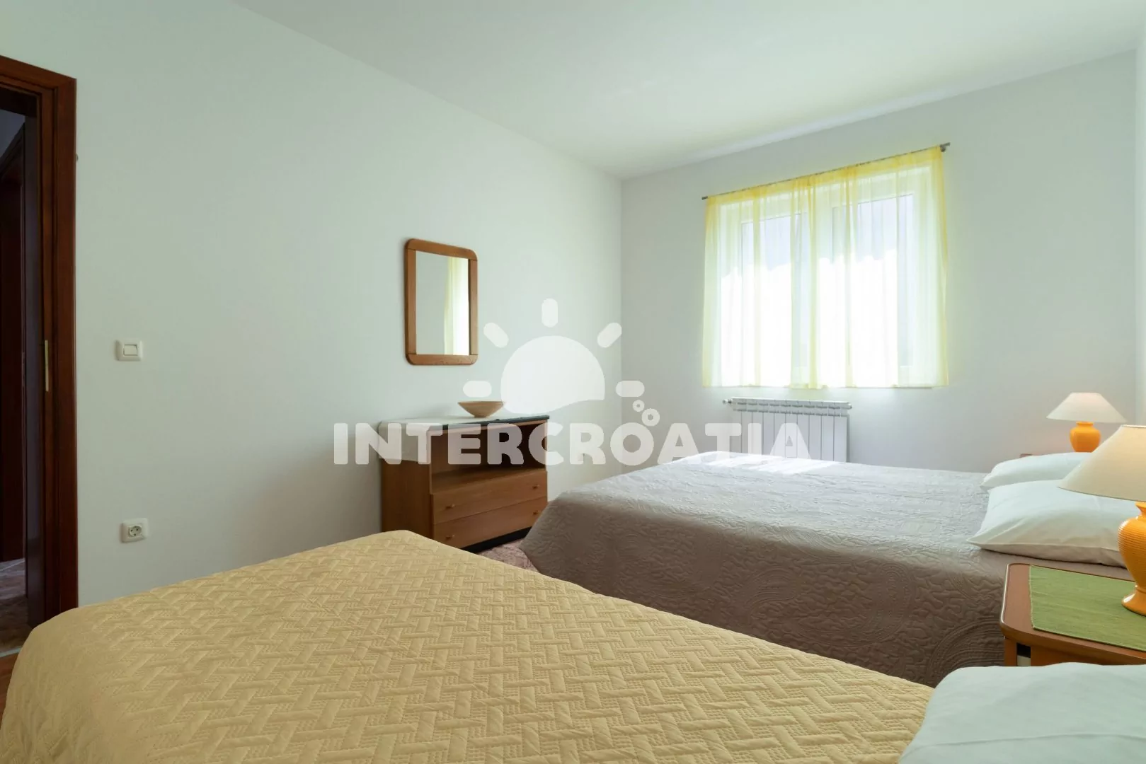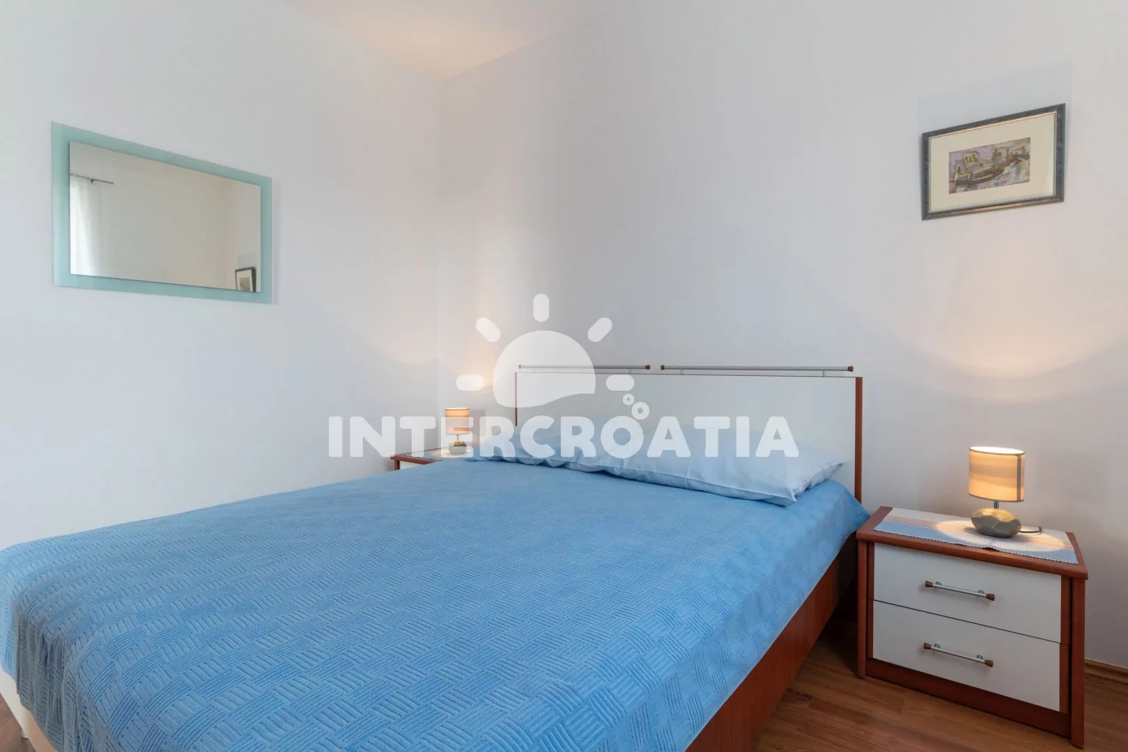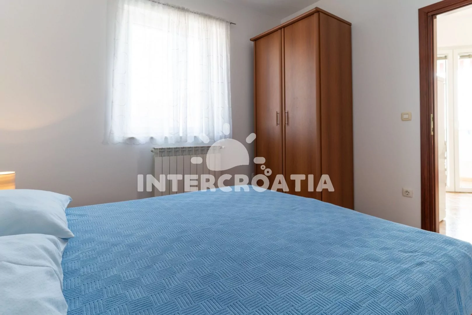 Apartmán (60 m2) s balkonem a výhledem do klidné ulice se nachází v 1. patře domu. Apartmán má 2 ložnice a je vhodný pro 4 až 6 osob. Obývací pokoj je spojený s kuchyní. Kuchyňská linka je vybavena sporákem s troubou, digestoří, mikrovlnnou troubou, rychlovarnou konvicí, kávovarem, toustovačem, nádobím a lednicí s mrazákem. Obývací pokoj s jídelním stolem pro 4 osoby, pohovkou (rozložitelná na extra lůžko pro 1 osobu), televizí se satelitním programem, radiem, klimatizací a vstupem na balkon. První ložnice s dvoulůžkem. Druhá ložnice s dvoulůžkem a jednolůžkem. Koupelna se sprchovým koutem, umyvadlem, fénem, bidetem a wc. Hostům je k dispozici parkování u objektu zdarma.