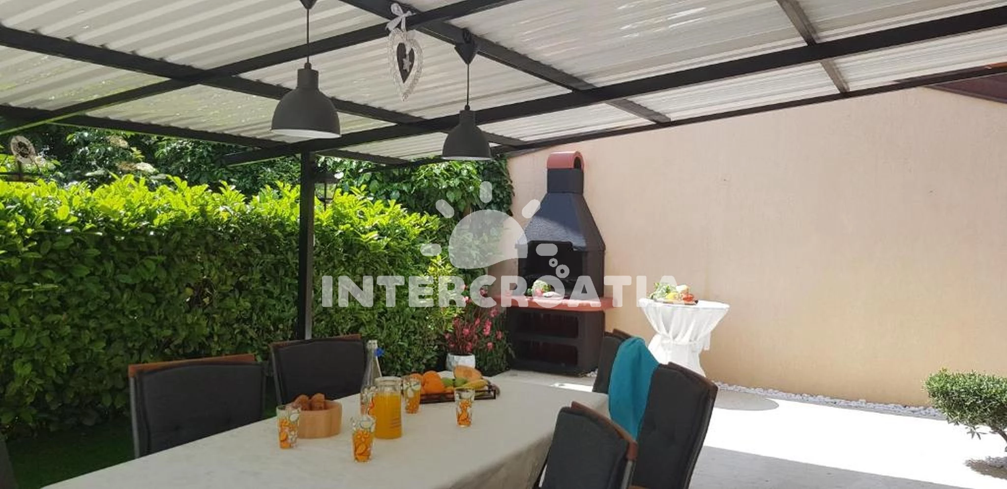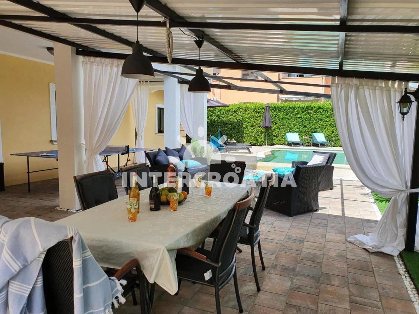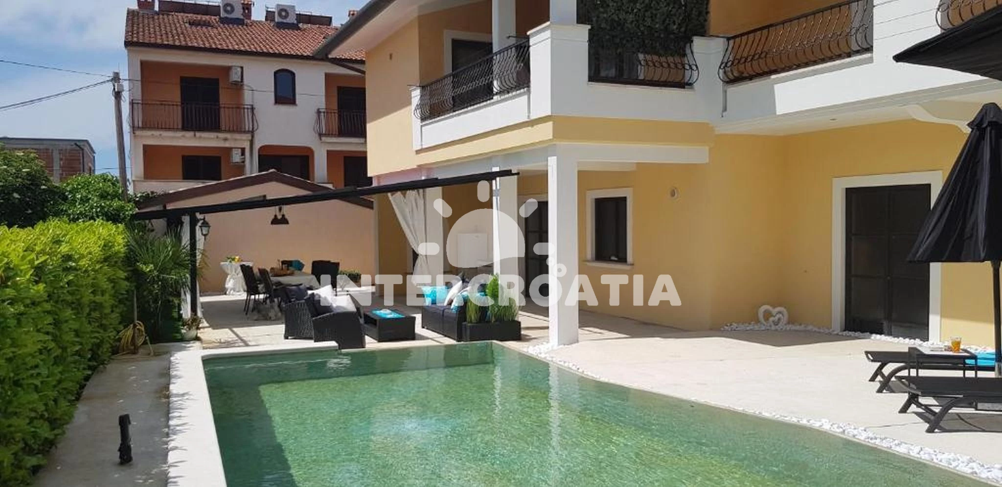 Apartmán se nachází 3100 m od moře a pláže. Pláž je oblázková. Apartmán disponuje bazénem s lehátky pro ubytované hosty. U objektu je k dispozici společná zahrada s posezením a grilem. Parkování je před domem.