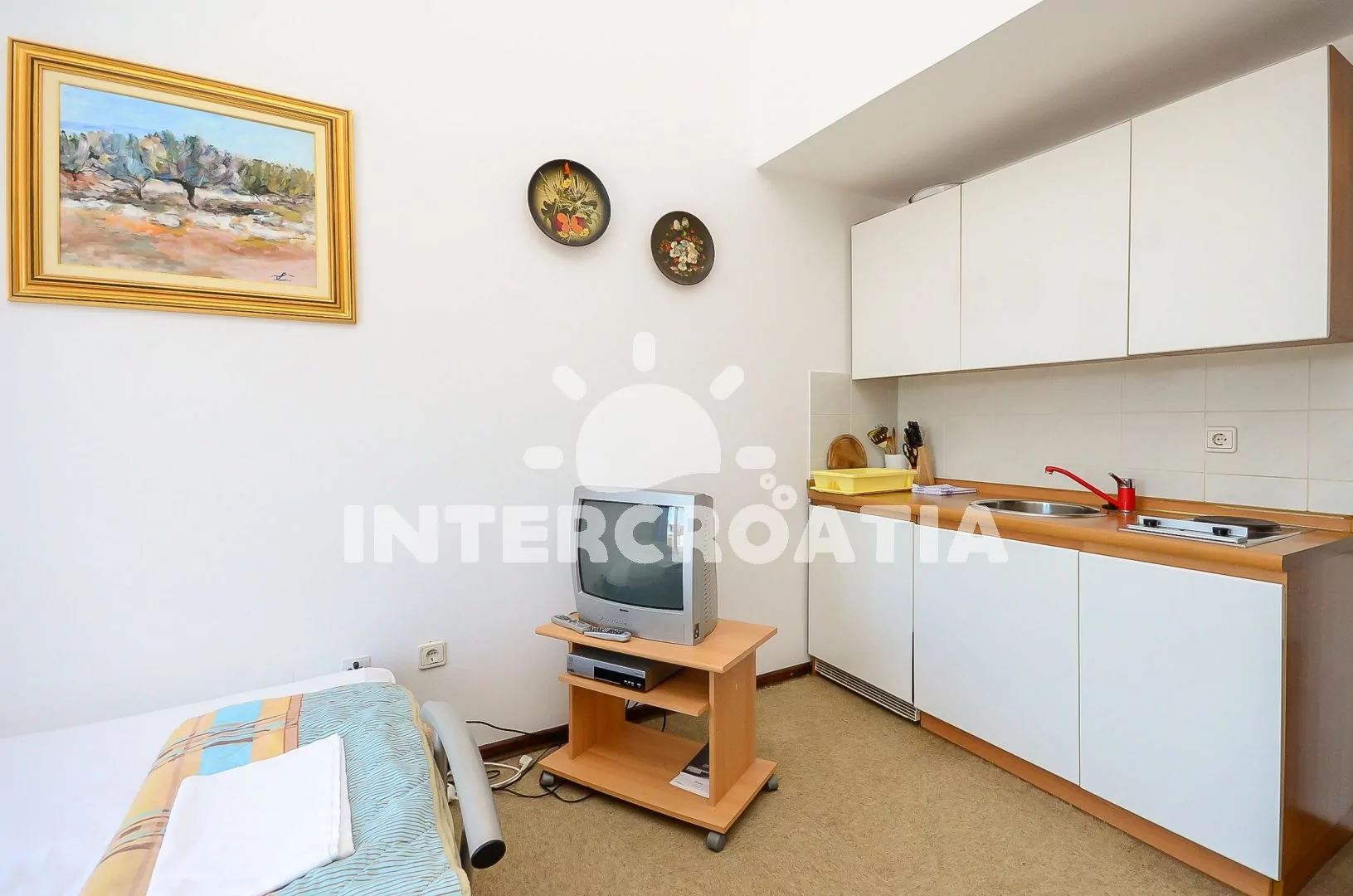 Apartmán typu studio pro 4 osoby. Kuchyňský kout je vybaven pracovní deskou, nádobím, dvouplotýnkovým vařičem, kávovarem, rychlovarnou konvicí, lednicí a jídelním stolem. Obývací část s televizí se…