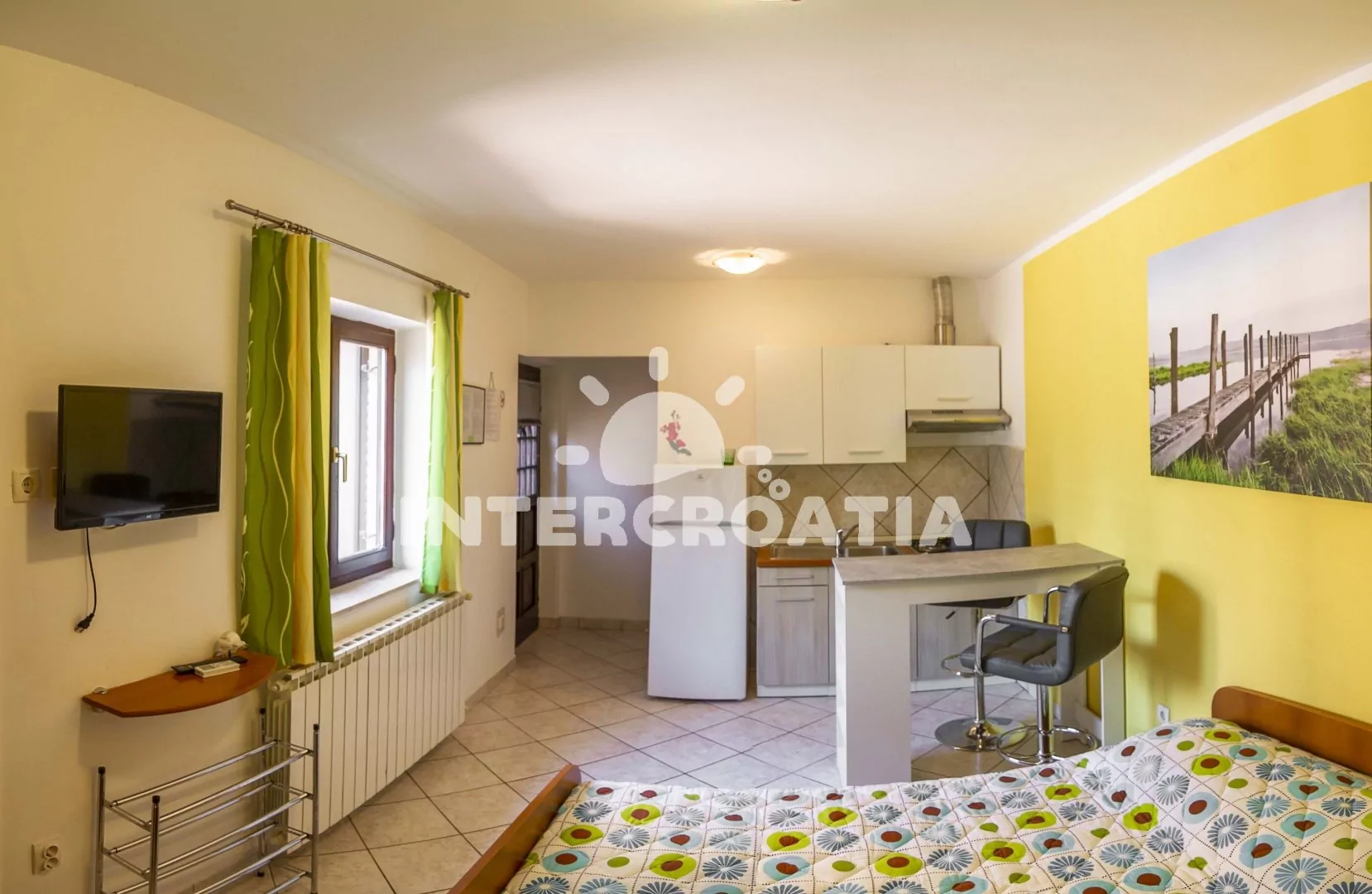 Apartmán typu studio s terasou se nachází v přízemí vilky a je vhodný pro 2 osoby. Obývací místnost je spojena s kuchyní. Kuchyňská linka je vybavena sporákem (varná deska), kávovarem, nádobím a chladničkou s mrazákem. Obývací místnost s jídelním stolem pro 2 osoby, televizí se satelitním programem, jedním dvoulůžkem, klimatizací, pračkou, žehličkou a vstupem na terasu. Koupelna se sprchovým koutem, umyvadlem, fénem a wc. Hostům je k dispozici parkování 50 až 150 m od objektu.