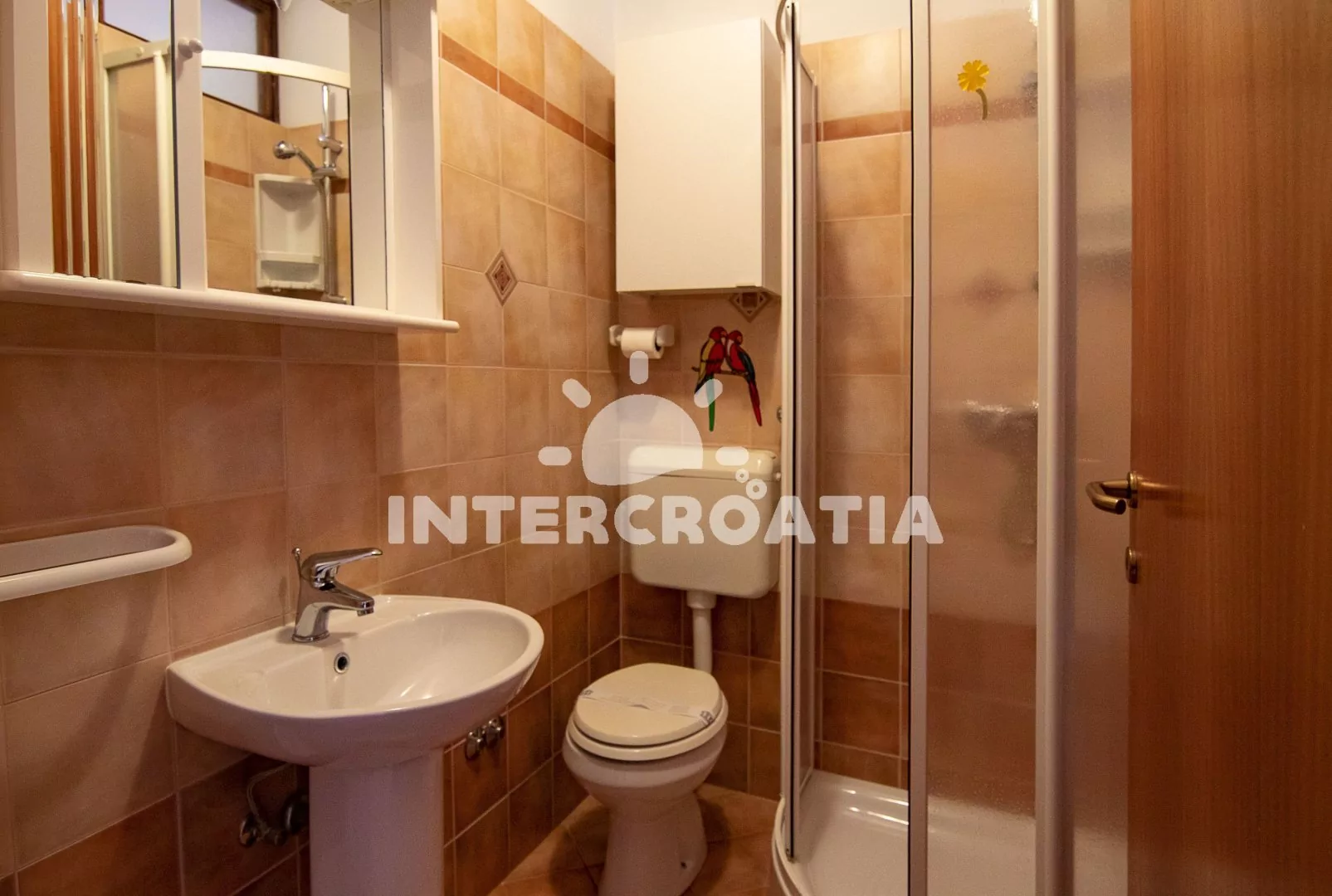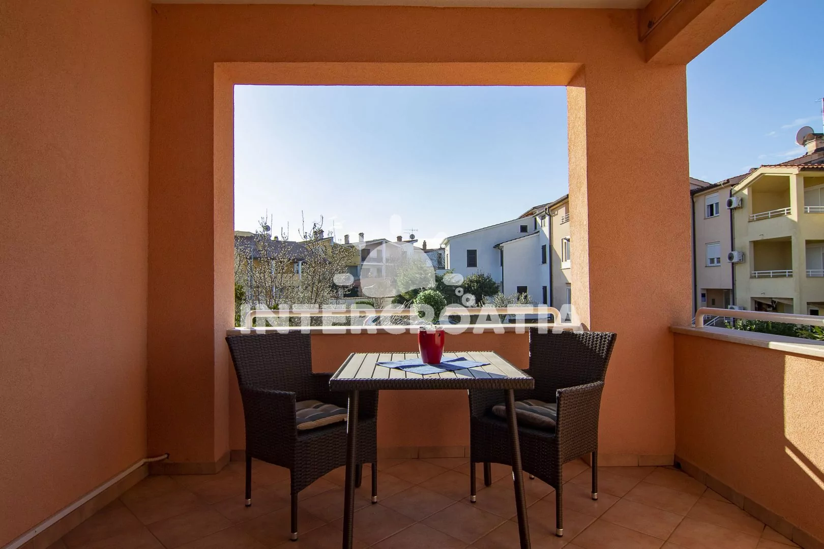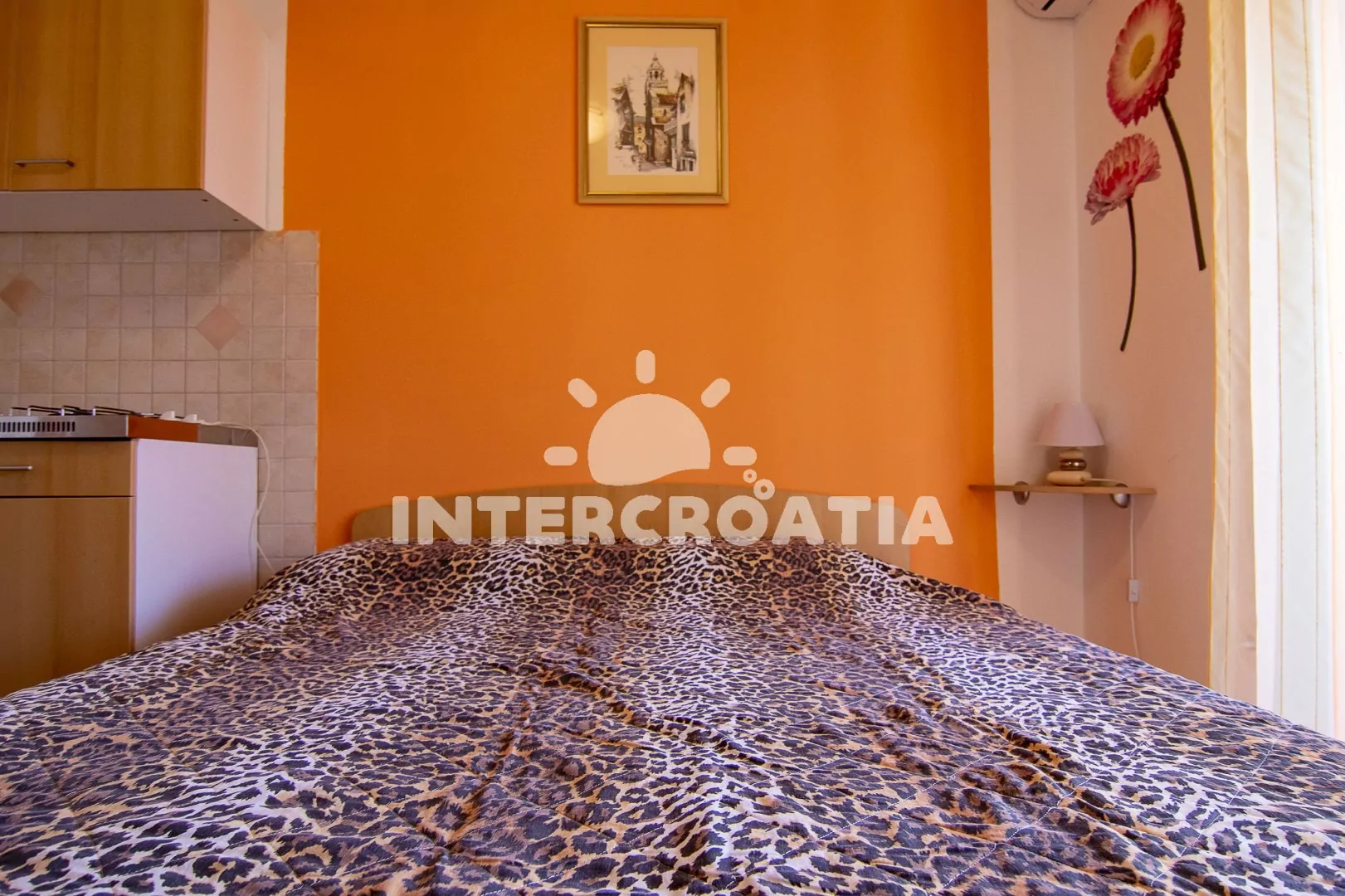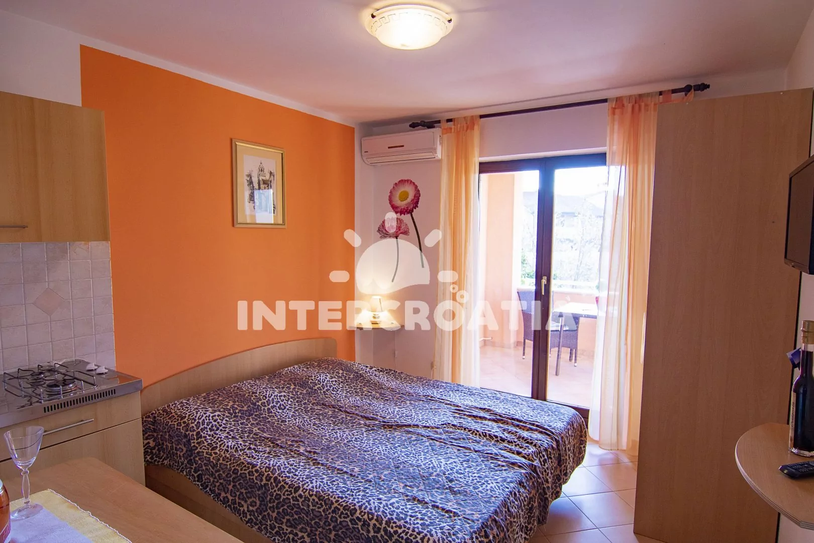 Apartmán typu studio s terasou a výhledem do klidné ulice se nachází v prvním patře domu a je vhodný pro 2 osoby. Obývací místnost je spojena s kuchyní. Kuchyňská linka je vybavena dvouplotýnkovým sporákem, kávovarem, nádobím a malou chladničkou. Obývací místnost s jídelním stolem pro 2 osoby, pohovkou, přistýlkou (lůžko pro 2 osoby), televizí se satelitním programem, jedním dvoulůžkem, klimatizací a vstupem na terasu. Koupelna se sprchovým koutem, umyvadlem, fénem a wc. Hostům je k dispozici parkování 50 až 150 m od objektu.