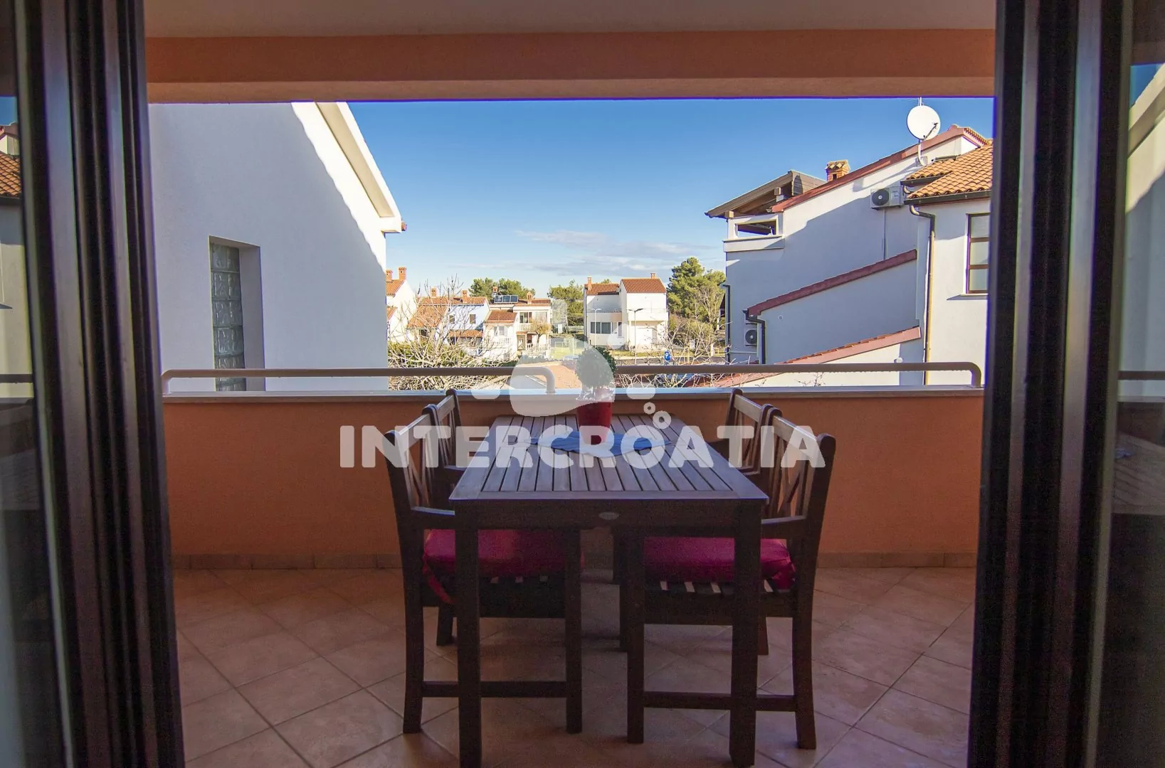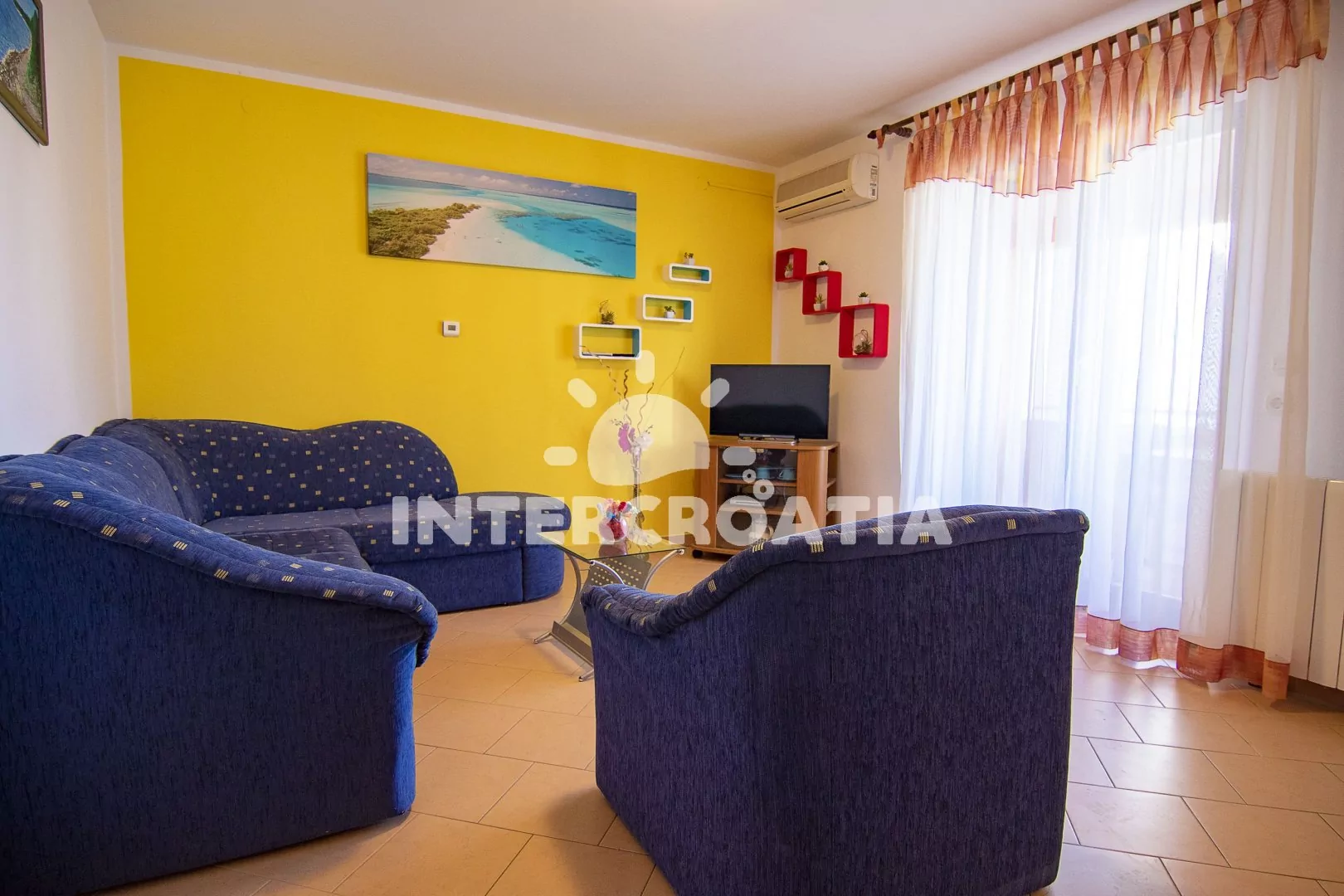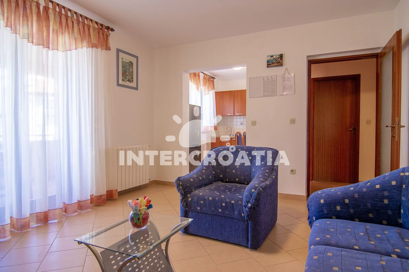 Apartmán (55 m2) s terasou a výhledem do klidné ulice se nachází v prvním patře domu a je vhodný pro 2 až 4 osoby. Kuchyň je vybavena jídelním stolem pro 4 osoby, kuchyňskou linkou se sporákem, troubou, digestoří, kávovarem, rychlovarnou konvicí, nádobím a lednicí s mrazákem. Obývací pokoj se sedací soupravou, rohovou pohovkou (rozložitelná na extra lůžko pro 2 osoby), televizí se satelitním programem, klimatizací a vstupem na terasu. Ložnice s jedním dvoulůžkem a vstupem na terasu. Koupelna se sprchovým koutem, umyvadlem, fénem, pračkou a wc. Hostům je k dispozici parkování 50 až 150 m od objektu.