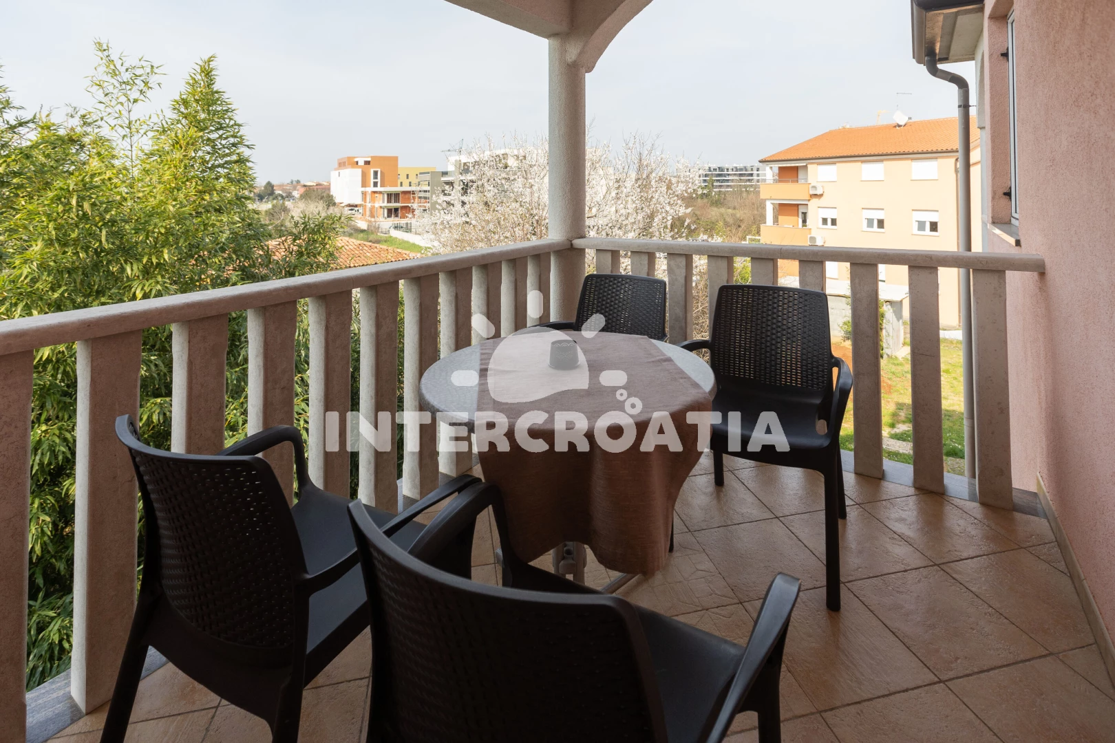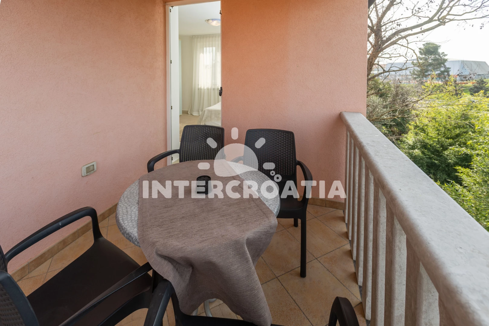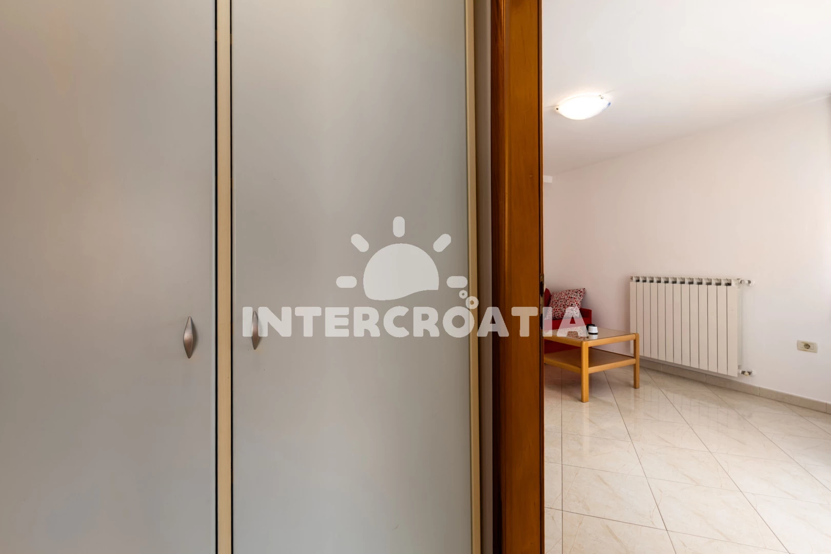 Apartmán se nachází 800 m od moře a pláže. Pláž je skalnatá, oblázková, větší kamení a betonové desky. Parkování je před domem.