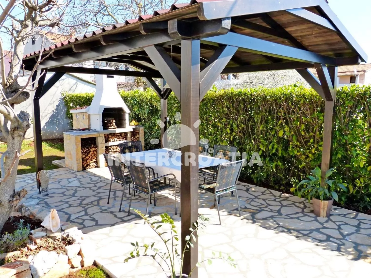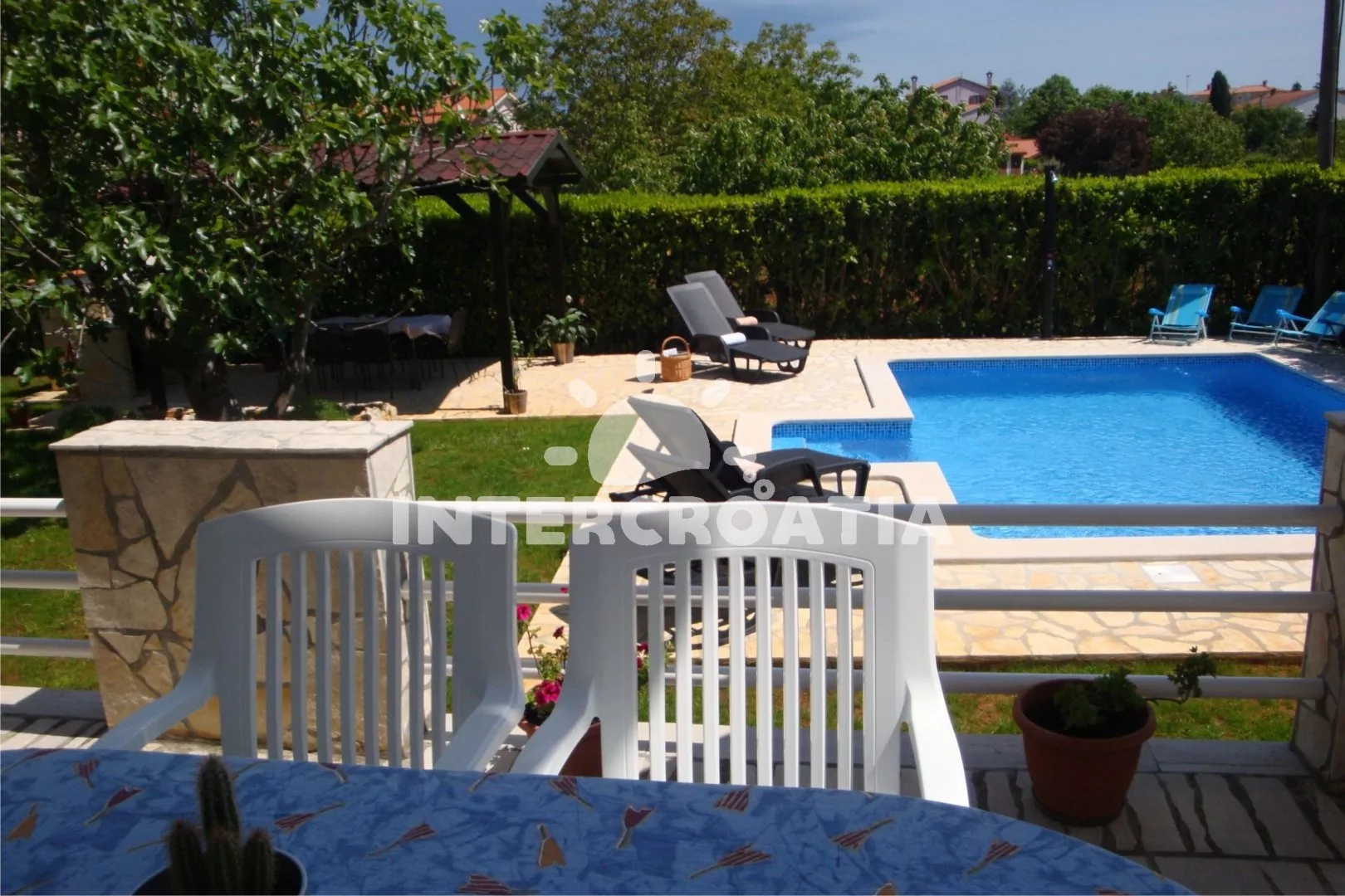 Vila s bazénem a lehátky, na zahradě je hostům k dispozici pergola s posezením a zděným grilem.