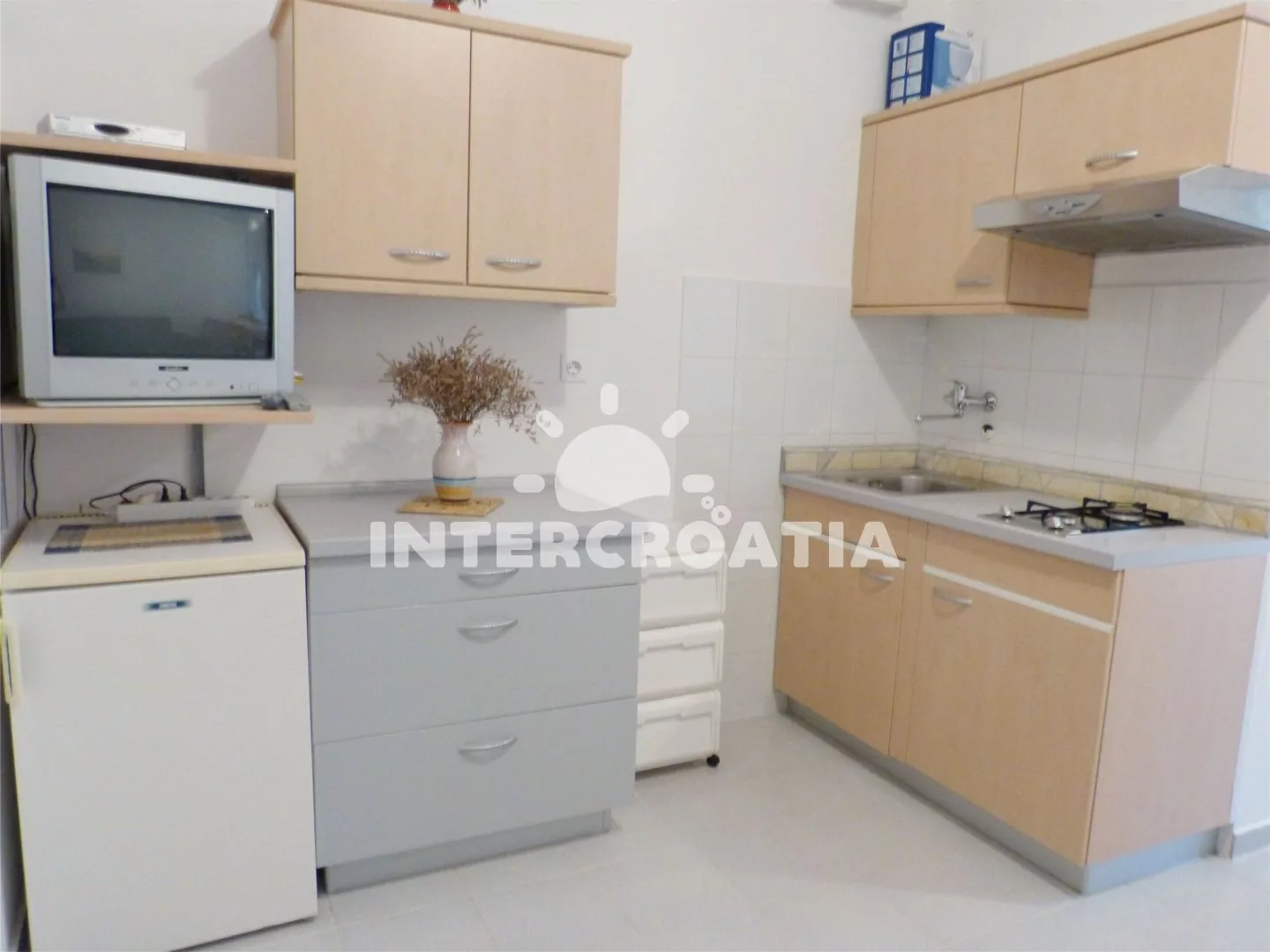 Apartmán s terasou se nachází v přízemí vily a je vhodný pro 3 osoby. Obývací pokoj je spojený s kuchyní. Kuchyňská linka s dvouplotýnkovým sporákem, digestoří, mikrovlnnou troubou, rychlovarnou…