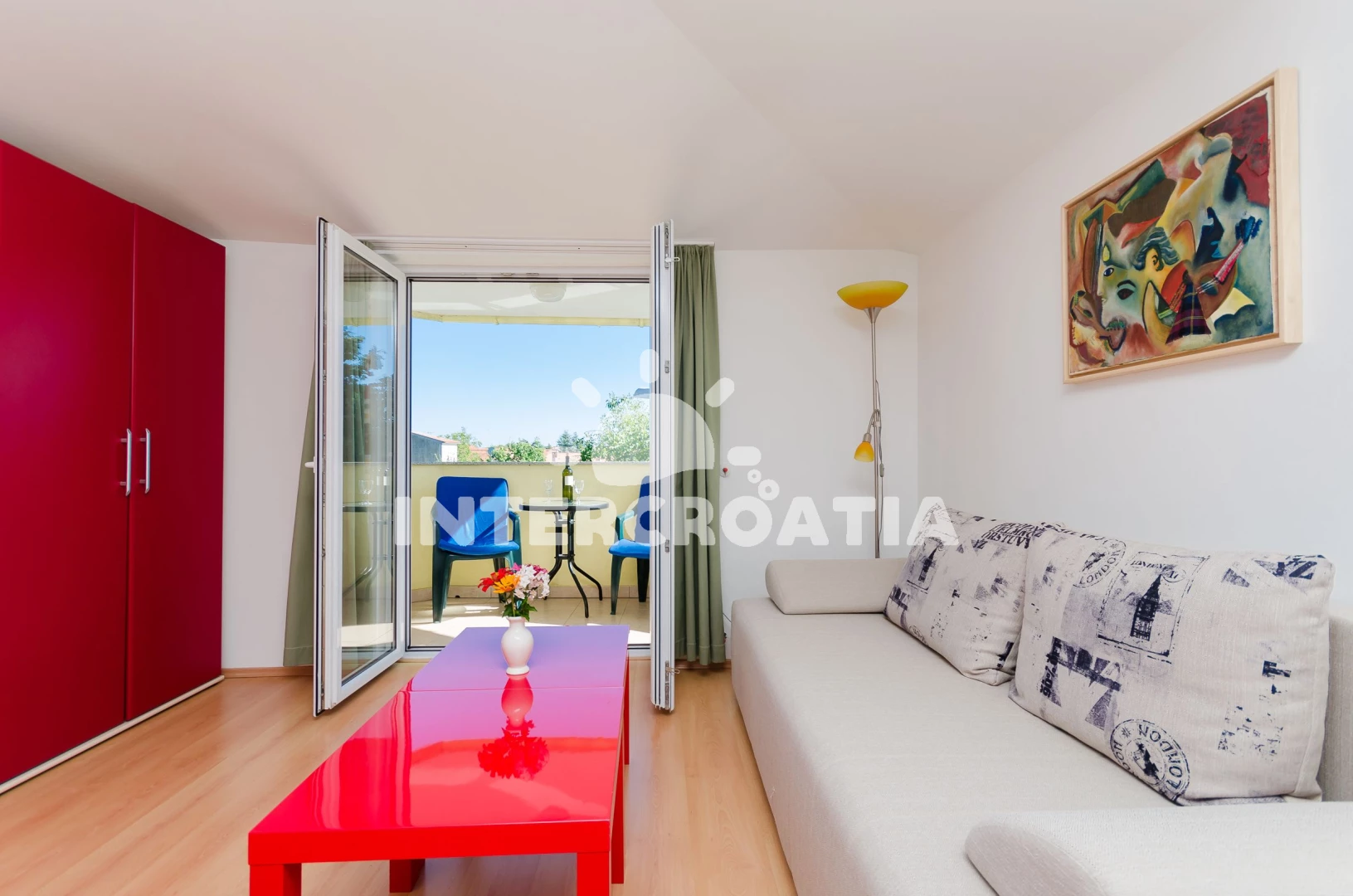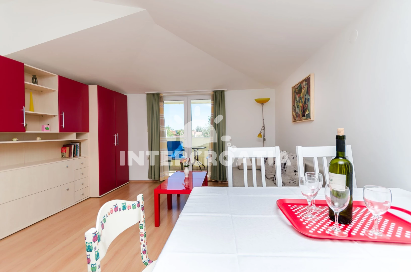 Apartmán (2) s balkonem. Nachází se v objektu. Apartmán má 1 ložnici a je vhodný pro až 1 osobu. Kuchyňská linka je vybavena varnou deskou, kávovarem, troubou, mikrovlnnou troubou, rychlovarnou konvicí, nádobím, lednicí, mrazákem. V obývací místnosti je rozložitelná pohovka (extra lůžko pro osoby). K dispozici televize, žehlička. V obýváku jsou 0 postele.