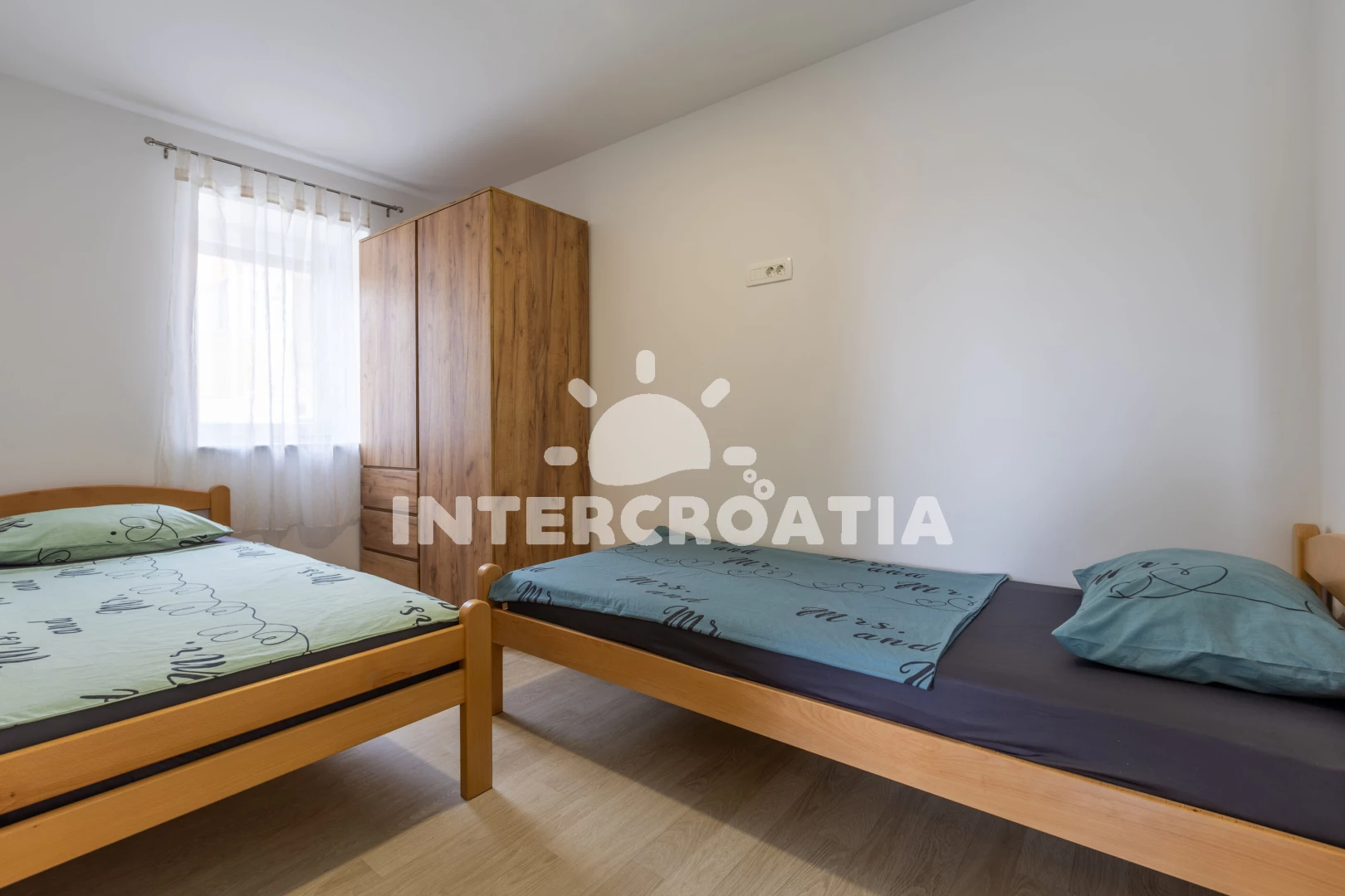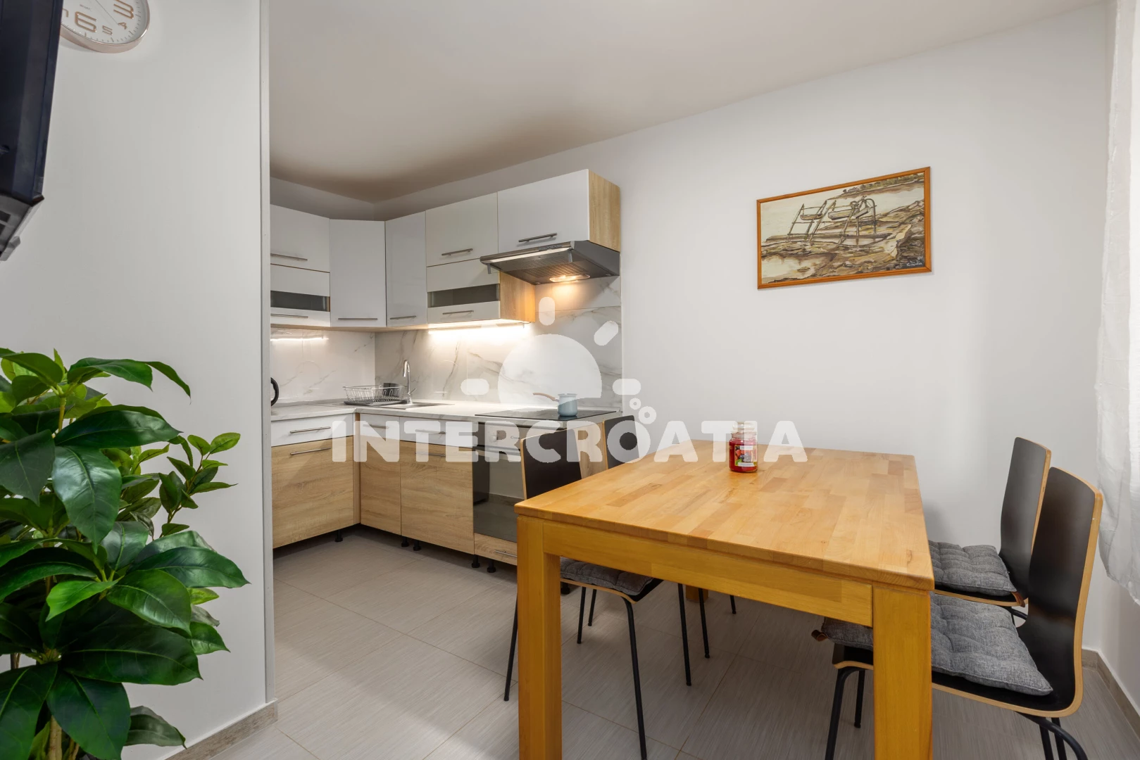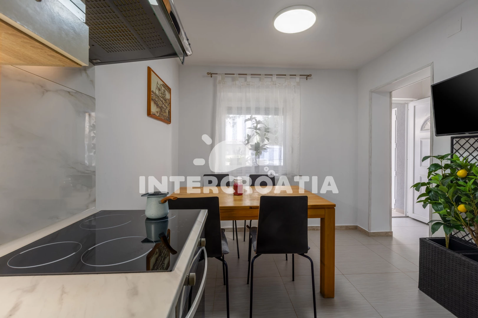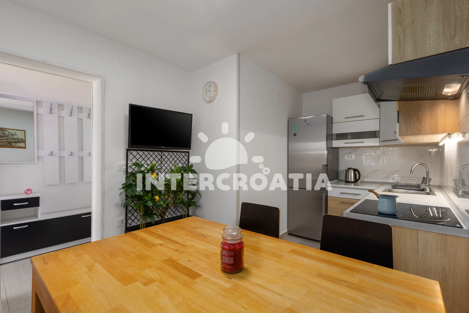 Apartmán se nachází 500 m od moře a pláže. Pláž je skalnatá, oblázková, větší kamení a betonové desky. Parkování je před domem.