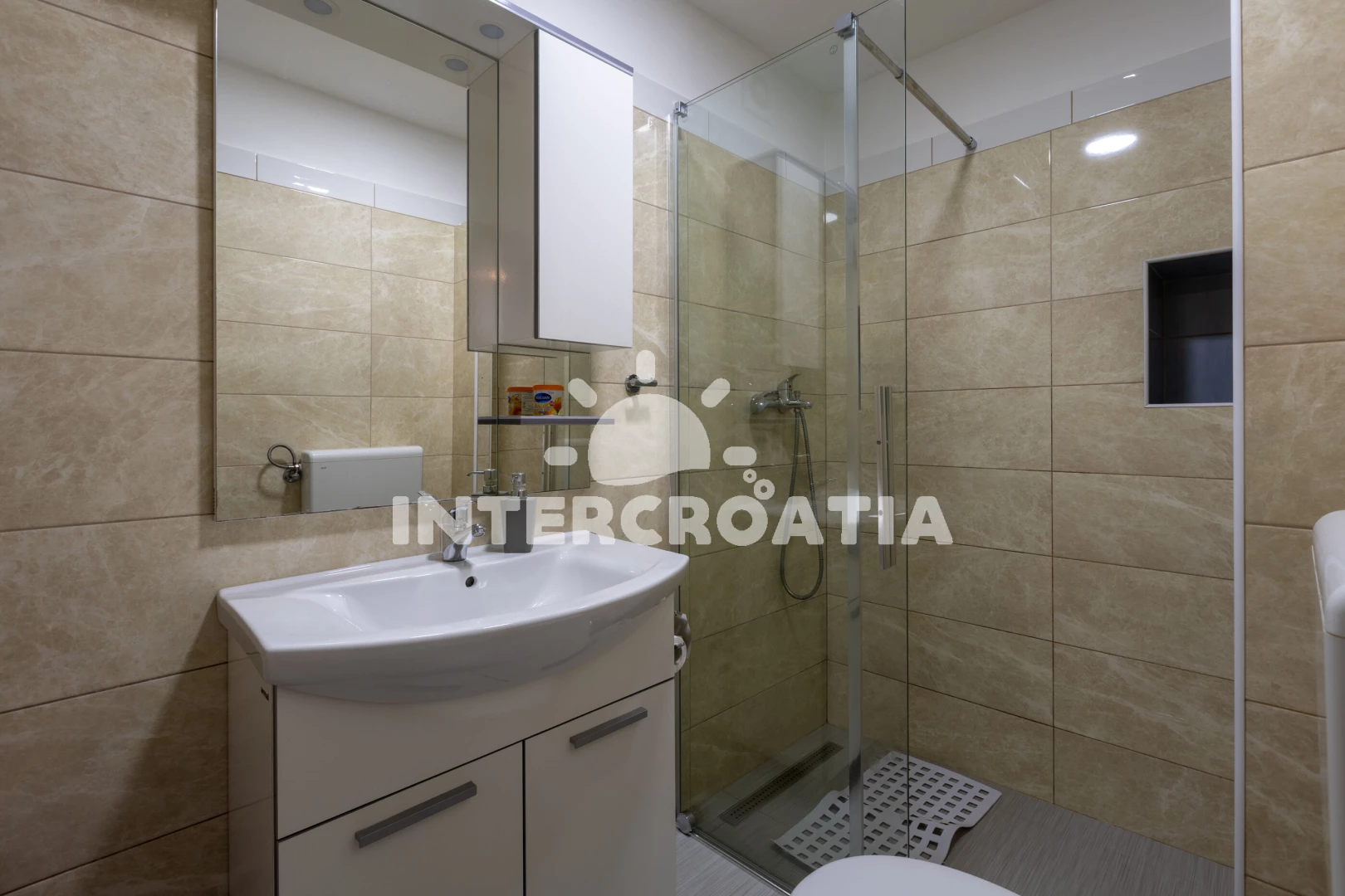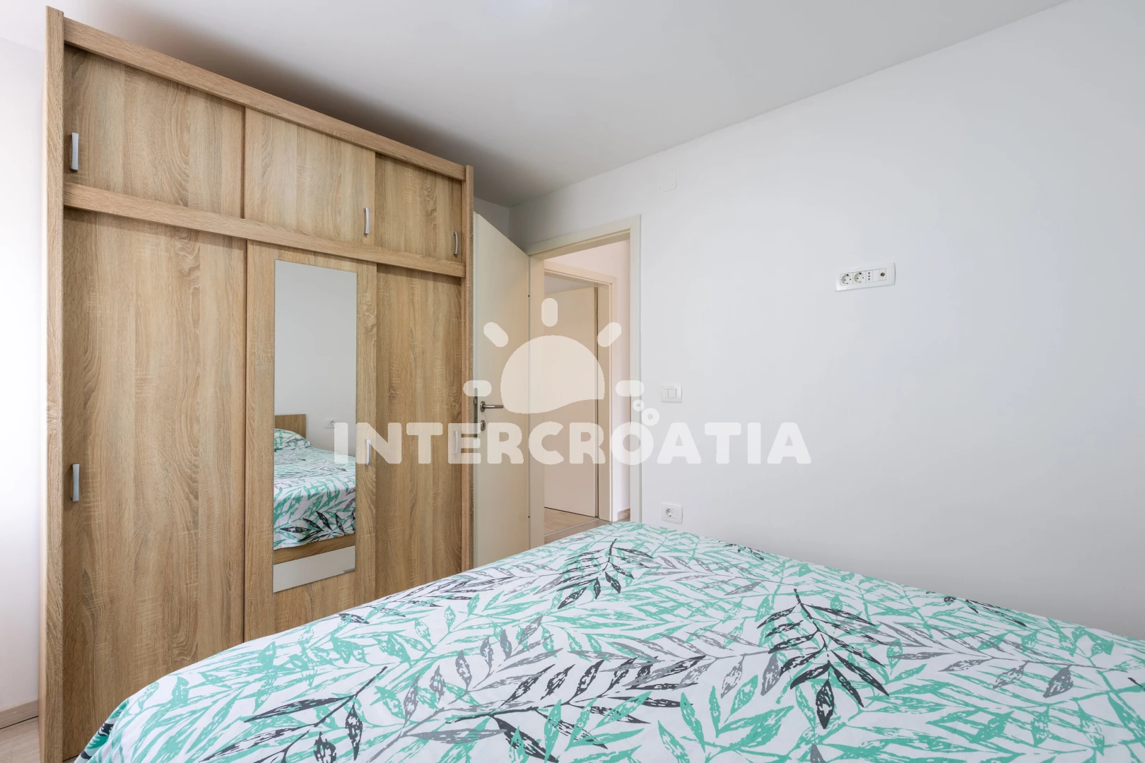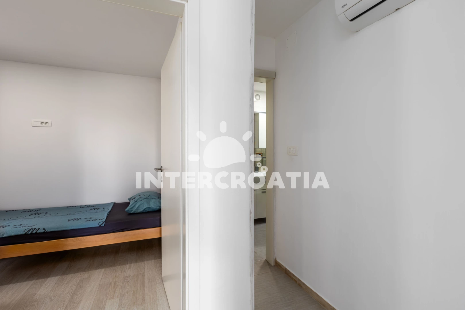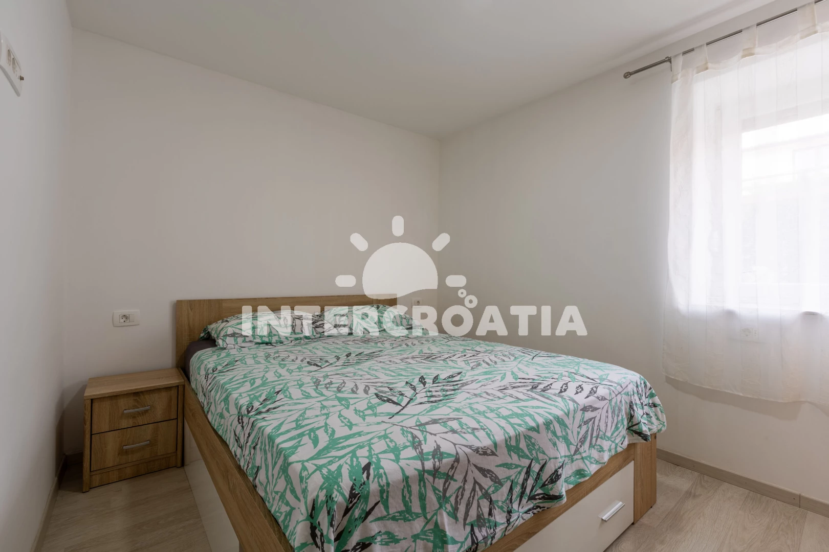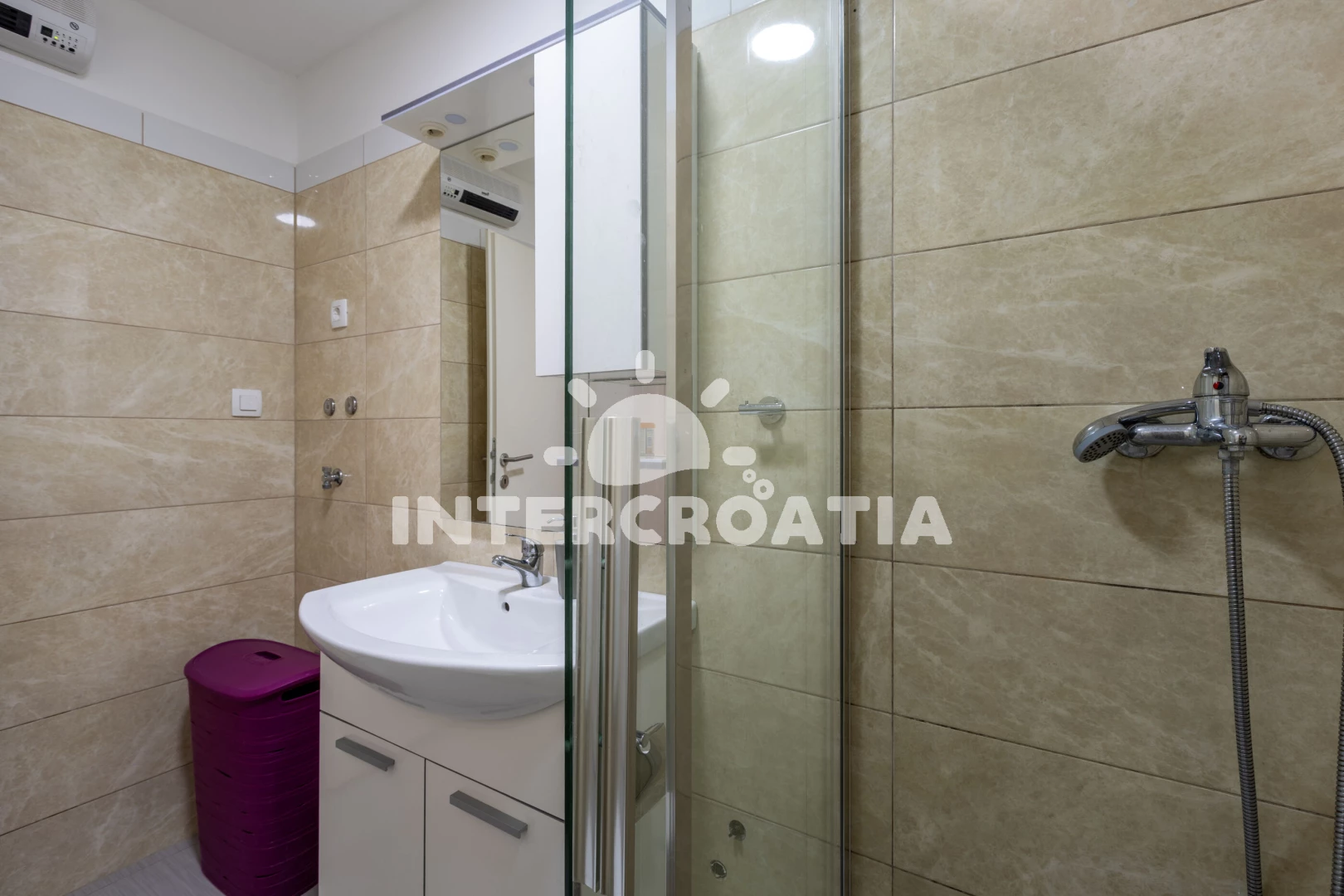 Apartmán se nachází 500 m od moře a pláže. Pláž je skalnatá, oblázková, větší kamení a betonové desky. Parkování je před domem.
