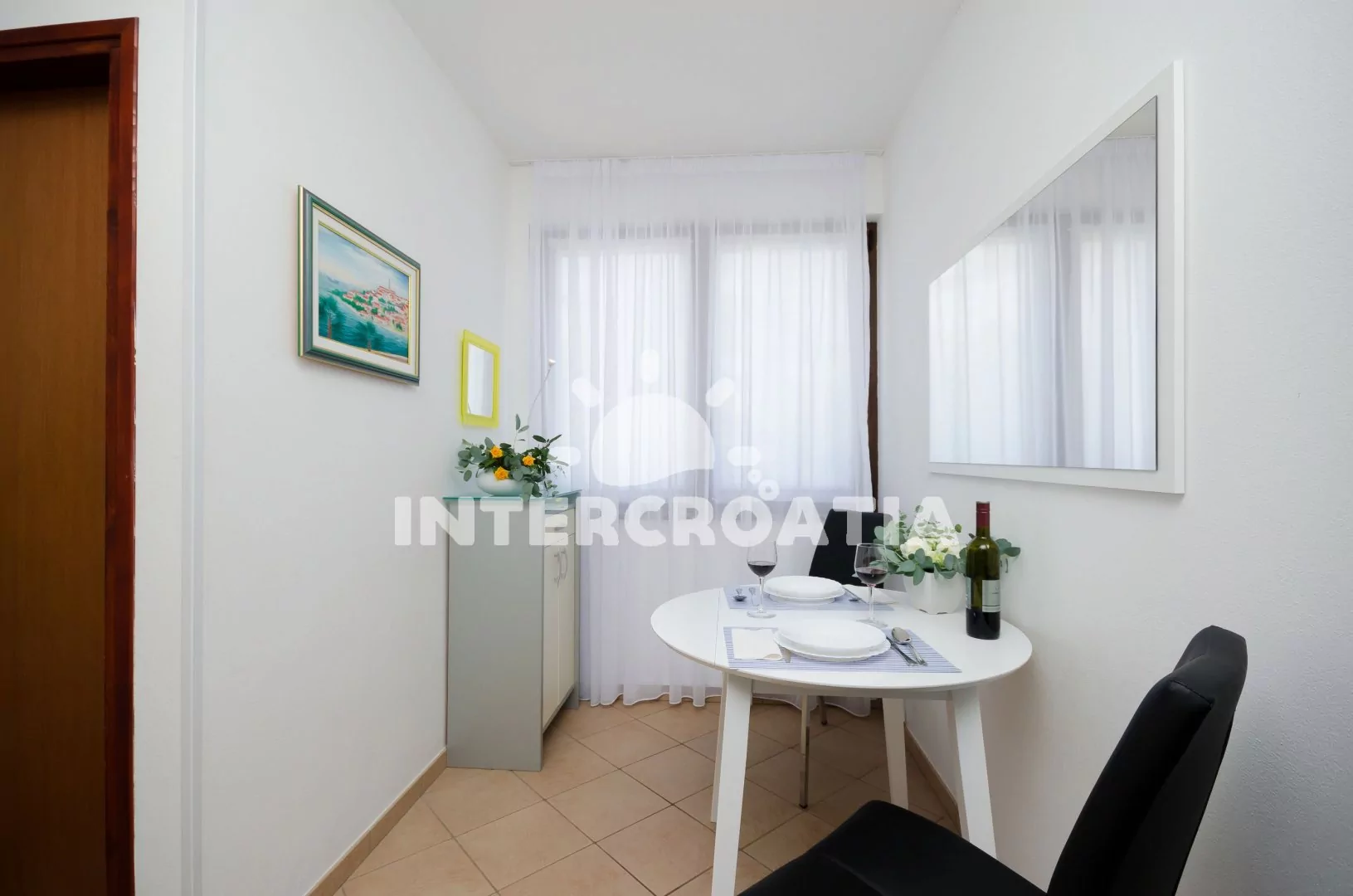 Dvouposchoďový apartmán (30 m2) s terasou, venkovním posezením a výhledem do klidné ulice je vhodný pro 2 osoby. Vstup: chodba s jídelním stolem, kuchyňským koutem a schody do patra. Kuchyňská linka je vybavena sklokeramickou varnou deskou, rychlovarnou konvicí, mikrovlnnou troubou, kávovarem, nádobím a lednicí s mrazákem. Ložnice s dvoulůžkem, televizí se satelitním programem, klimatizací a vstupem na terasu. Koupelna se sprchovým koutem, umyvadlem, fénem a wc. Hostům je k dispozici parkování u objektu zdarma.