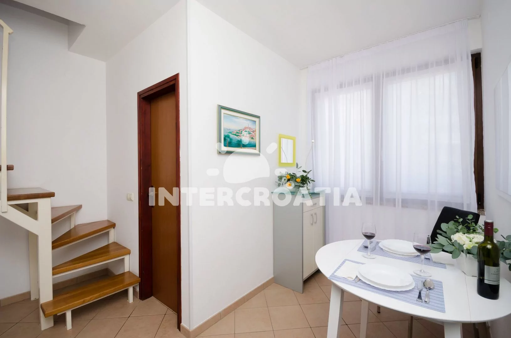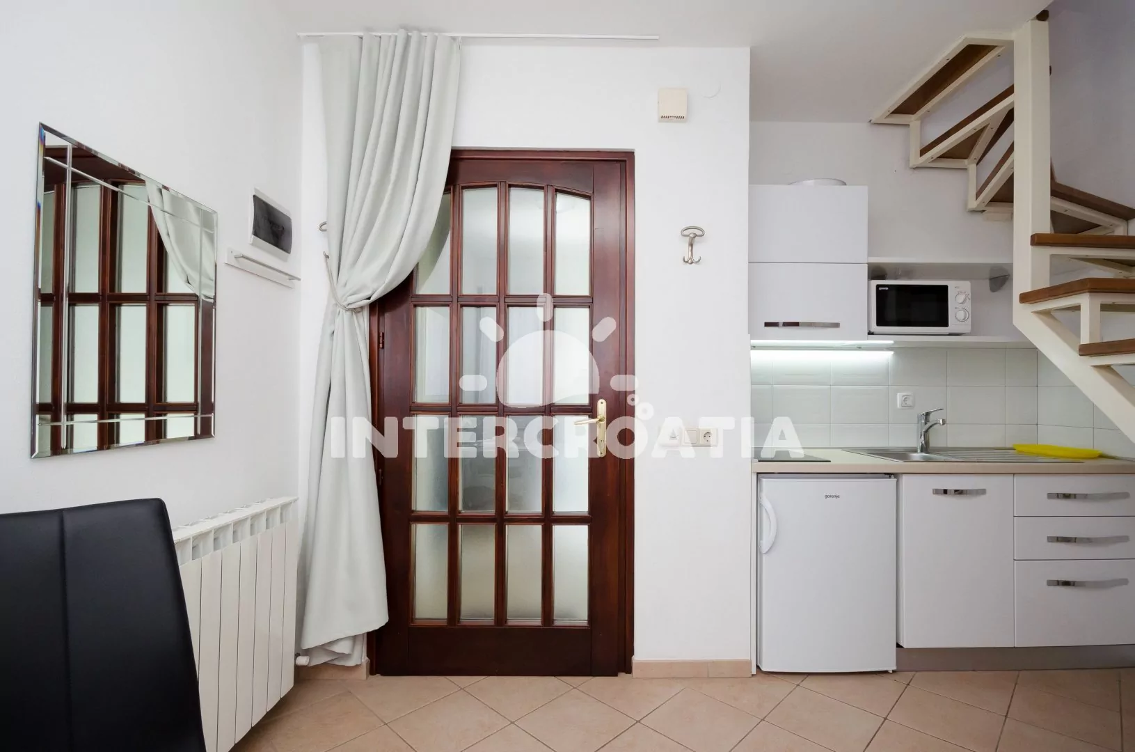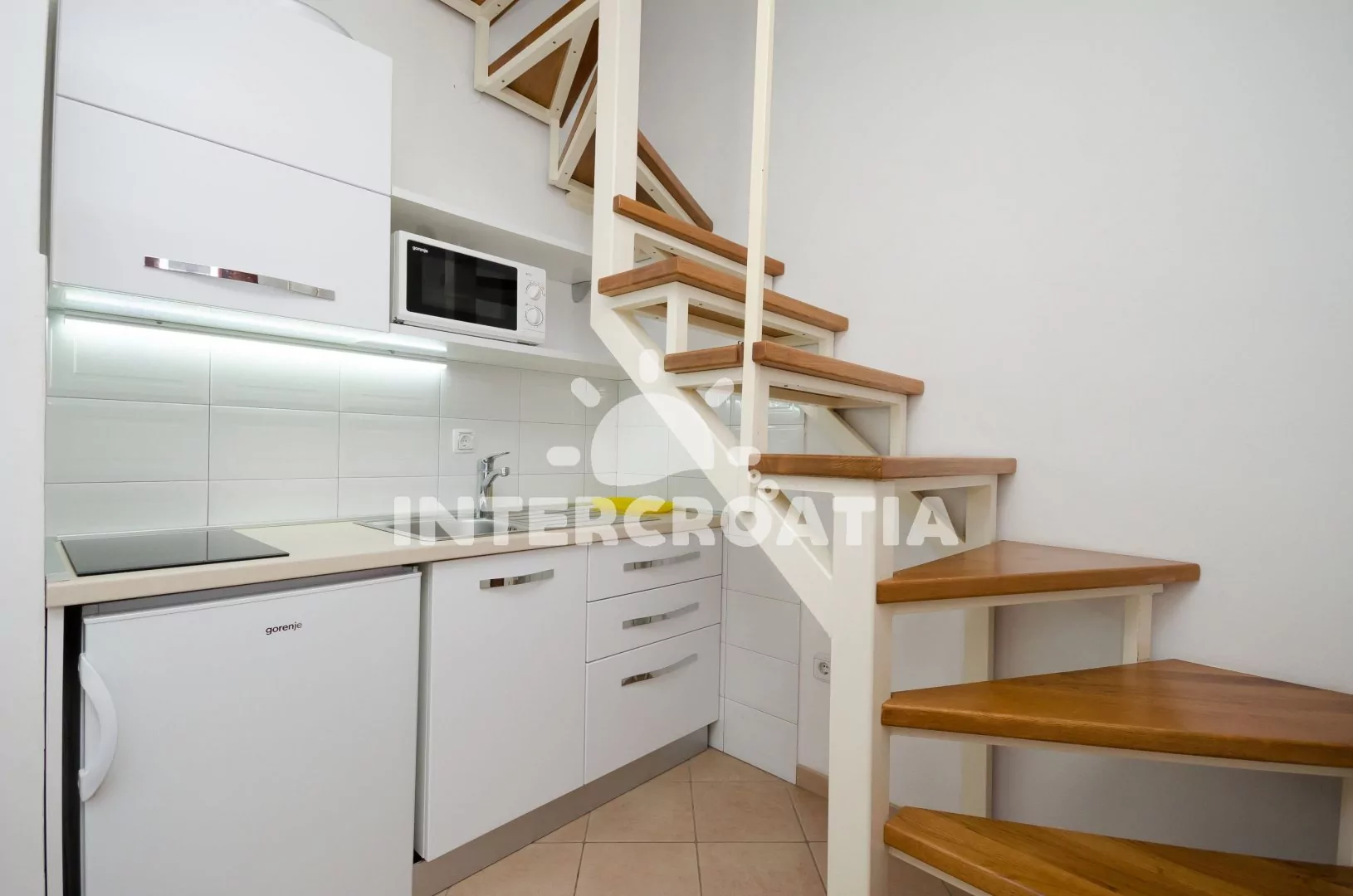 Dvouposchoďový apartmán (30 m2) s terasou, venkovním posezením a výhledem do klidné ulice je vhodný pro 2 osoby. Vstup: chodba s jídelním stolem, kuchyňským koutem a schody do patra. Kuchyňská linka…