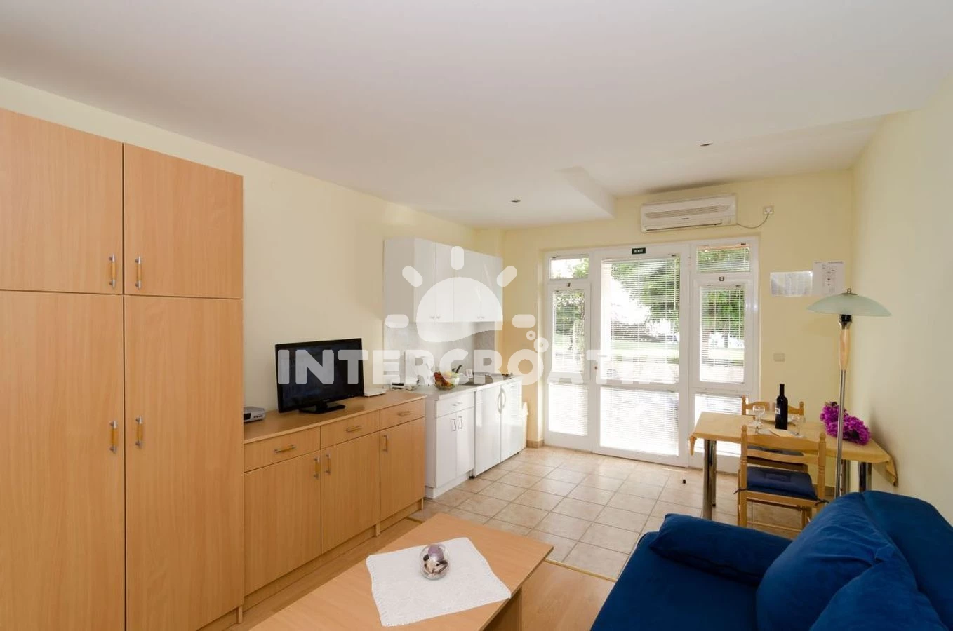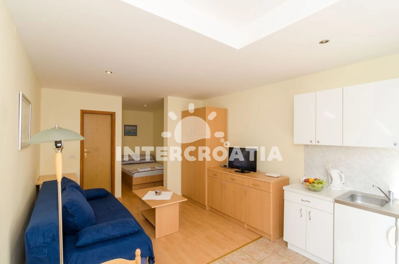 Apartmán (30 m2) typu studio s terasou. Nachází se v přízemí objektu. Kuchyňská linka je vybavena varnou deskou, toustovačem, rychlovarnou konvicí, nádobím, lednicí. K dispozici dvoulůžko, televize se satelitním programem, radio, žehlička. Koupelna se sprchovým koutem, umyvadlem, fénem a WC.