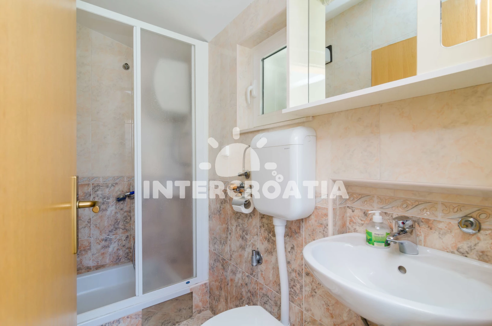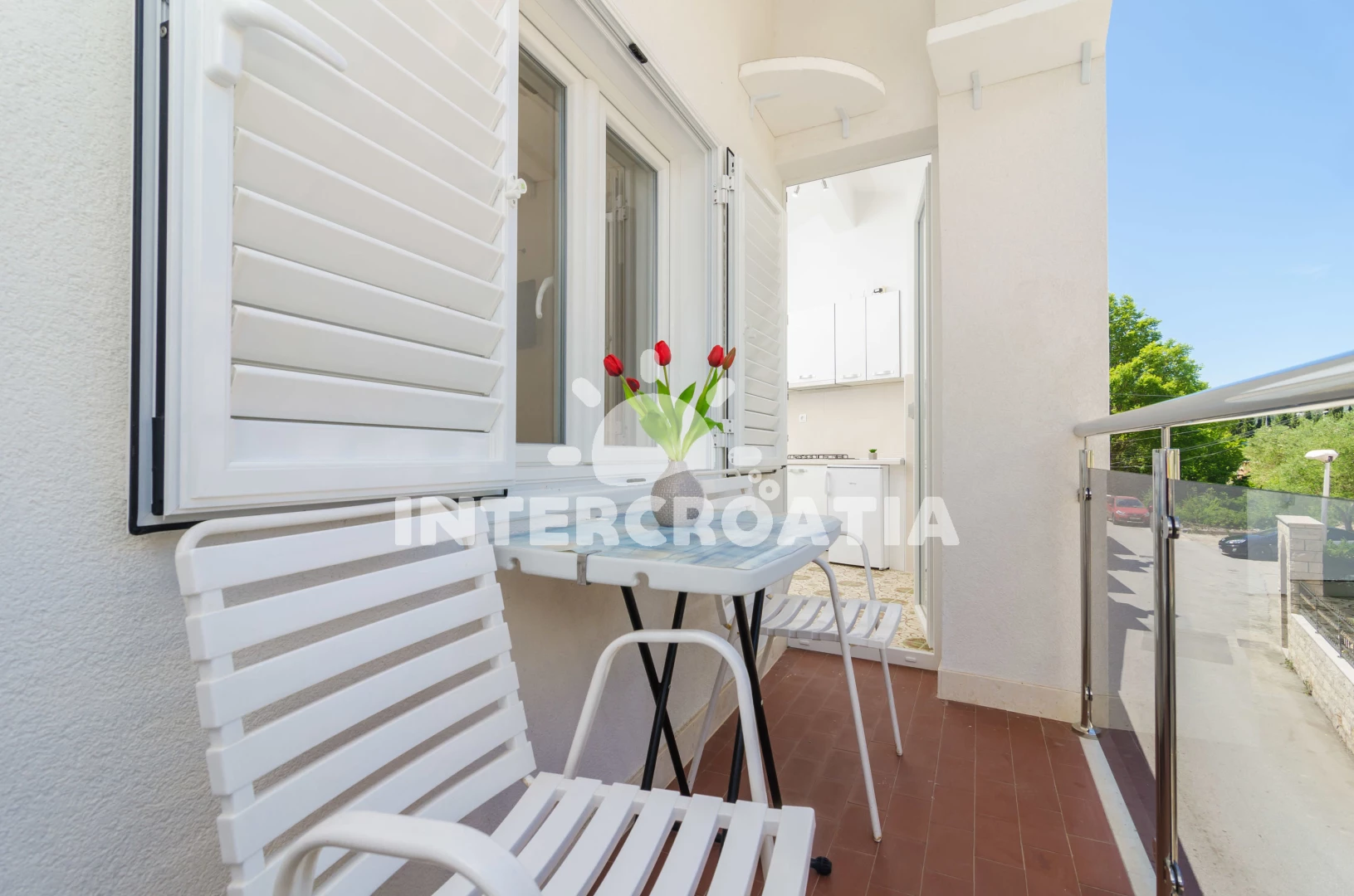 Apartmán se nachází 500 m od moře a pláže. Pláž je skalnatá, oblázková, větší kamení a betonové desky. U objektu je k dispozici společná zahrada s posezením a grilem.