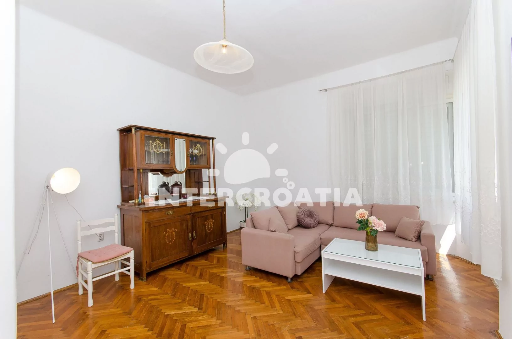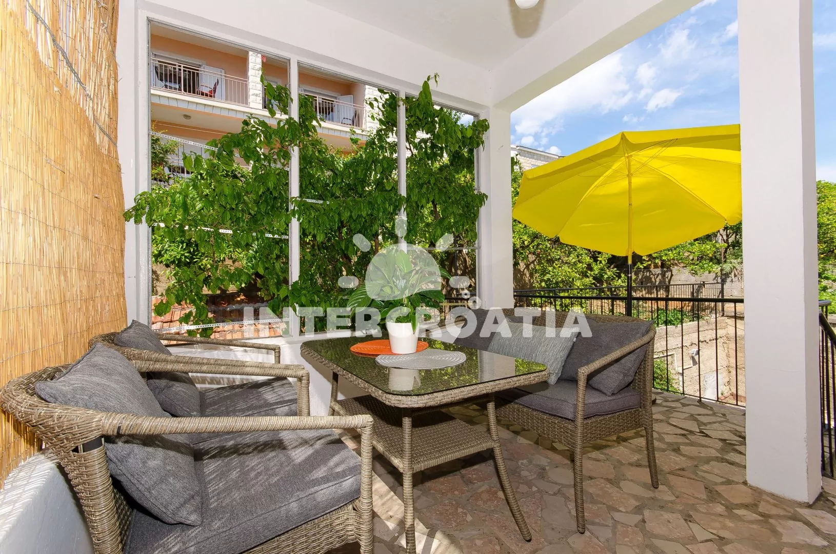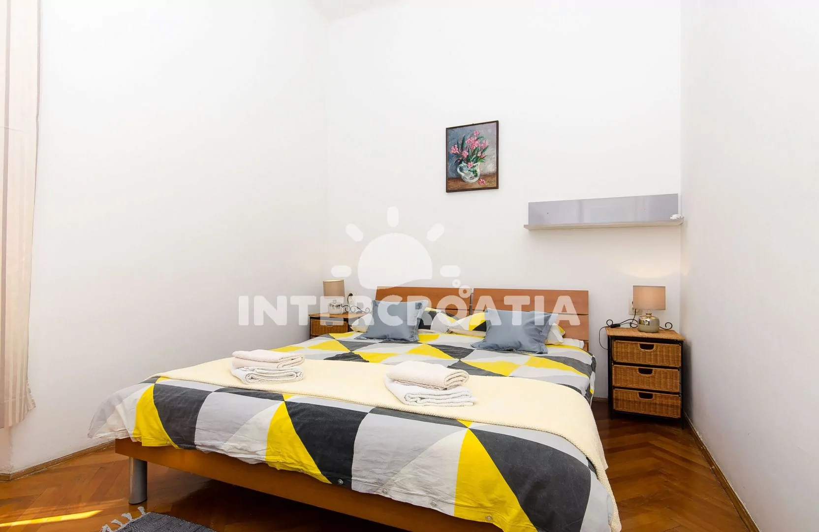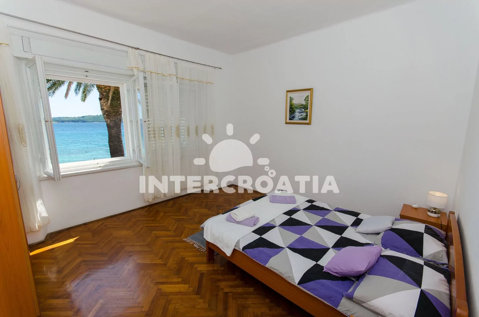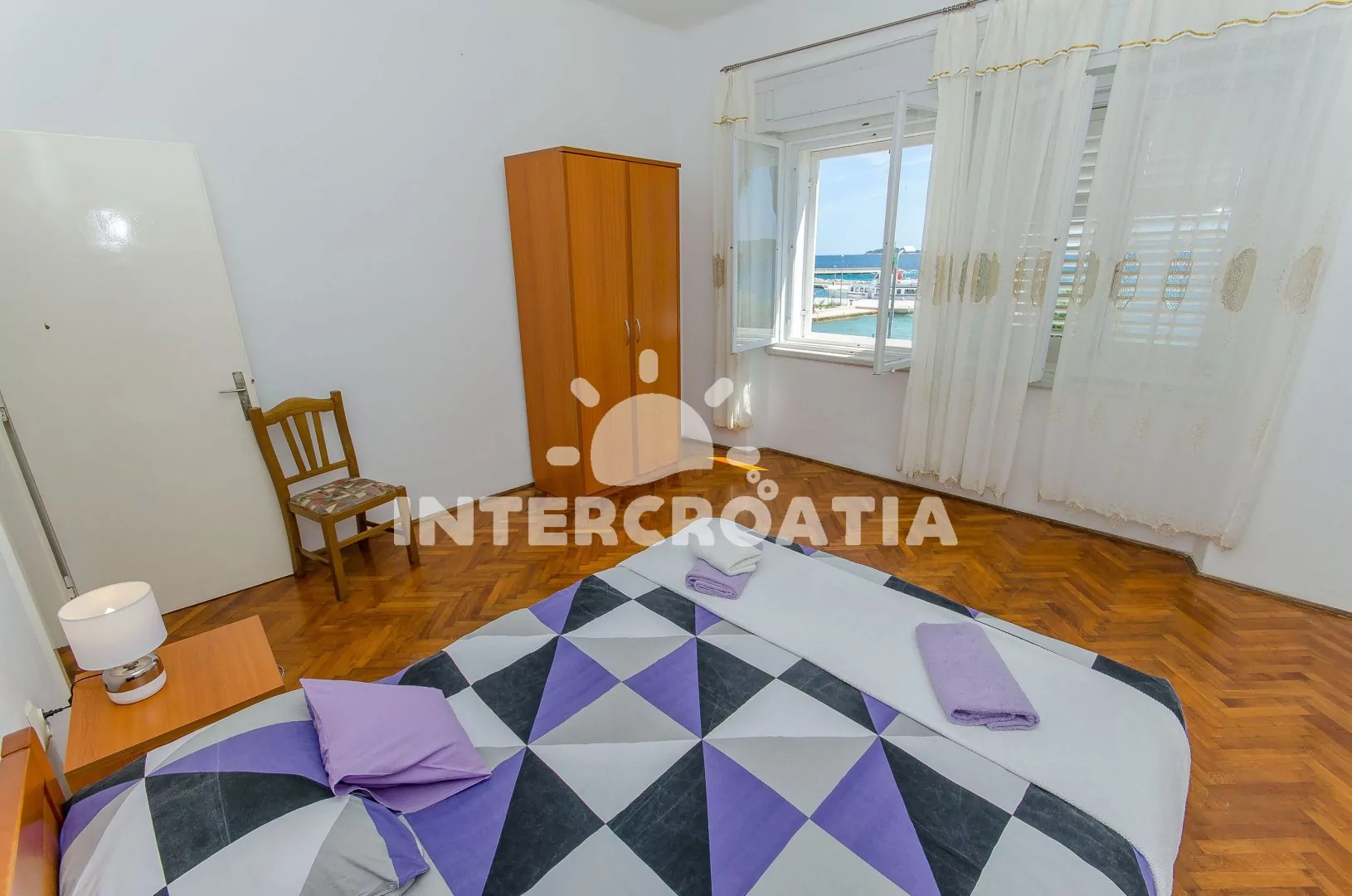 Apartmán (85 m2) s balkonem, posezením a výhledem na moře se nachází v 1. patře domu. Apartmán má 2 ložnice a je vhodný pro 4 až 5 osob. Kuchyň je vybavena jídelním stolem pro 4 osoby, kuchyňskou linkou s varnou deskou, digestoří, vstavěnou troubou, myčkou na nádobí, rychlovarnou konvicí, kávovarem, nádobím a lednicí s mrazákem. Obývací pokoj s rohovou pohovkou (rozložitelná na extra lůžko pro 1 osobu), televizí se satelitním programem a klimatizací. První i druhá ložnice je vybavena vždy s jedním dvoulůžkem. Koupelna se sprchovým koutem, umyvadlem, fénem, pračkou a wc. Hostům je k dispozici parkování u objektu zdarma.