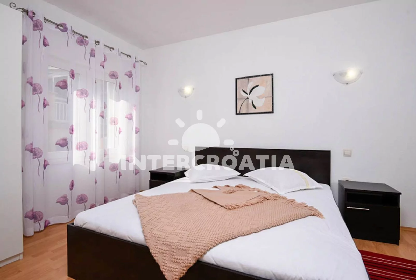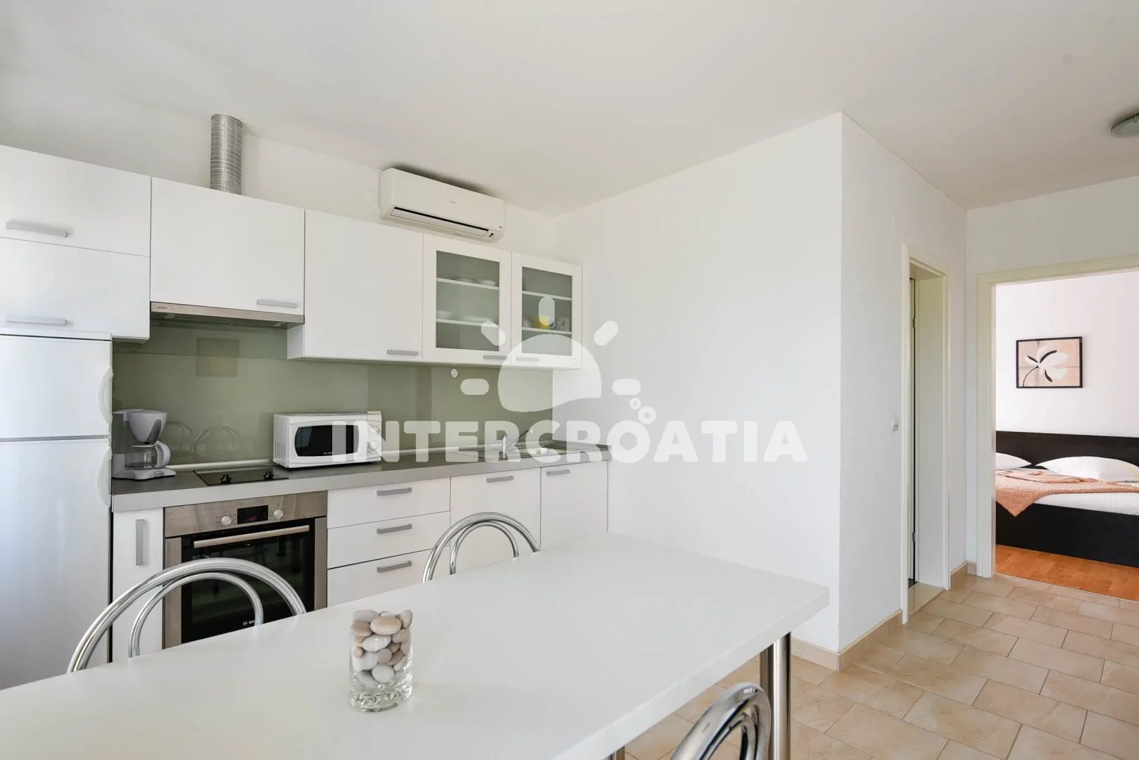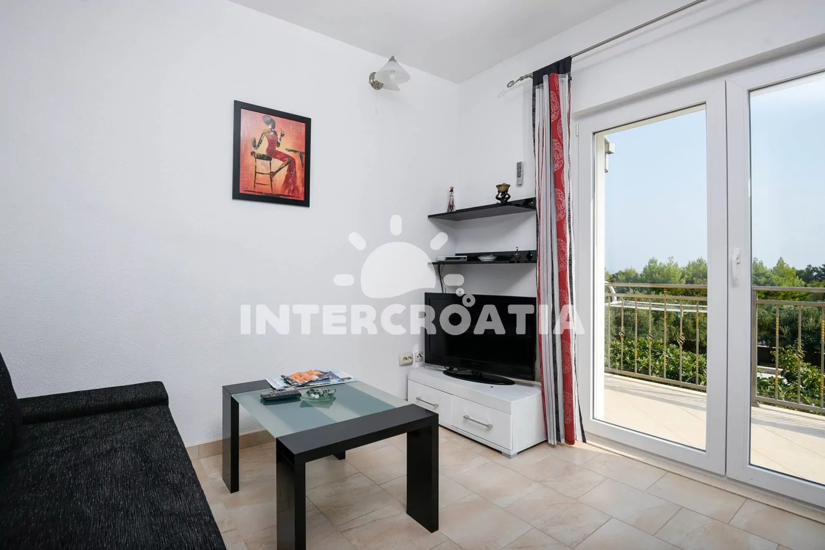 Apartmán (45 m2) s balkonem, posezením a částečným výhledem na moře se nachází v 1. patře domu. Apartmán má 1 ložnici a je vhodný pro 2 až 4 osoby. Obývací pokoj je spojený s kuchyní. Kuchyňská linka je vybavena varnou deskou, digestoří, vestavěnou troubou, myčkou na nádobí, mikrovlnnou troubou, rychlovarnou konvicí, toustovačem, kávovarem, nádobím a lednicí s mrazákem. Obývací pokoj s jídelním stolem, pohovkou (rozložitelná na extra lůžko pro 2 osoby), televizí, klimatizací a vstupem na balkon. Ložnice s jedním dvoulůžkem. Koupelna se sprchovým koutem, umyvadlem, pračkou, fénem a wc. Hostům je k dispozici parkování u objektu zdarma.