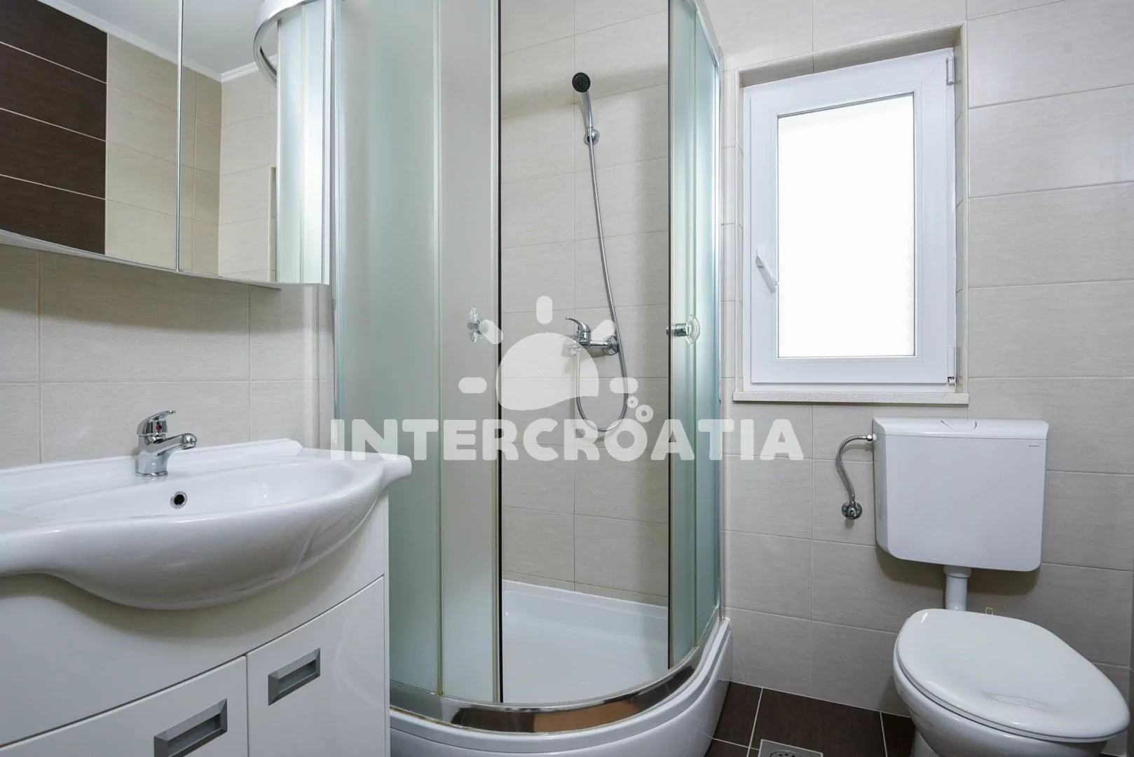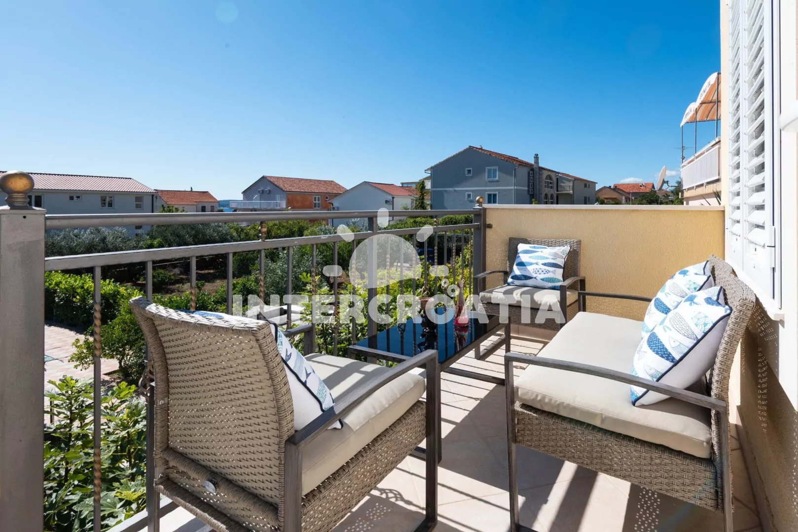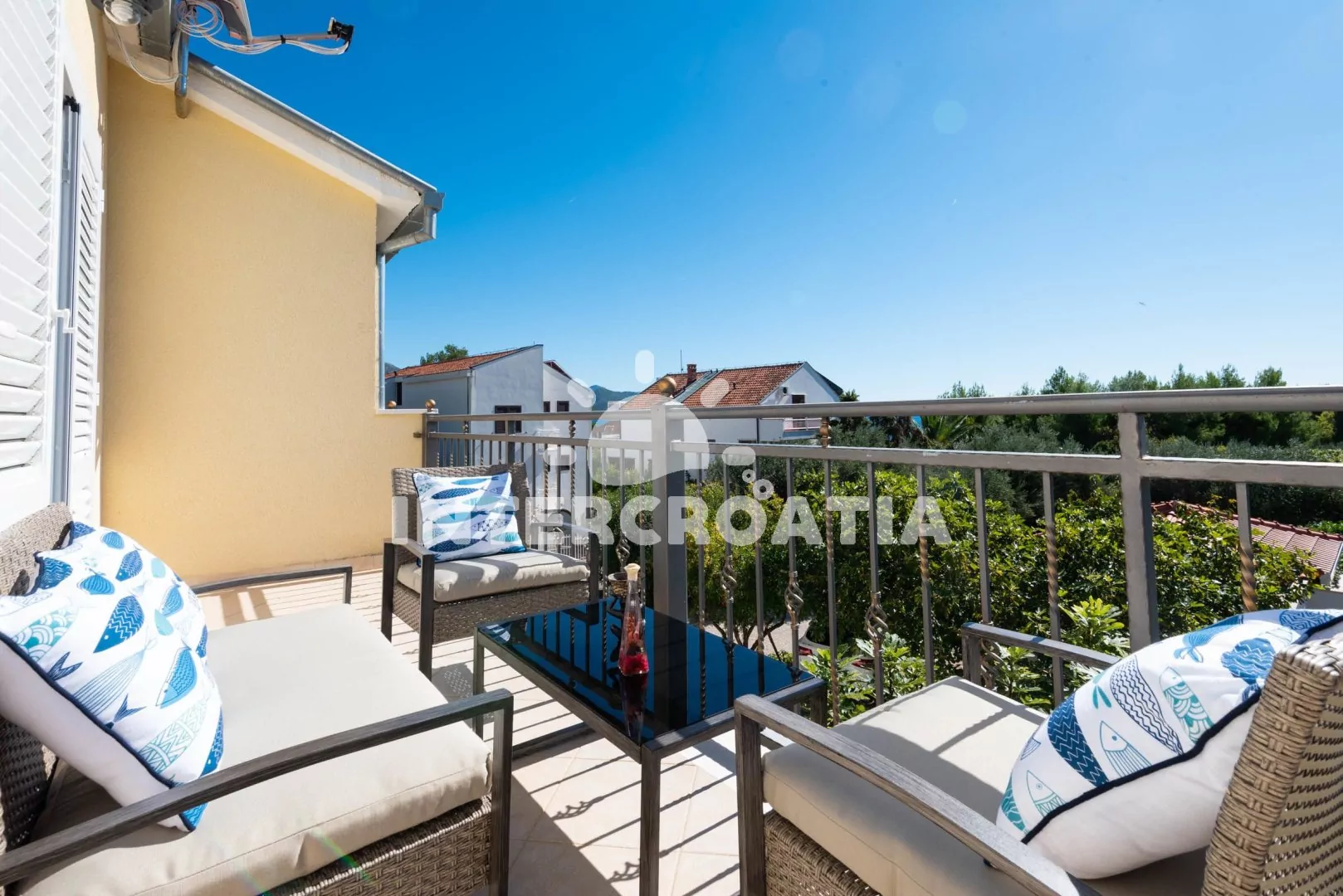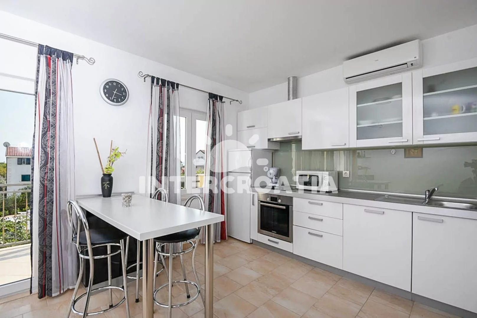 Apartmán (45 m2) s balkonem, posezením a částečným výhledem na moře se nachází v 1. patře domu. Apartmán má 1 ložnici a je vhodný pro 2 až 4 osoby. Obývací pokoj je spojený s kuchyní. Kuchyňská linka je vybavena varnou deskou, digestoří, vestavěnou troubou, myčkou na nádobí, mikrovlnnou troubou, rychlovarnou konvicí, toustovačem, kávovarem, nádobím a lednicí s mrazákem. Obývací pokoj s jídelním stolem, pohovkou (rozložitelná na extra lůžko pro 2 osoby), televizí, klimatizací a vstupem na balkon. Ložnice s jedním dvoulůžkem. Koupelna se sprchovým koutem, umyvadlem, pračkou, fénem a wc. Hostům je k dispozici parkování u objektu zdarma.