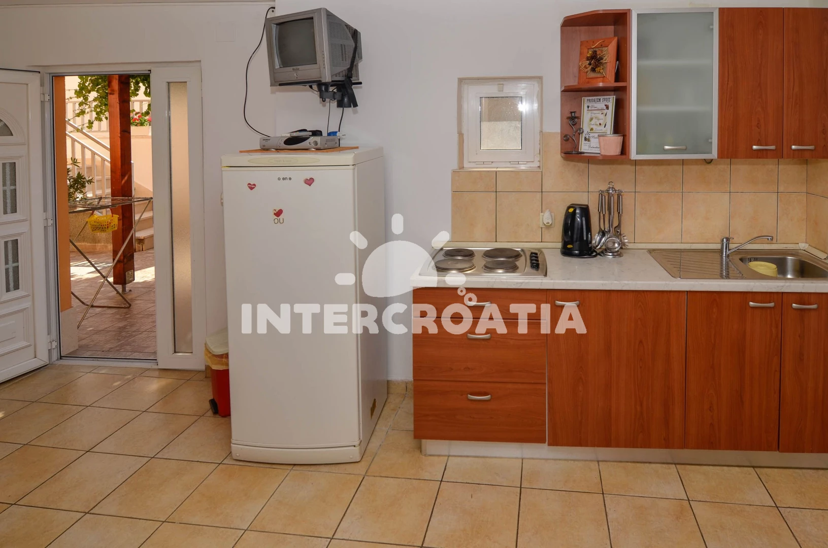 Apartmán se nachází 200 m od moře a pláže. Pláž je oblázková a betonové desky. U objektu je k dispozici společná zahrada s posezením a grilem. Parkování je před domem.