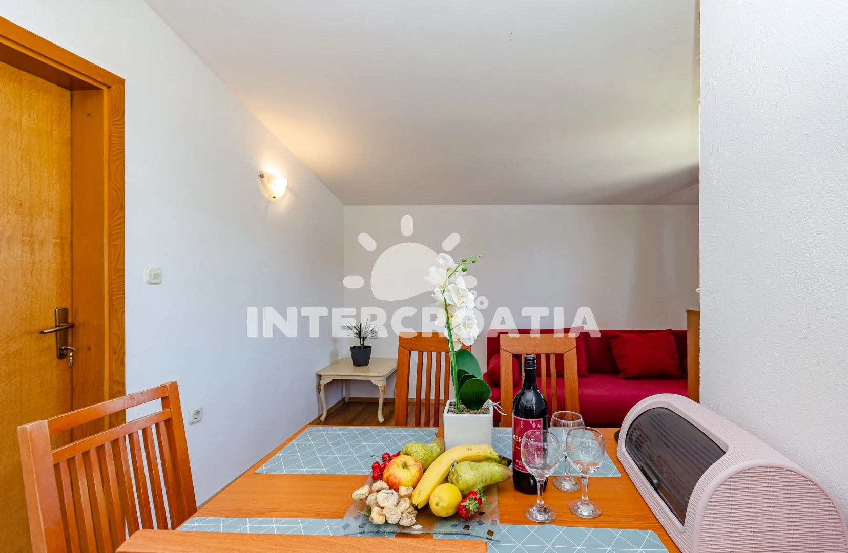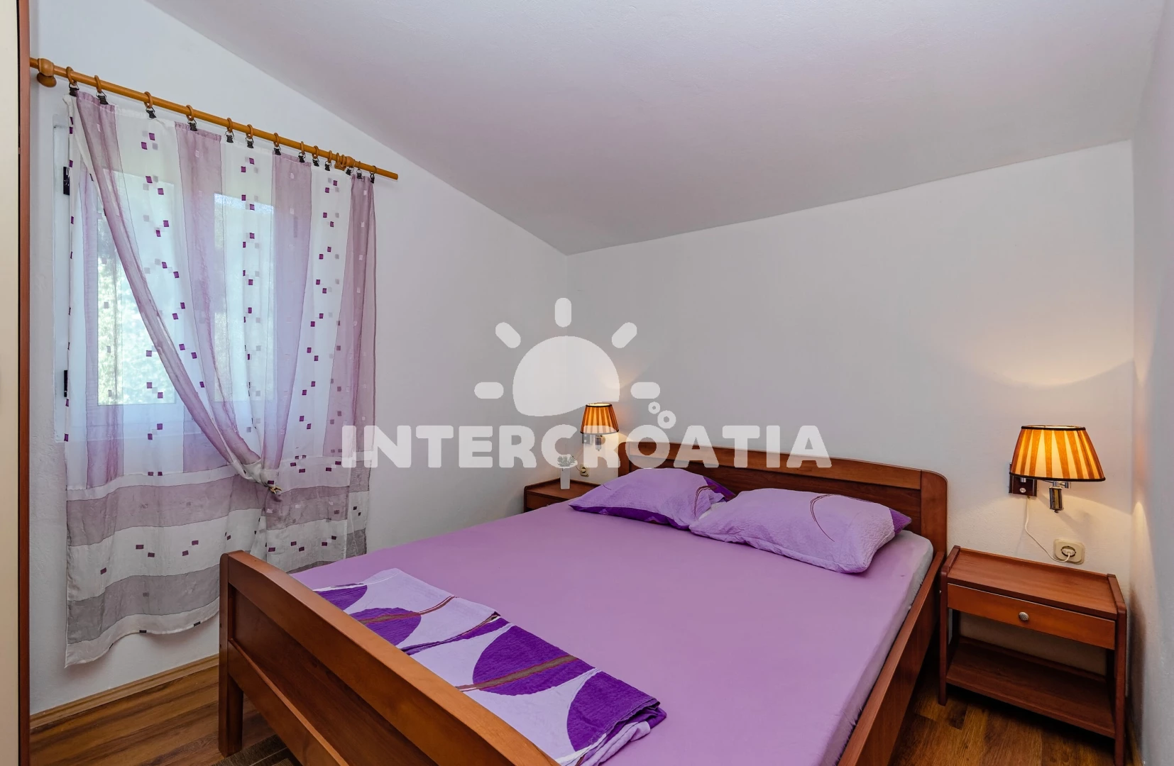 Apartmán (30 m2) s terasou, a výhledem na moře. Nachází se v 1. patře objektu. Apartmán má 1 ložnici a je vhodný pro až 4 osoby. Kuchyňská linka je vybavena varnou deskou, mikrovlnnou troubou, rychlovarnou konvicí, nádobím, lednicí, mrazákem. V obývací místnosti je rozložitelná pohovka (extra lůžko pro 2 osoby). K dispozici televize se satelitním programem, žehlička. Ložnice s dvoulůžkem. Koupelna se sprchovým koutem, umyvadlem, fénem a WC. Hostům je k dispozici parkování u objektu zdarma.