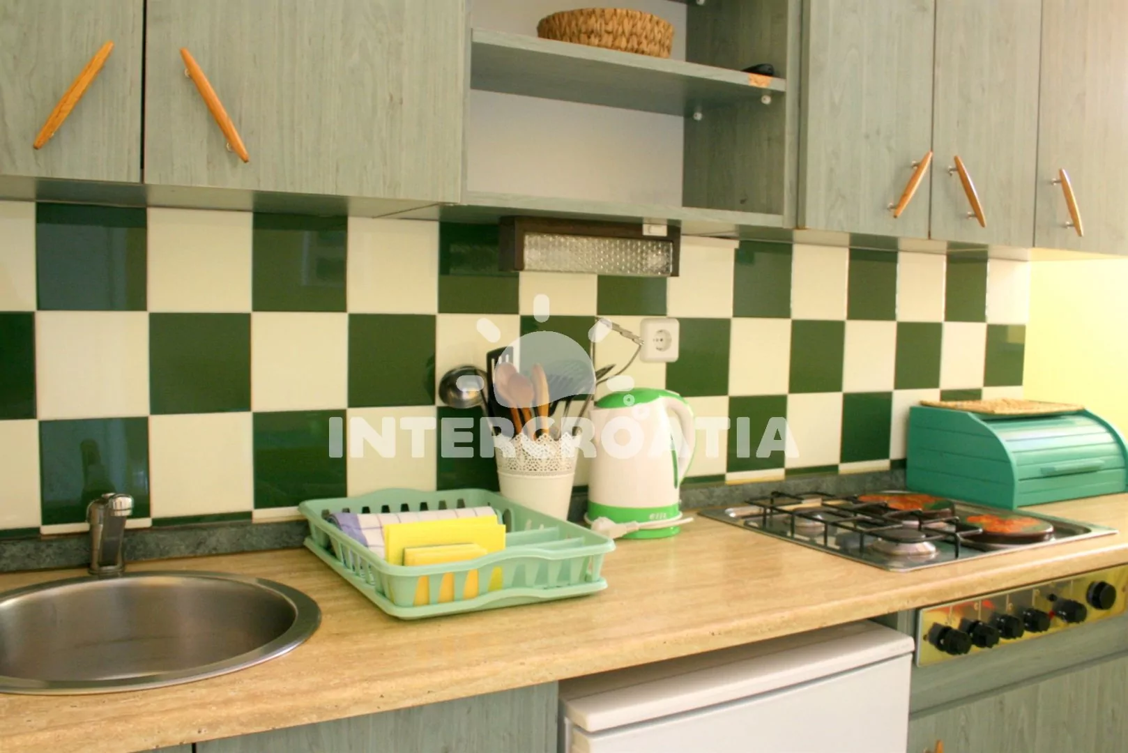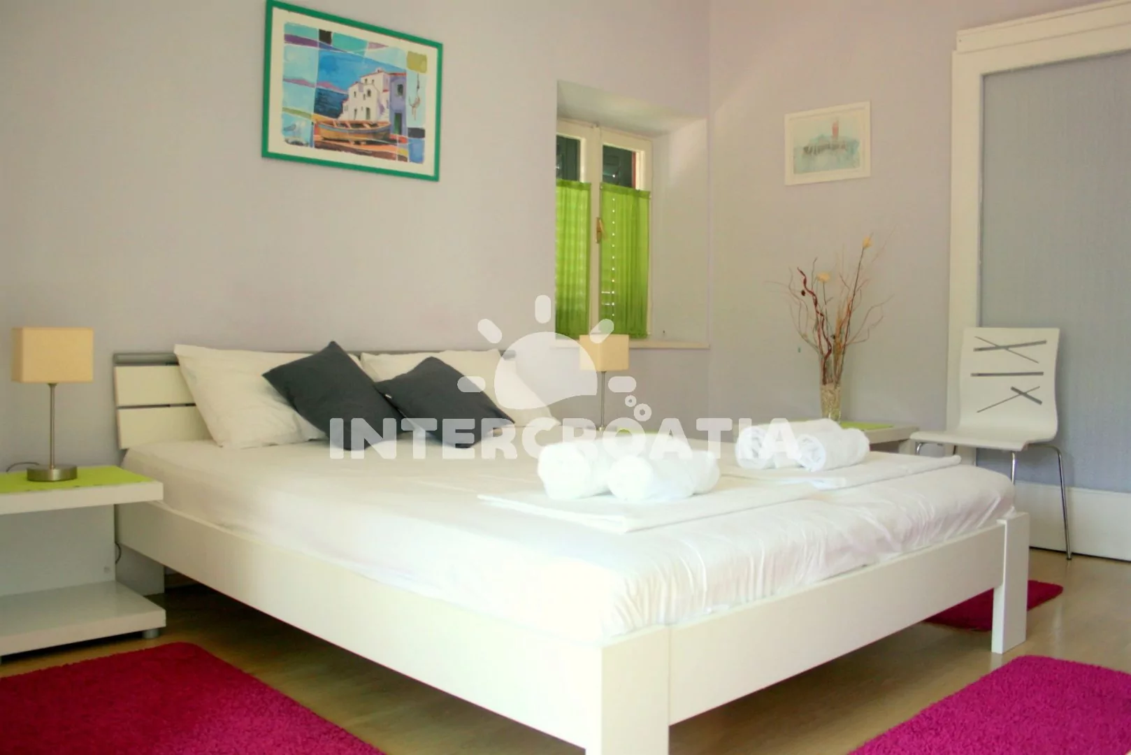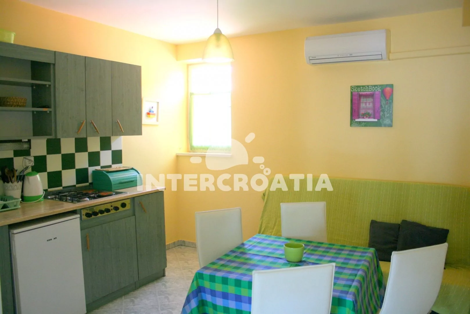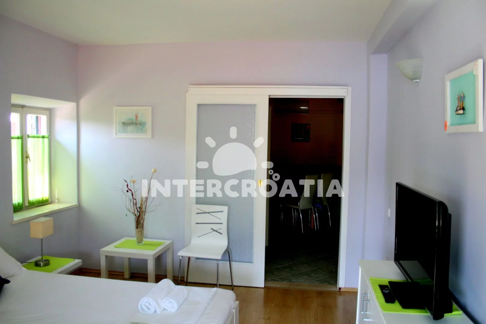 Apartmán pro 2 až 4 osoby s výhledem na moře a terasou s venkovním posezením se nachází v prvním patře. Obývací pokoj je spojený s kuchyní. Kuchyňská linka je vybavena sporákem, rychlovarnou konvicí, kávovarem, nádobím a lednicí. Obývací pokoj s jídelním stolem pro 4 osoby, rozložitelnou pohovkou (extra lůžko pro 2 osoby), klimatizací a vstupem na balkon. Ložnice s jedním dvoulůžkem a televizí se satelitním programem. Koupelna se sprchovým koutem, umyvadlem, fénem a wc. Hosté mají k dispozici parkování u objektu zdarma.