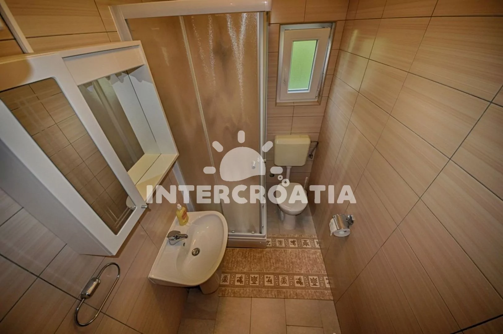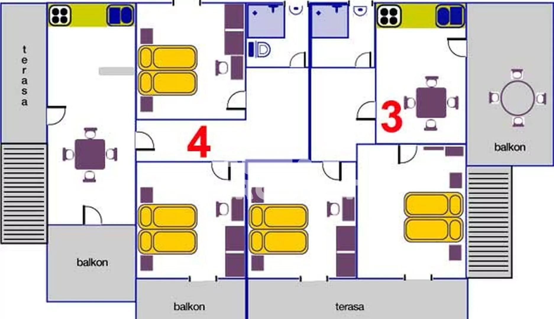Apartmán (60 m2) s terasou/balkonem, venkovním posezením a výhledem na moře se nachází v 1. patře domu. Apartmán má 2 ložnice a je vhodný pro až 4 osoby. Obývací místnost je spojena s kuchyní. Kuchyňská linka je vybavena varnou deskou, digestoří, vestavěnou troubou, rychlovarnou konvicí, toustovačem, kávovarem, nádobím a lednicí s mrazákem. Obývací místnost s jídelním stolem, televizí se satelitním programem, klimatizací a vstupem na terasu. První ložnice s dvoulůžkem a vstupem na balkon. Druhá ložnice se dvěma jednolůžky. Koupelna se sprchovým koutem, umyvadlem, fénem a wc.