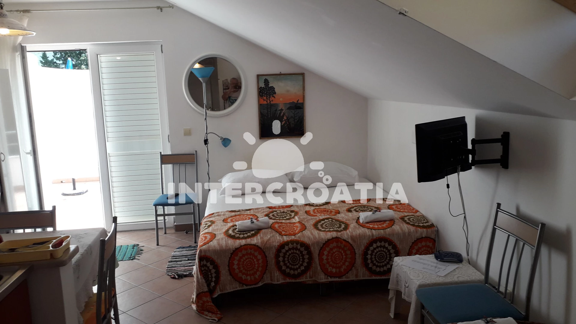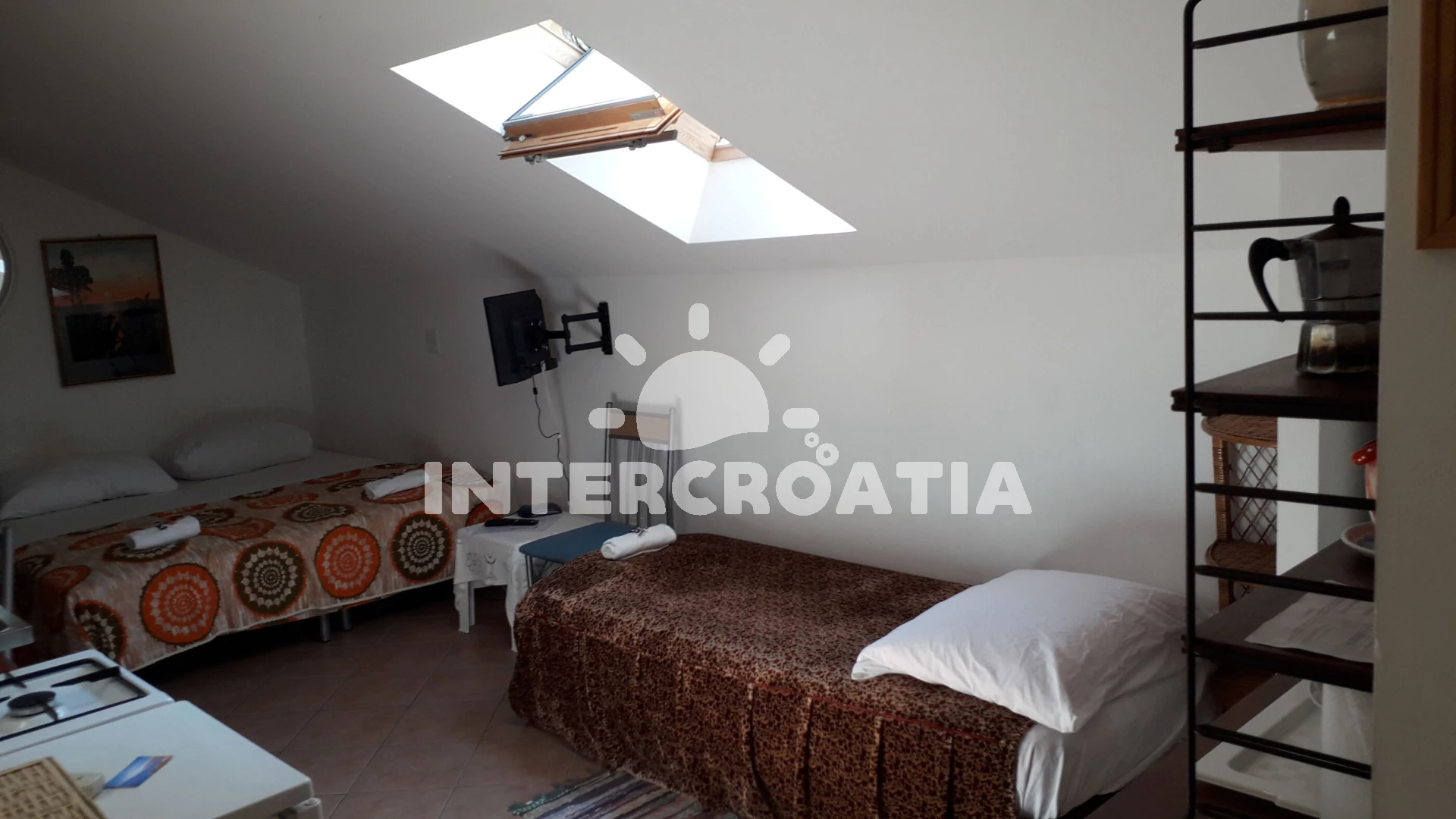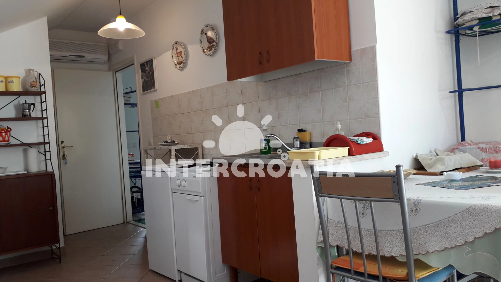 Apartmán se nachází 50 m od moře a pláže. Pláž je oblázková a betonové desky. U objektu je k dispozici společná zahrada s posezením a grilem. Parkování je před domem.