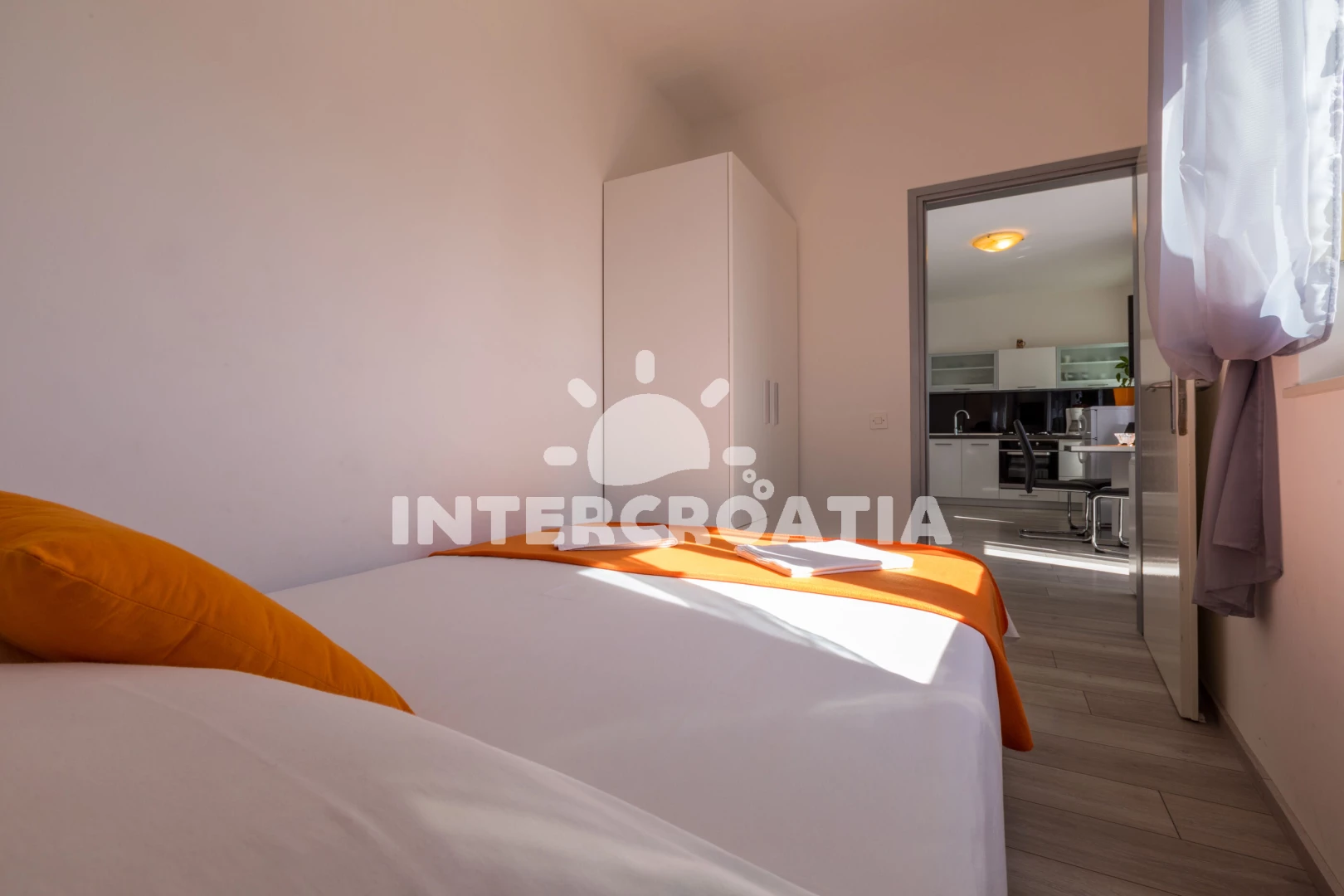 Apartmán (40 m2) s balkonem, a výhledem na moře. Nachází se v 1. patře objektu. Apartmán má 1 ložnici a je vhodný pro až 3 osoby. Kuchyňská linka je vybavena varnou deskou, kávovarem, toustovačem, mikrovlnnou troubou, rychlovarnou konvicí, nádobím, lednicí, mrazákem. V obývací místnosti je rozložitelná pohovka (extra lůžko pro 1 osobu). K dispozici televize se satelitním programem, žehlička. Ložnice s dvoulůžkem. Koupelna se sprchovým koutem, umyvadlem, fénem a WC.