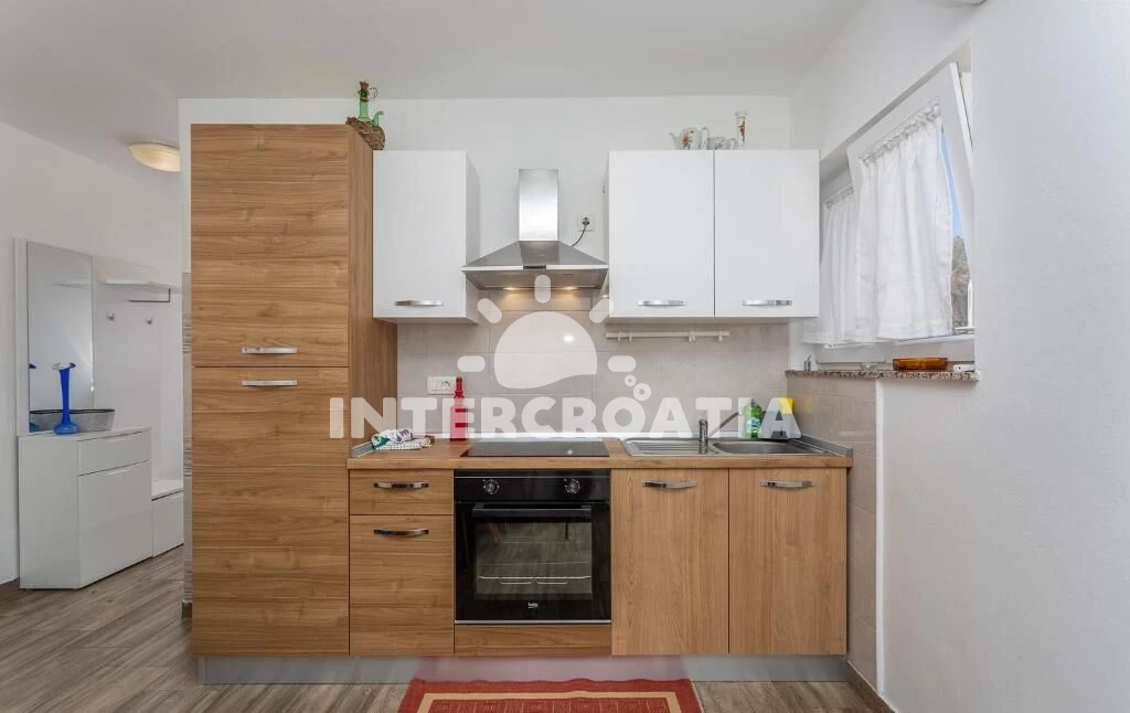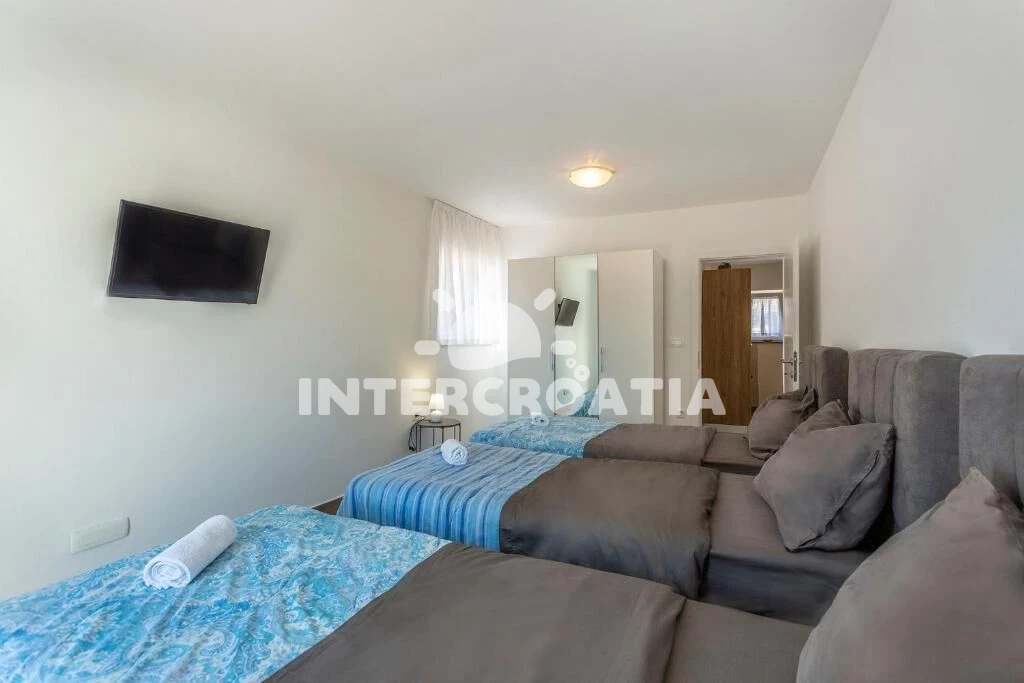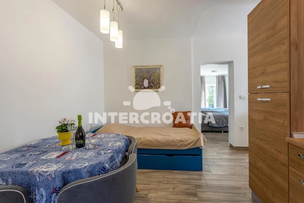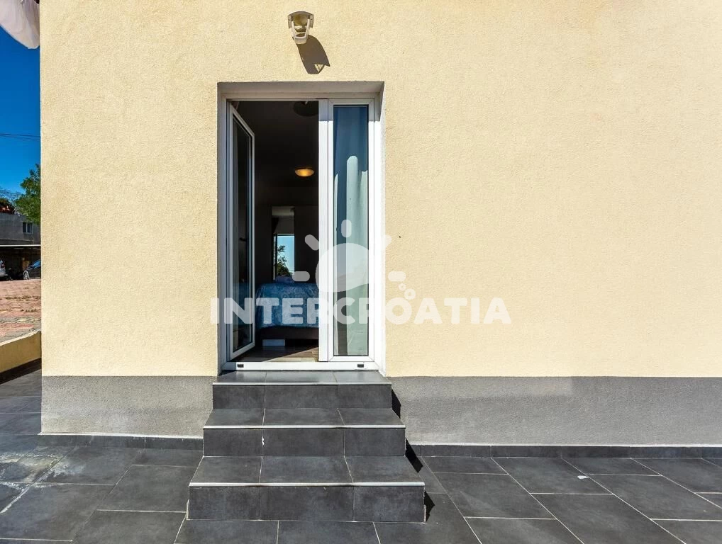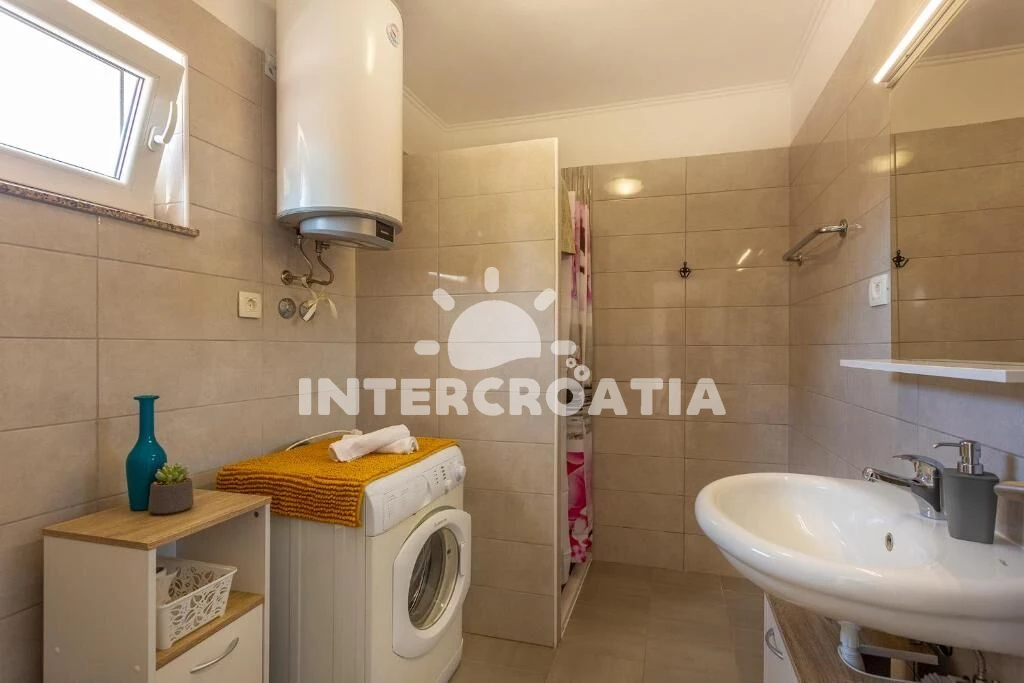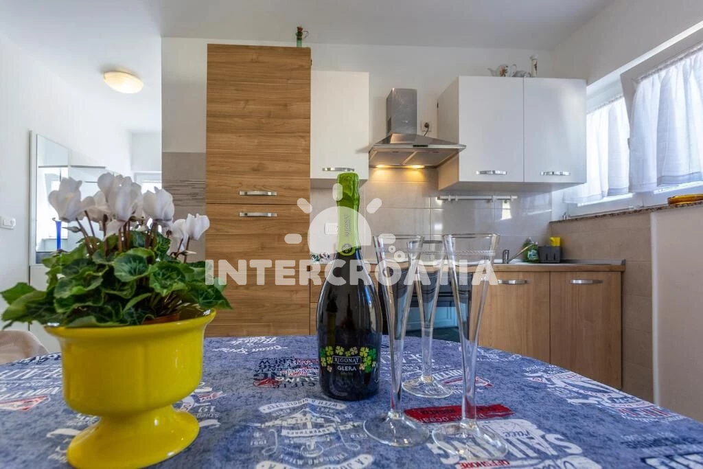 Apartmán se nachází 21000 m od moře a pláže. Pláž je skalnatá, oblázková, větší kamení a betonové desky. U objektu je k dispozici společná zahrada s posezením a grilem. Parkování je před domem.