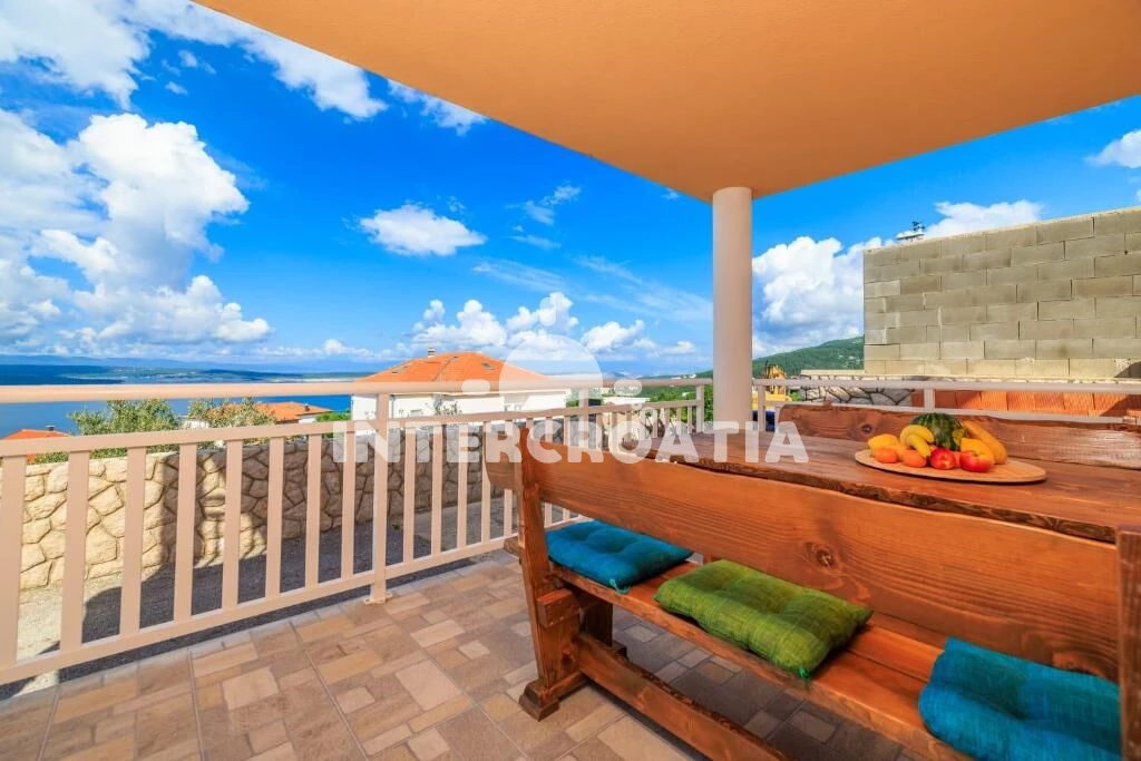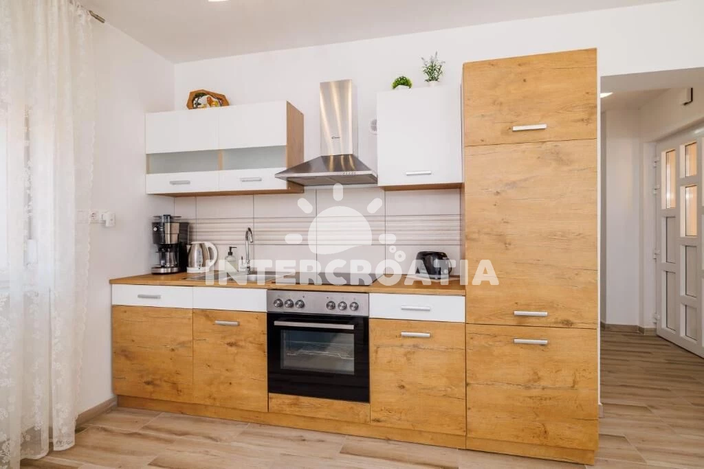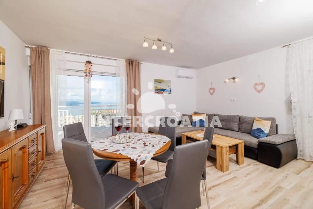 Apartmán (100 m2) s terasou, a výhledem na moře. Nachází se v přízemí objektu. Apartmán má 2 ložnice a je vhodný pro až 5 osob. Kuchyňská linka je vybavena varnou deskou, troubou, toustovačem, myčkou…