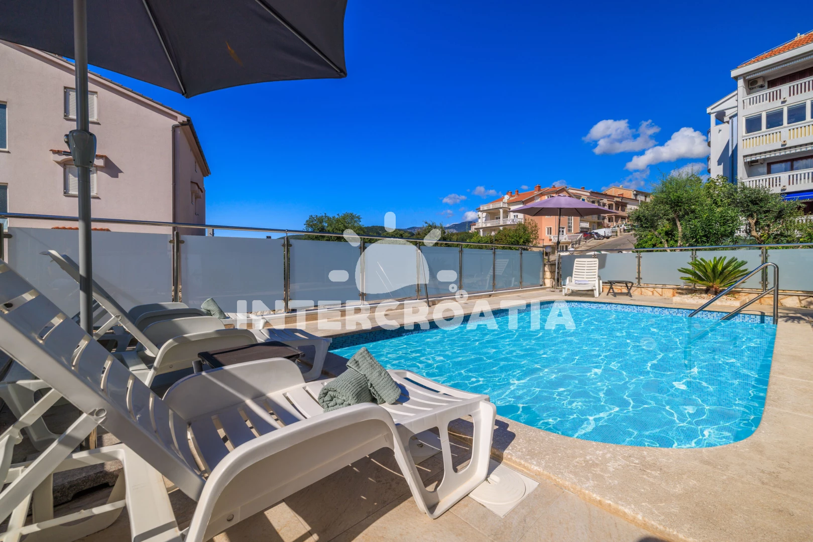 Apartmán se nachází 800 m od moře a pláže. Pláž je skalnatá, oblázková a betonové desky. Apartmán disponuje bazénem s lehátky pro ubytované hosty. U objektu je k dispozici společná zahrada s posezením a grilem. Parkování je před domem.