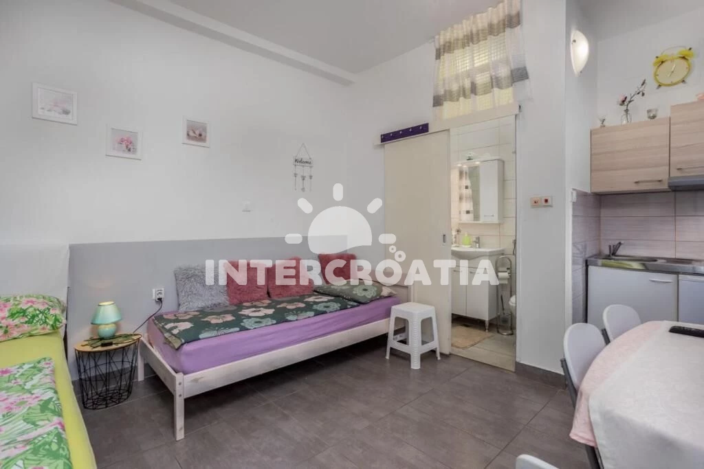 Apartmán se nachází 750 m od moře a pláže. Pláž je skalnatá, oblázková a betonové desky.