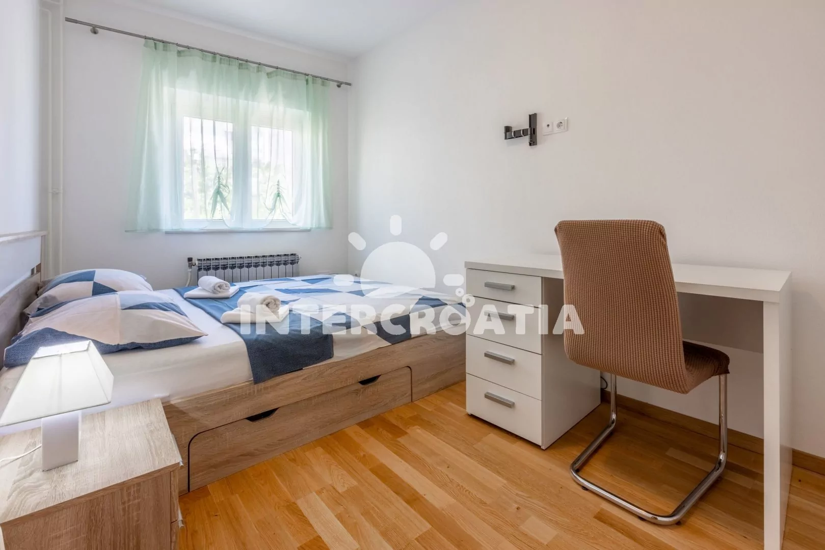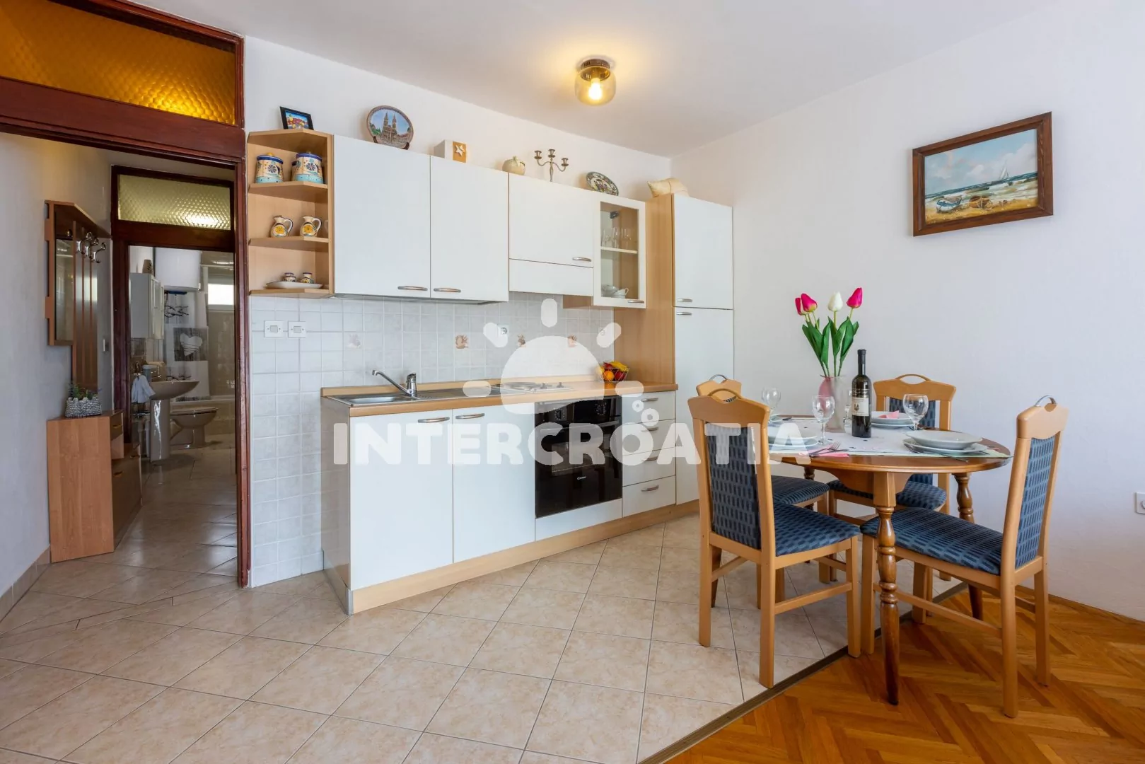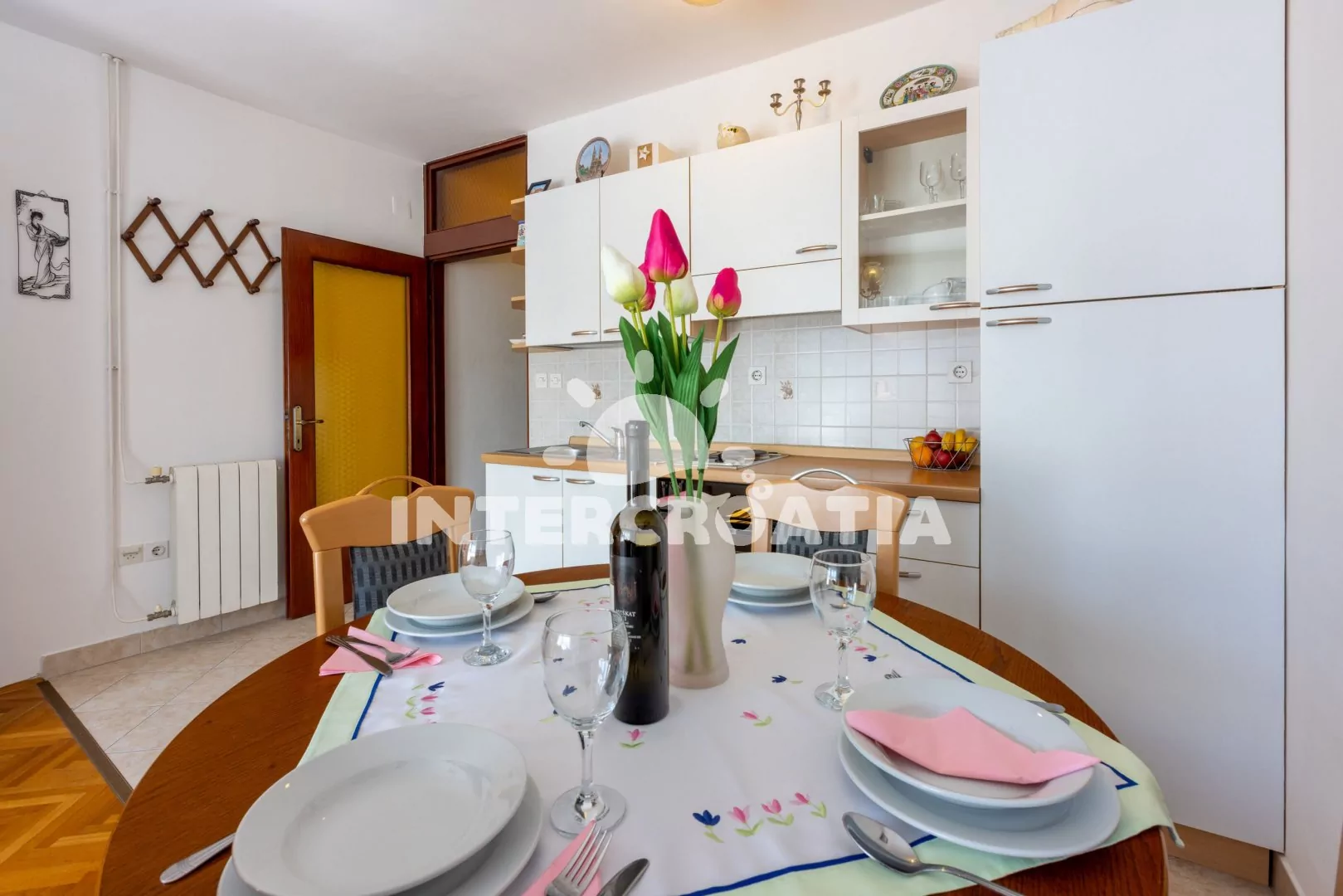 Apartmán s vlastní balkonem a venkovním posezením se nachází ve 2. patře domu. Apartmán má 1 ložnici a je vhodný pro až 4 osoby. Kuchyň je spojena s obývacím pokojem. Kuchyňský kout je vybaven nádobím, elektrickým dvouplotýnkovým sporákem, vestavěnou troubou, toustovačem, kávovarem, rychlovarnou konvicí a lednicí s mrazákem. Obývací místnost s jídelním stolem, televizí se satelitním programem, jedním dvoulůžkem a vstupem na balkon. Ložnice s jedním dvoulůžkem. Koupelna se sprchovým koutem, umyvadlem a wc. K dispozici: WiFi, klimatizace a rádio. Parkovací místo na požádání (50 - 150 m od domu).