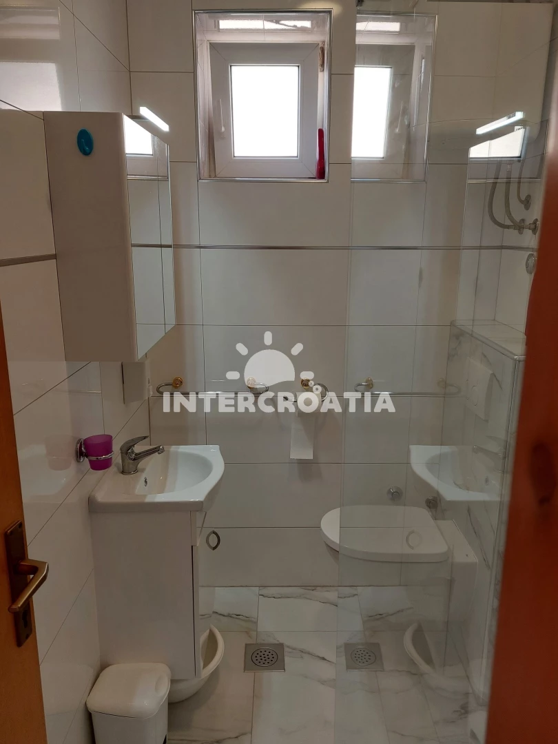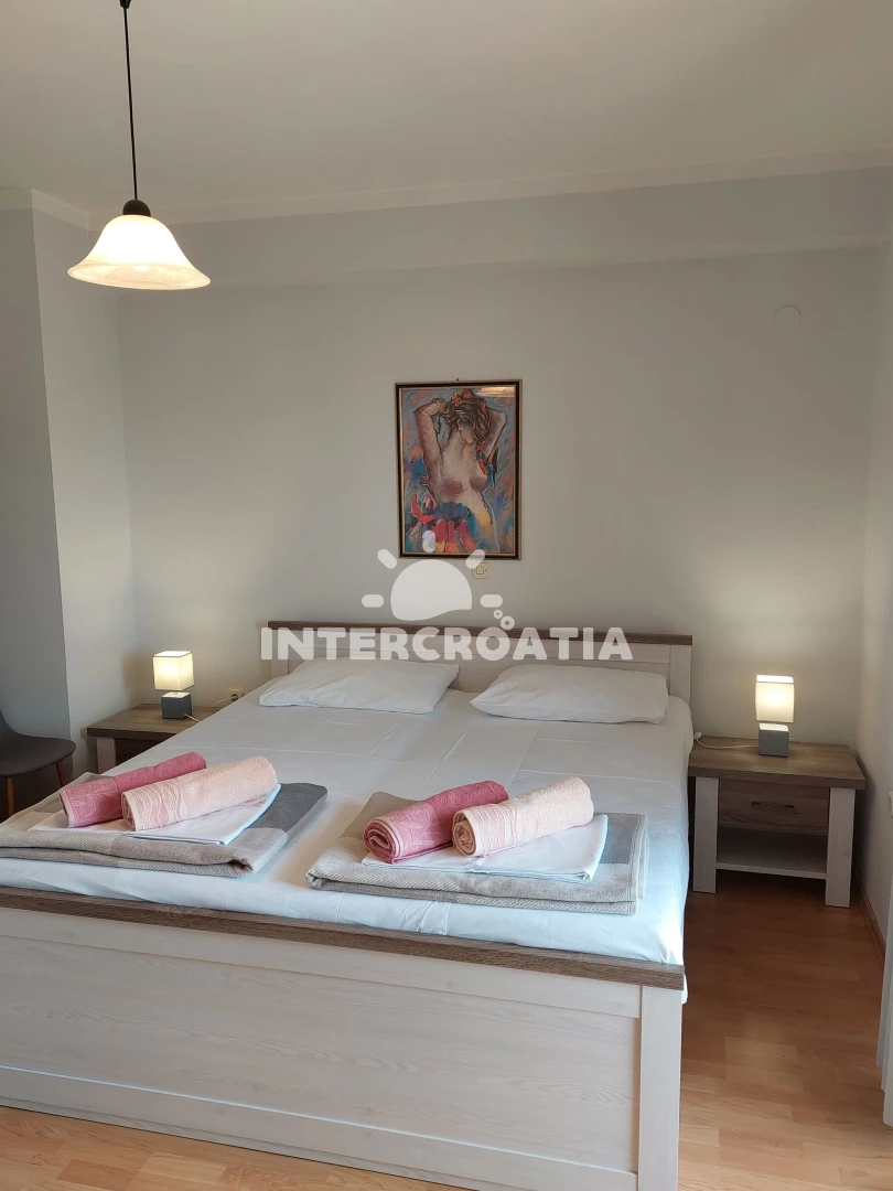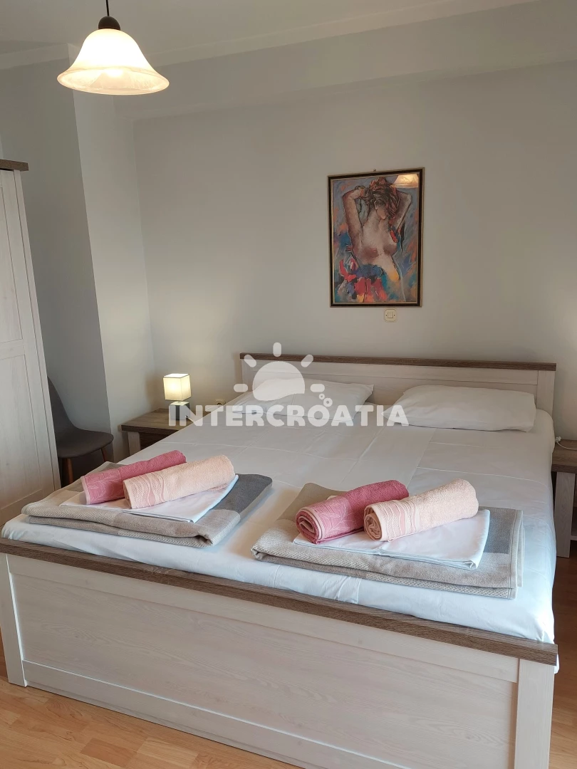 Apartmán (36 m2) s výhledem na moře a klidnou ulici, nachází se v prvním patře domu. Kuchyň je vybavena jídelním stolem pro 3 osoby, kuchyňskou linkou se sporákem, digestoří, rychlovarnou konvicí, kávovarem, nádobím a lednicí s mrazákem. Dále televizí se satelitním programem a vstupem na balkon. Ložnice s dvoulůžkem a vstupem na balkon. Koupelna s vanou, sprchovou zástěnou, umyvadlem a wc. Hostům je k dispozici parkování u objektu zdarma.