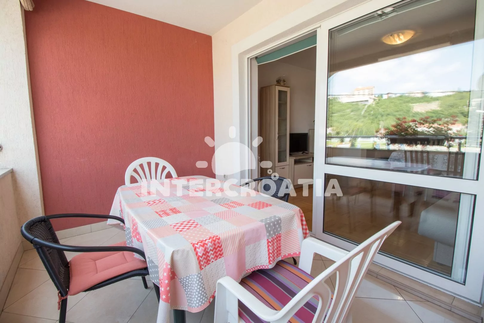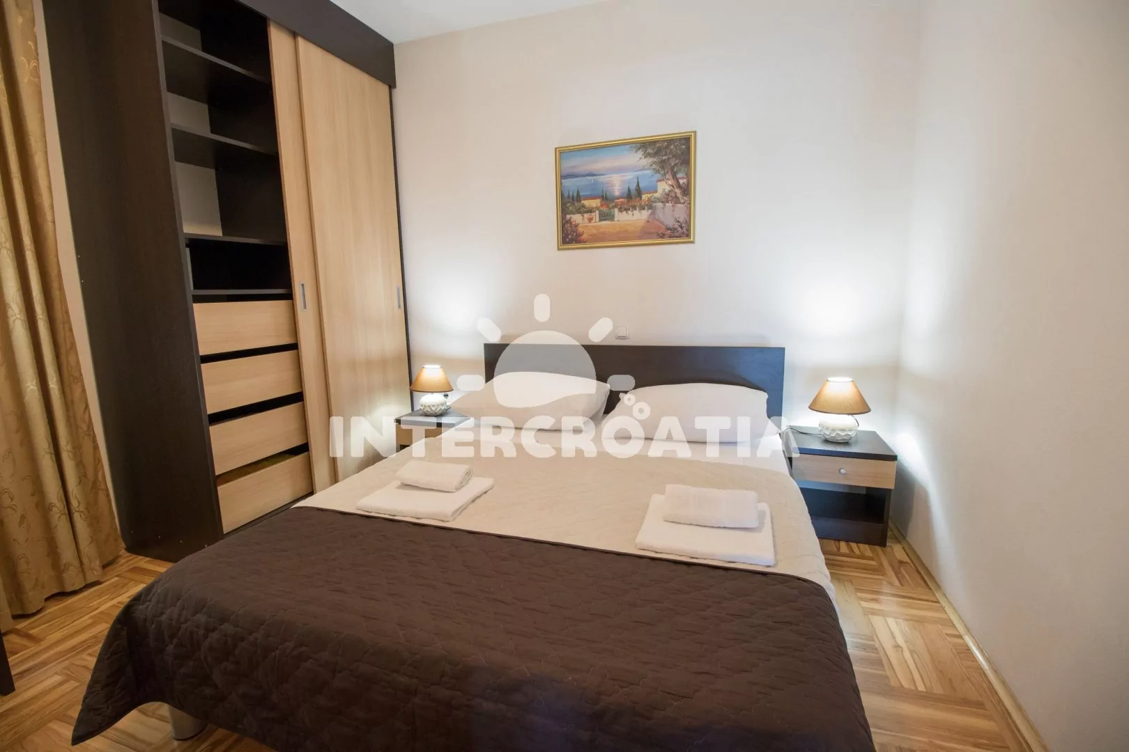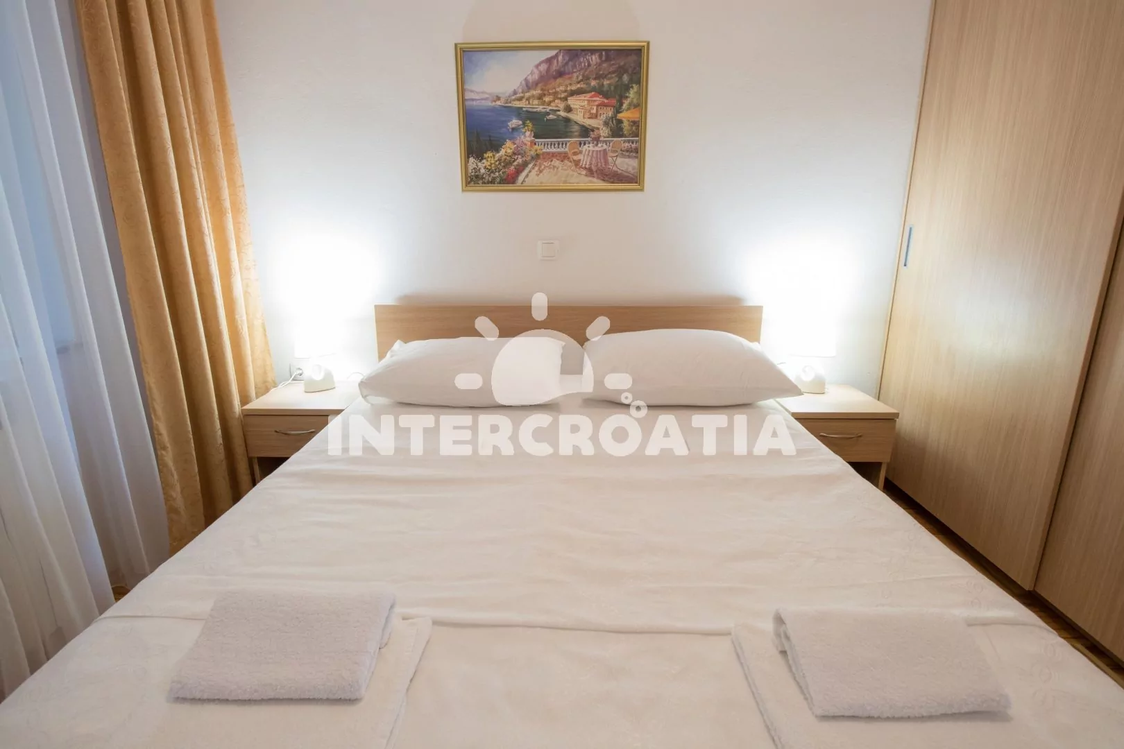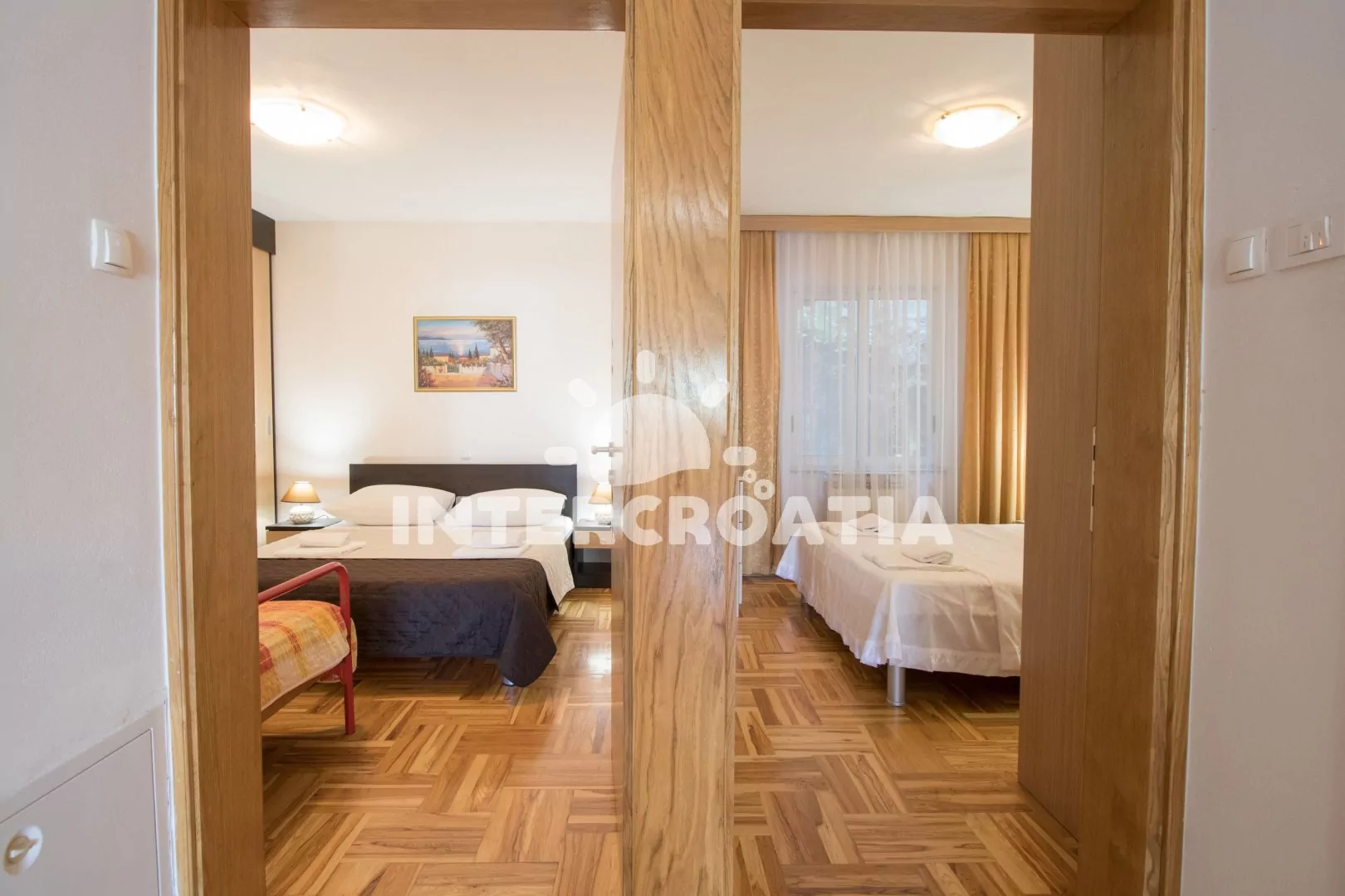 Velmi dobře vybavený apartmán (75 m2), s vlastní terasou a venkovním posezením, nachází se v prvním patře domu a je vhodný pro 4 až 6 osob. Obývací pokoj je spojený s kuchyní. Kuchyňská linka je vybavena sklokeramickou varnou deskou, digestoří, vestavěnou troubou, myčkou na nádobí, mikrovlnnou troubou, rychlovarnou konvicí, kávovarem, nádobím a lednicí s mrazákem. Obývací pokoj s jídelním stolem pro 6 osob, pohovkou (rozložitelná na extra lůžko pro 1 osobu), televizí se satelitním programem, klimatizací a vstupem na terasu. První ložnice s jedním dvoulůžkem. Druhá ložnice s jedním dvoulůžkem, jedním jednolůžkem a sejfem. První koupelna se sprchovým koutem, umyvadlem a wc. Druhá koupelna s vanou, umyvadlem, fénem a wc. Hostům je k dispozici parkování u objektu zdarma.