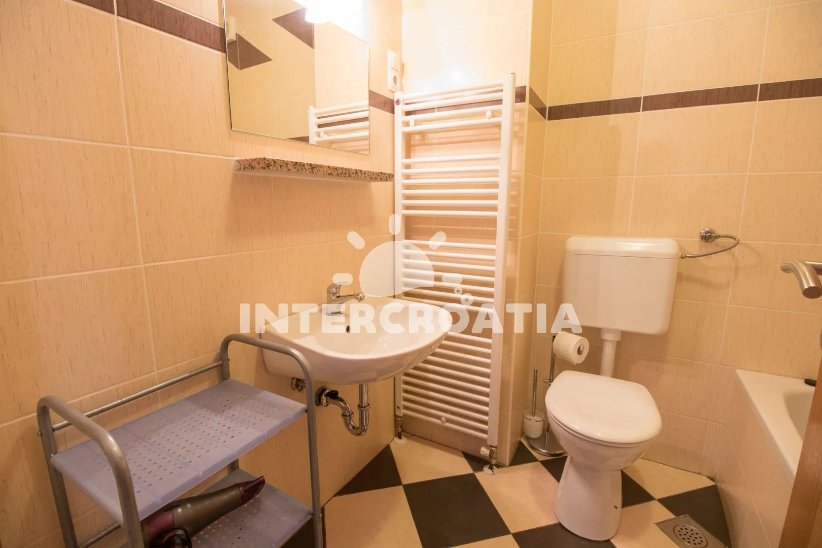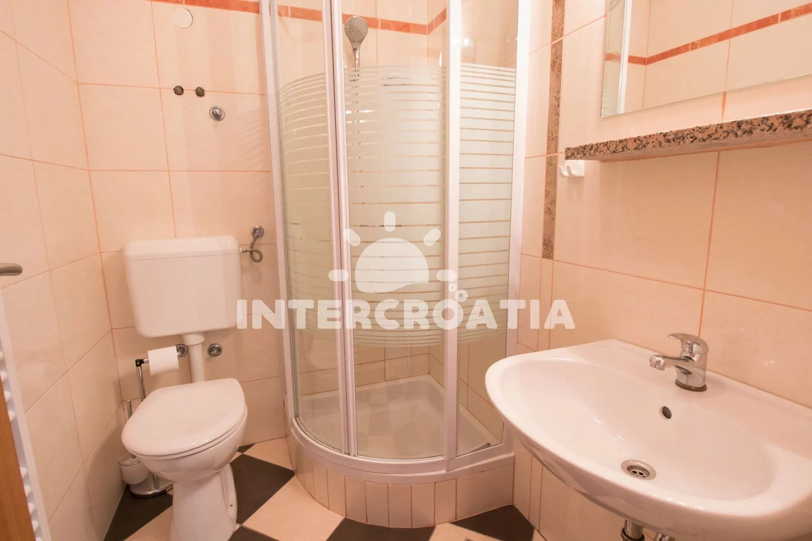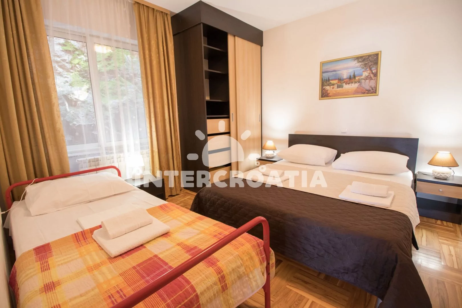 Velmi dobře vybavený apartmán (75 m2), s vlastní terasou a venkovním posezením, nachází se v prvním patře domu a je vhodný pro 4 až 6 osob. Obývací pokoj je spojený s kuchyní. Kuchyňská linka je vybavena sklokeramickou varnou deskou, digestoří, vestavěnou troubou, myčkou na nádobí, mikrovlnnou troubou, rychlovarnou konvicí, kávovarem, nádobím a lednicí s mrazákem. Obývací pokoj s jídelním stolem pro 6 osob, pohovkou (rozložitelná na extra lůžko pro 1 osobu), televizí se satelitním programem, klimatizací a vstupem na terasu. První ložnice s jedním dvoulůžkem. Druhá ložnice s jedním dvoulůžkem, jedním jednolůžkem a sejfem. První koupelna se sprchovým koutem, umyvadlem a wc. Druhá koupelna s vanou, umyvadlem, fénem a wc. Hostům je k dispozici parkování u objektu zdarma.