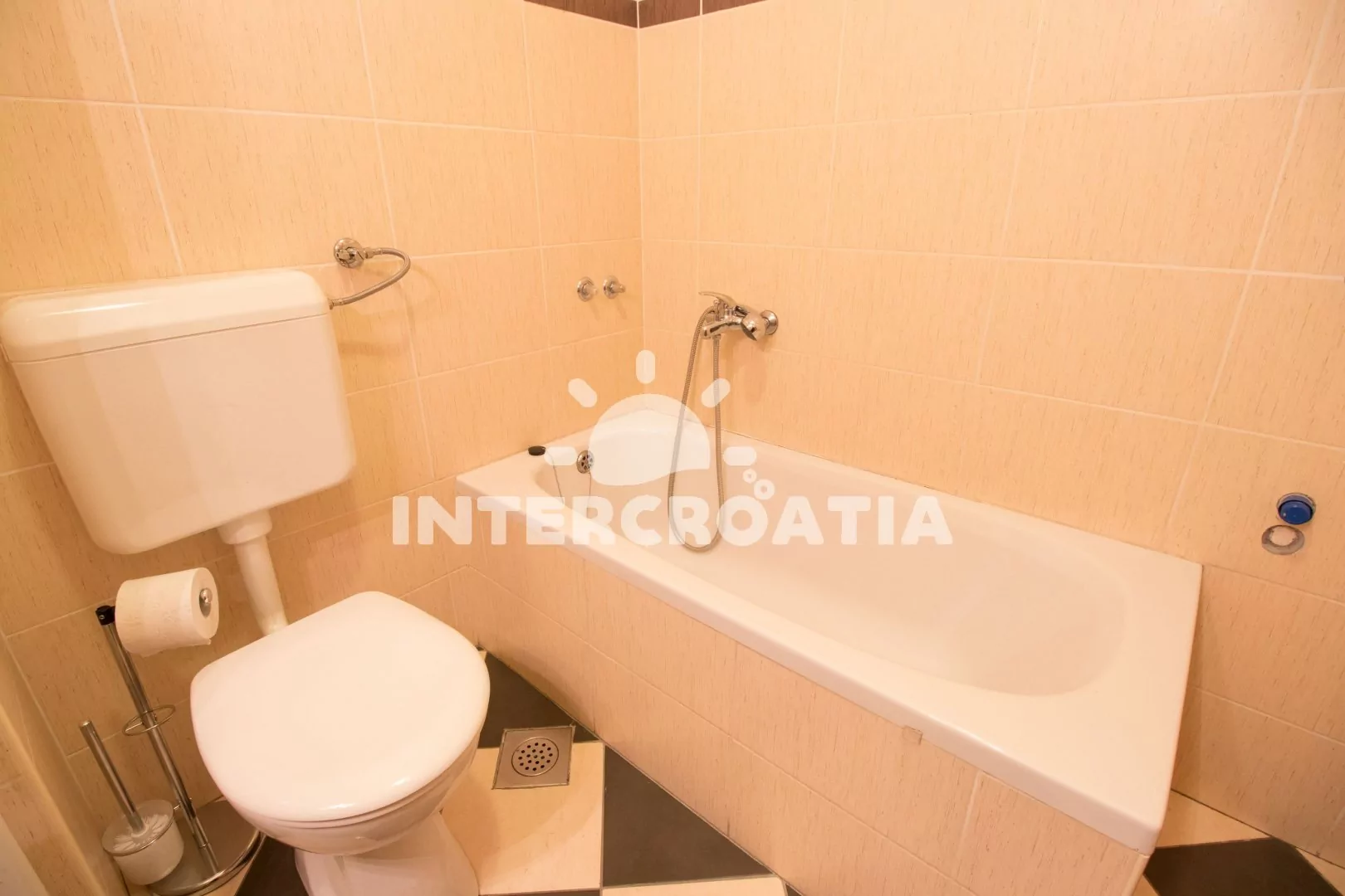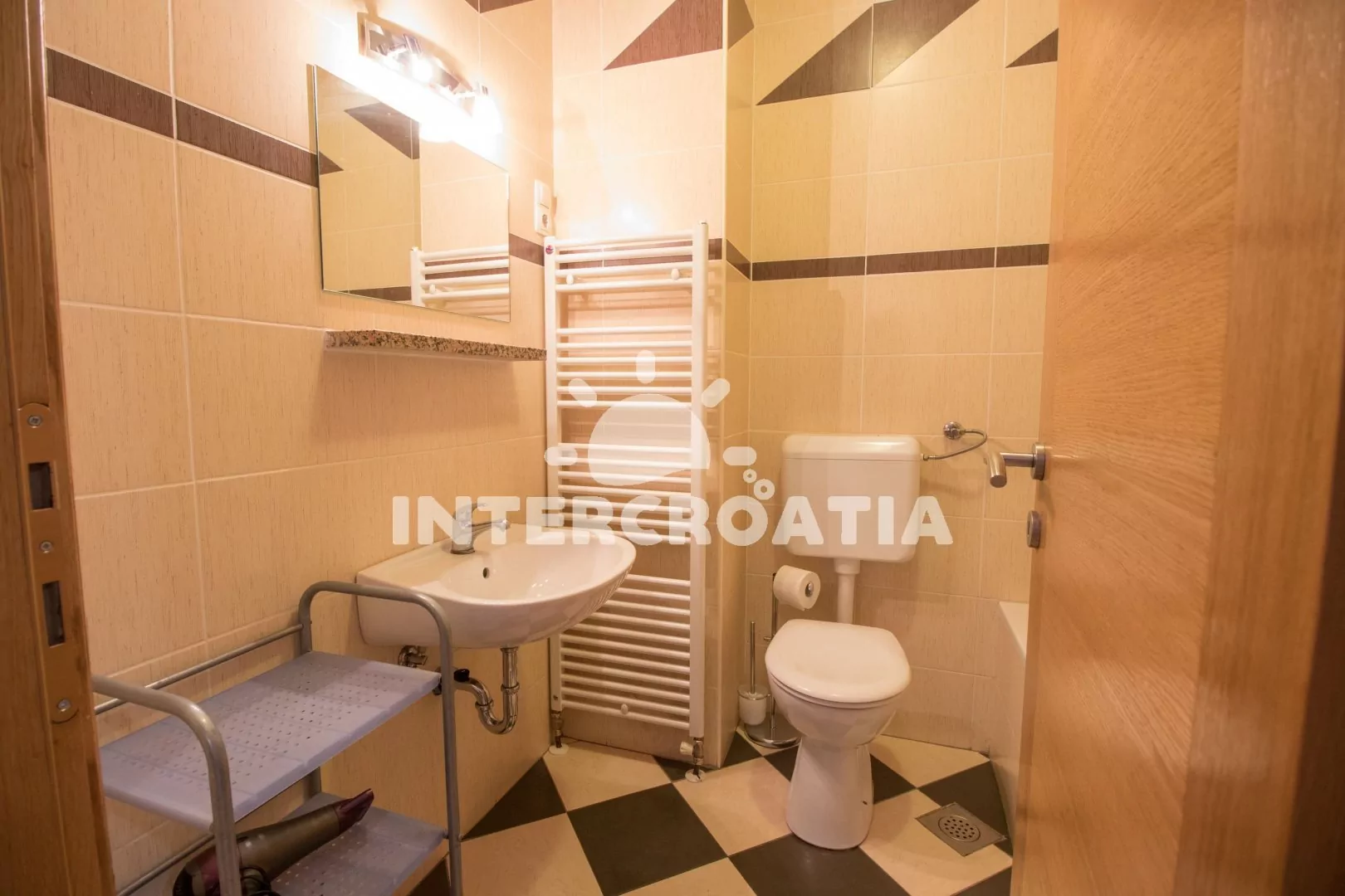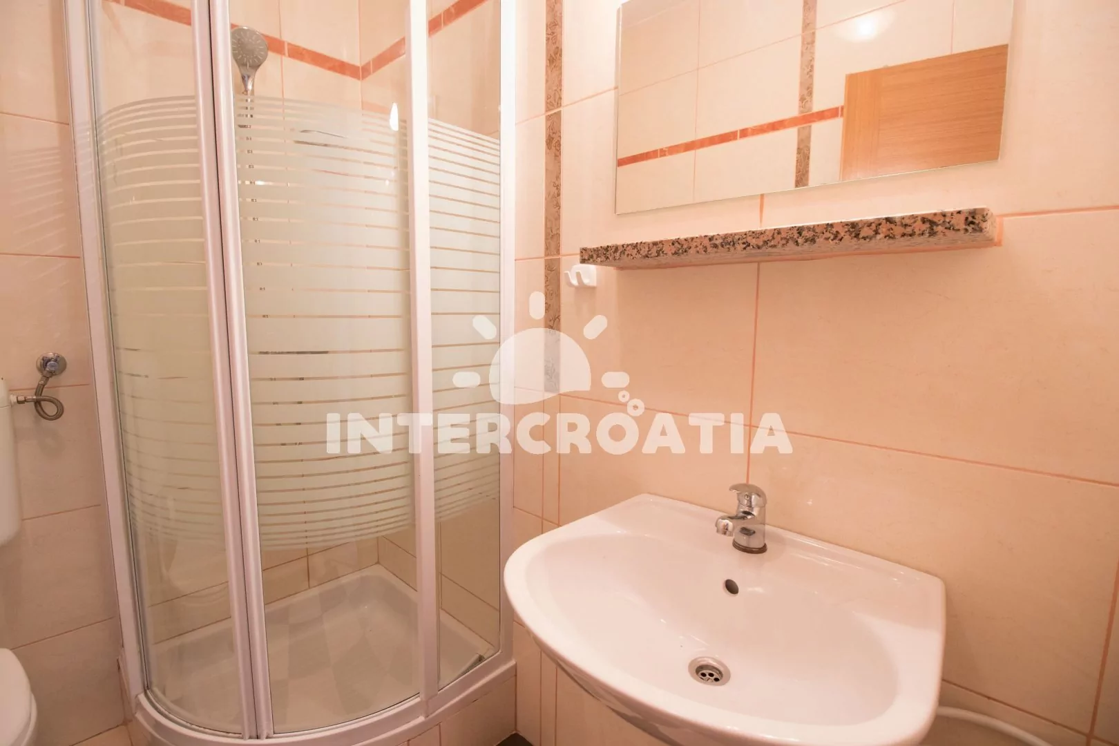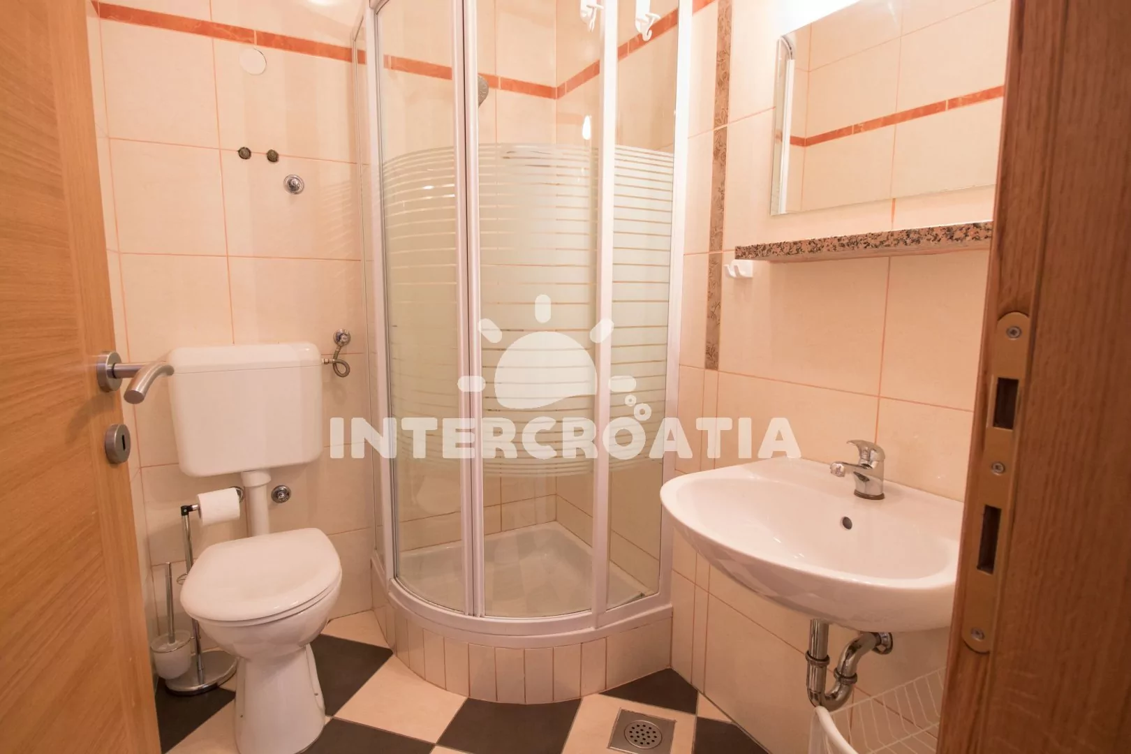 Velmi dobře vybavený apartmán (75 m2), s vlastní terasou a venkovním posezením, nachází se v prvním patře domu a je vhodný pro 4 až 6 osob. Obývací pokoj je spojený s kuchyní. Kuchyňská linka je vybavena sklokeramickou varnou deskou, digestoří, vestavěnou troubou, myčkou na nádobí, mikrovlnnou troubou, rychlovarnou konvicí, kávovarem, nádobím a lednicí s mrazákem. Obývací pokoj s jídelním stolem pro 6 osob, pohovkou (rozložitelná na extra lůžko pro 1 osobu), televizí se satelitním programem, klimatizací a vstupem na terasu. První ložnice s jedním dvoulůžkem. Druhá ložnice s jedním dvoulůžkem, jedním jednolůžkem a sejfem. První koupelna se sprchovým koutem, umyvadlem a wc. Druhá koupelna s vanou, umyvadlem, fénem a wc. Hostům je k dispozici parkování u objektu zdarma.
