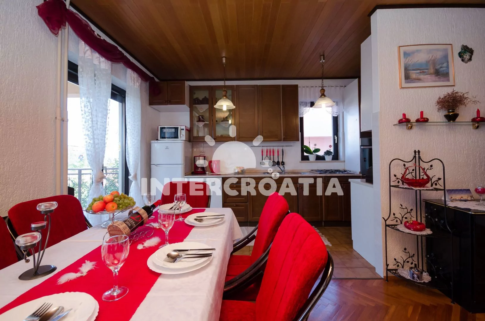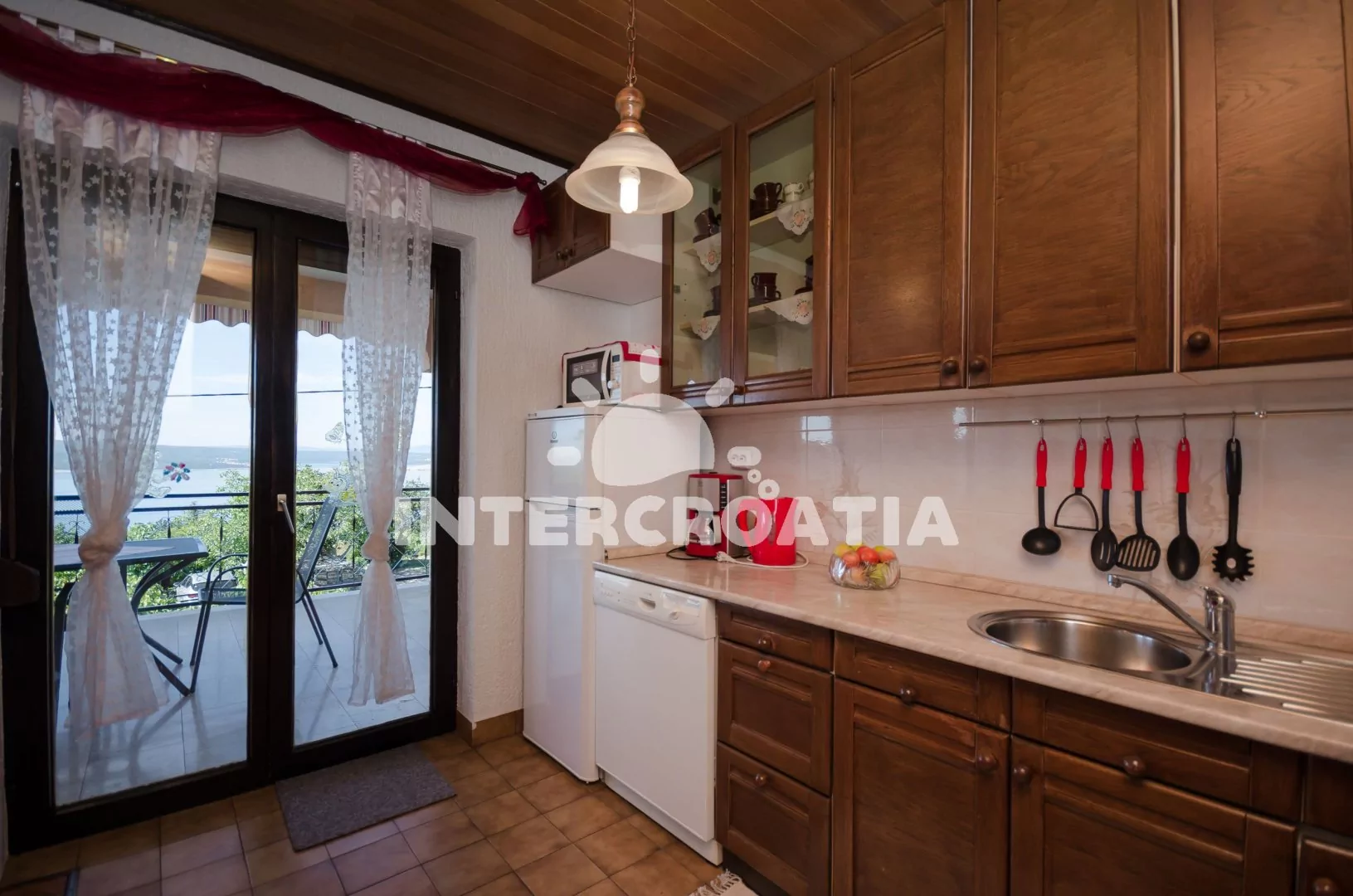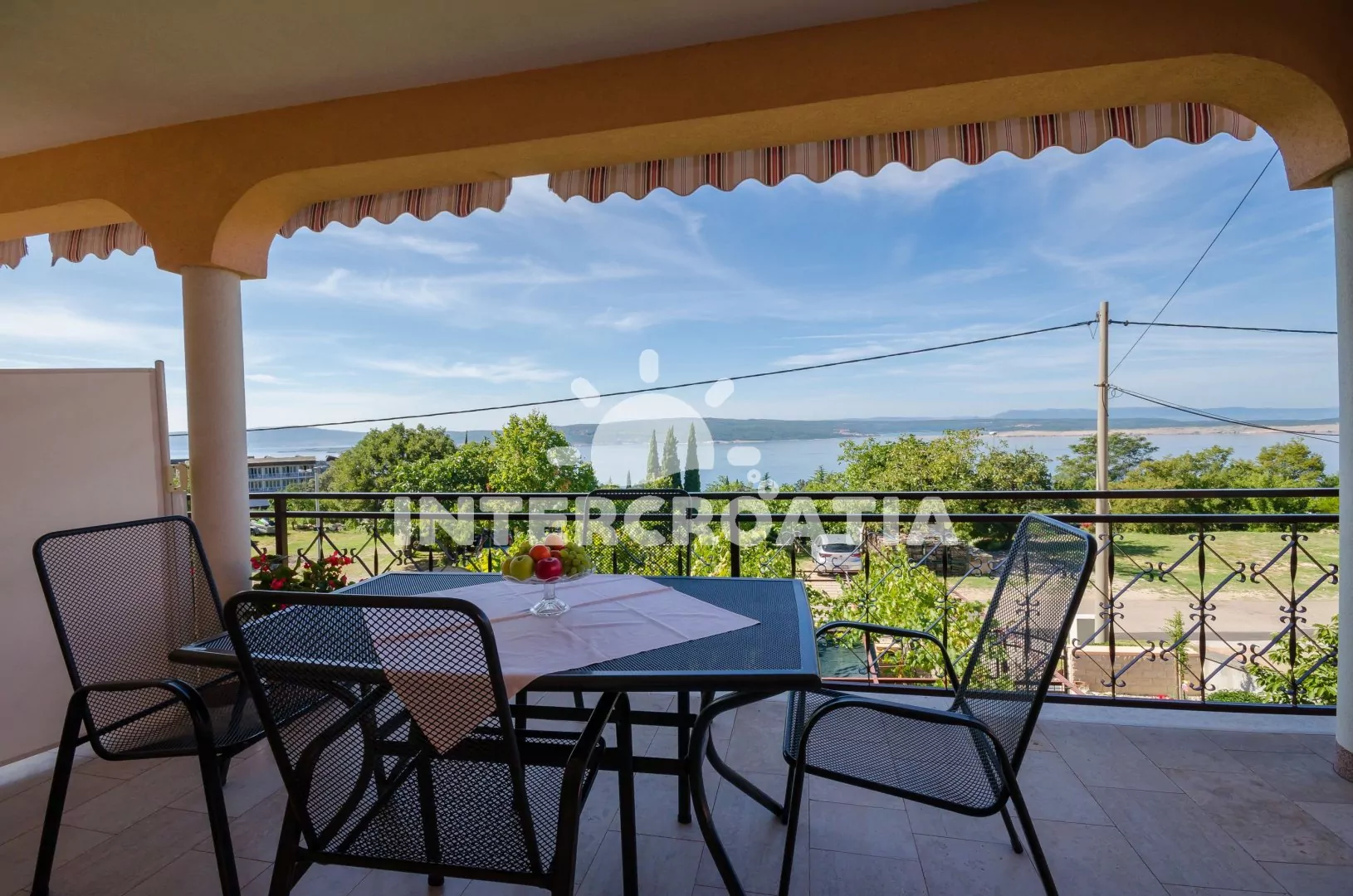 Dvoupokojový apartmán v prvním patře domu s vlastní terasou a výhledem na moře je vhodný pro 2 až 4 osoby. Obývací pokoj je spojený s kuchyní. Kuchyňská linka je vybavena sporákem, troubou, mikrovlnnou troubou, myčkou na nádobí, kávovarem, rychlovarnou konvicí, toustovačem, nádobím a lednicí s mrazákem. Obývací pokoj s jídelním stolem pro 6 osob, sedací soupravou, pohovkou (rozložitelná na extra lůžko pro 2 osoby), televizí se satelitním programem, klimatizací a vstupem na terasu. Ložnice je vybavena jedním dvoulůžkem. Koupelna s vanou, sprchou, umyvadlem, fénem a wc. Hostům je k dispozici parkování u objektu zdarma.